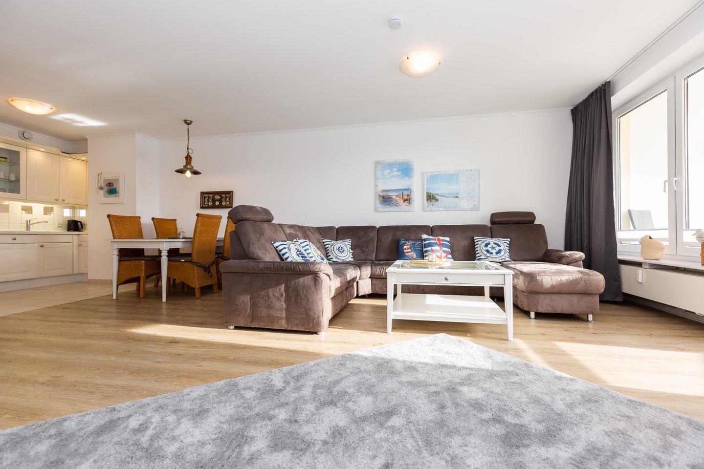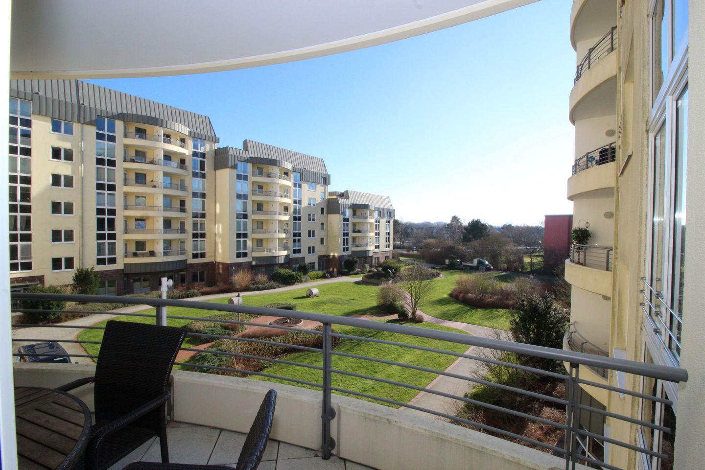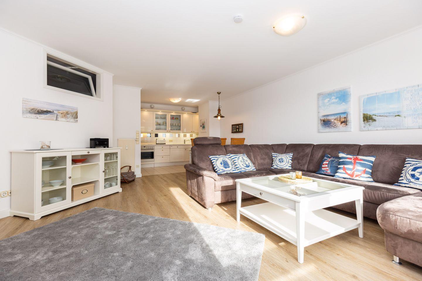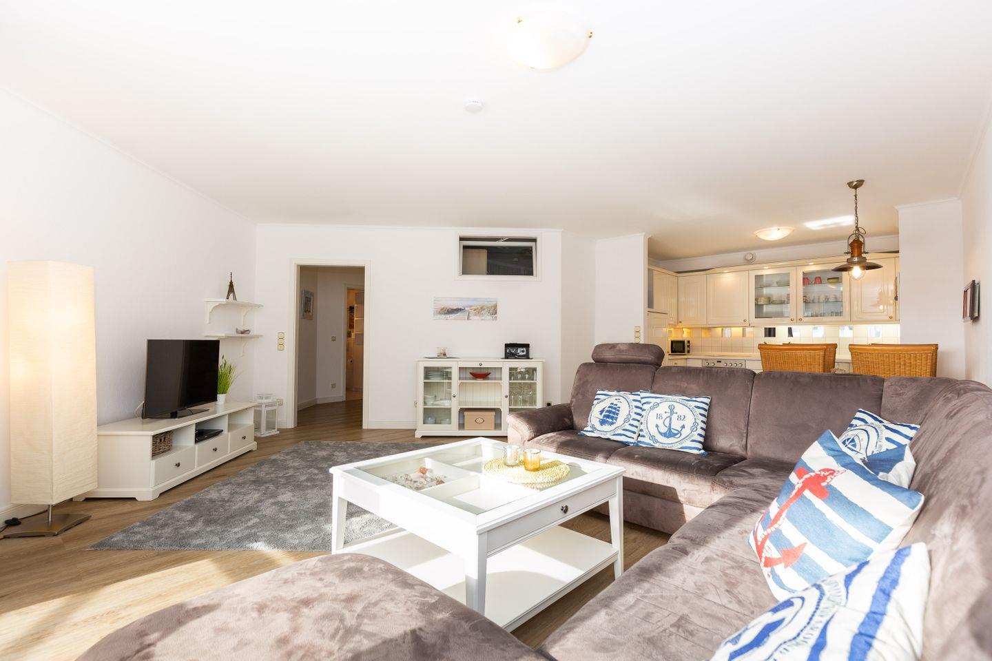 Haus "Kurpark-Residenz", Typ D2, App.-Nr. "226", bis 4 Personen, 2. OG, Ostseite ("Parkseite"), ca. 84 m² Größe, Wohnzimmer, sep. Schlafzimmer mit Doppelbett, 2. TV-Gerät und Babybett hinter Sichtschutz, sep. Kinderzimmer (innenliegend) mit Etagenbett (190 x 90 cm) mit hohem Einstieg (auch für Erwachsene geeignet), Küchenzeile mit 4er-Ceranfeld, Mikrowelle, Backofen und Geschirrspüler, Bosch-Tassimo-Kaffeemaschine, Bad mit Dusche, WC und Badewanne, Loggia, SAT-TV mit Flachbildschirm , kostenl. W-Lan Zugang im App., Radio mit USB-, SD- und AUX-Eingang, Nichtraucherwohnung, Tiefgaragenstellplatz, Haustiere sind nicht gestattet, Strandkorb im Sommer 2026.