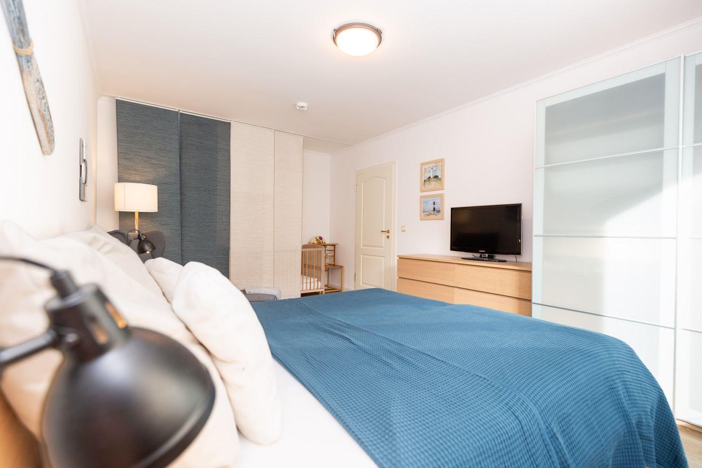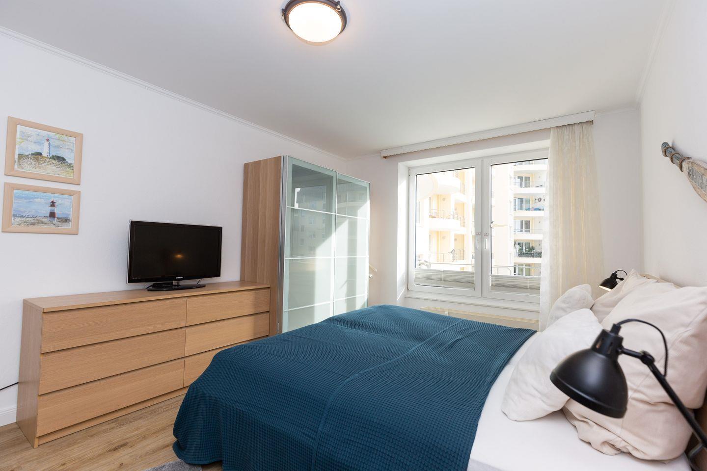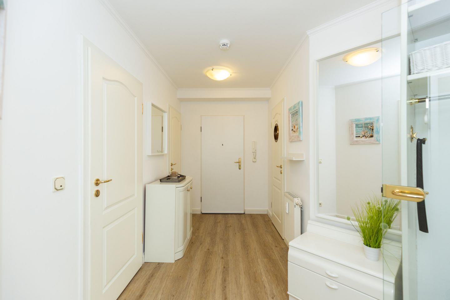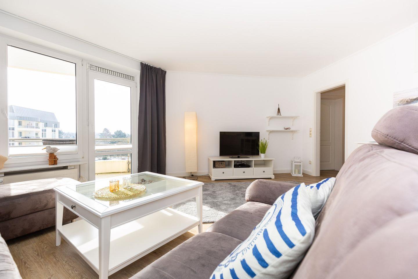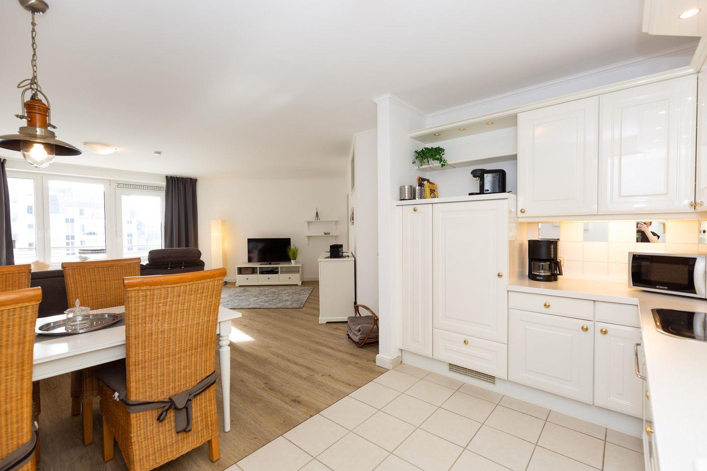 Haus "Kurpark-Residenz", Typ D2, App.-Nr. "226", bis 4 Personen, 2. OG, Ostseite ("Parkseite"), ca. 84 m² Größe, Wohnzimmer, sep. Schlafzimmer mit Doppelbett, 2. TV-Gerät und Babybett hinter Sichtschutz, sep. Kinderzimmer (innenliegend) mit Etagenbett (190 x 90 cm) mit hohem Einstieg (auch für Erwachsene geeignet), Küchenzeile mit 4er-Ceranfeld, Mikrowelle, Backofen und Geschirrspüler, Bosch-Tassimo-Kaffeemaschine, Bad mit Dusche, WC und Badewanne, Loggia, SAT-TV mit Flachbildschirm , kostenl. W-Lan Zugang im App., Radio mit USB-, SD- und AUX-Eingang, Nichtraucherwohnung, Tiefgaragenstellplatz, Haustiere sind nicht gestattet, Strandkorb im Sommer 2026.