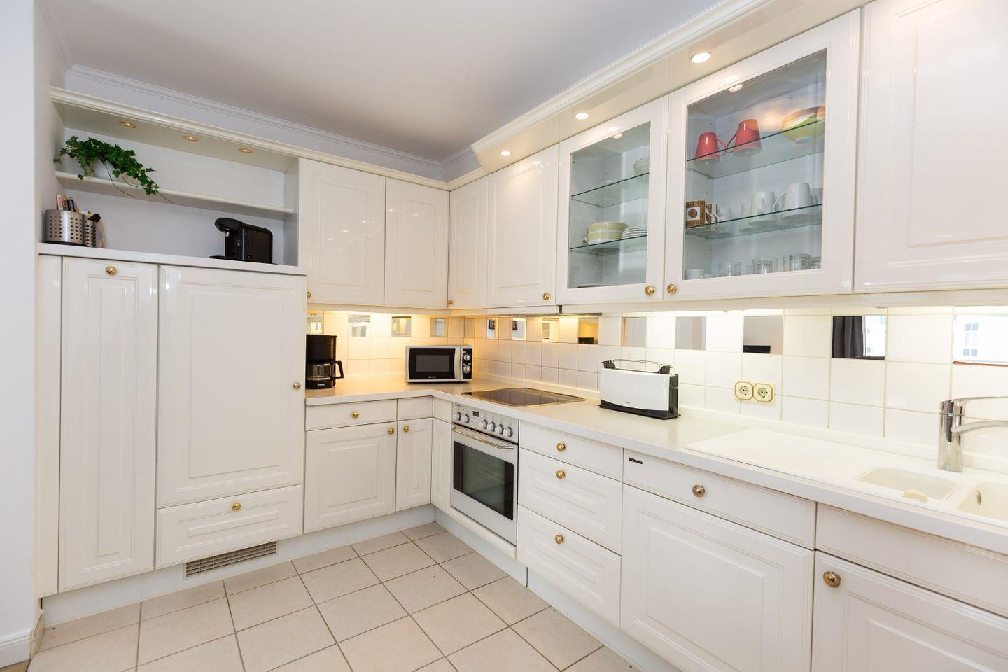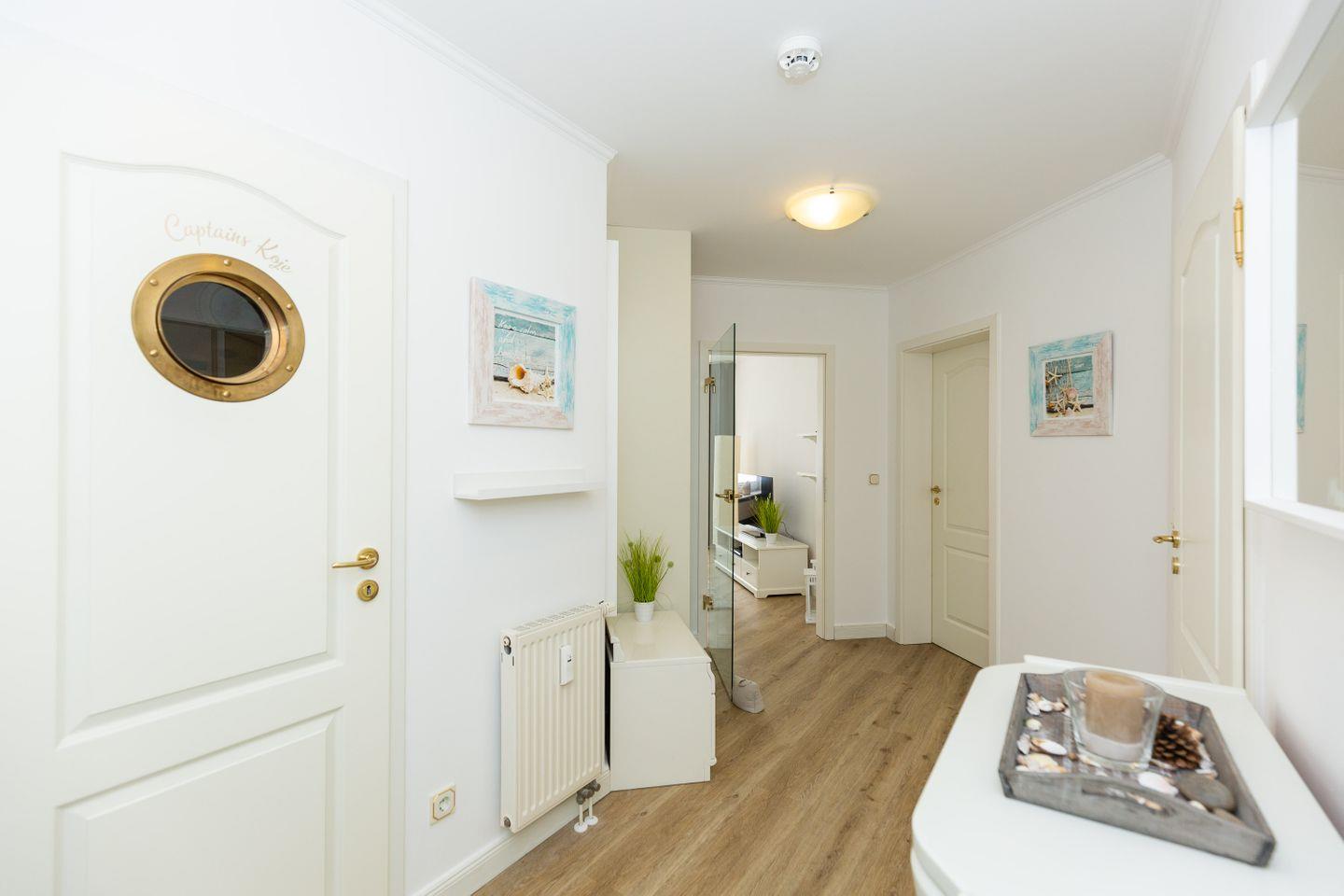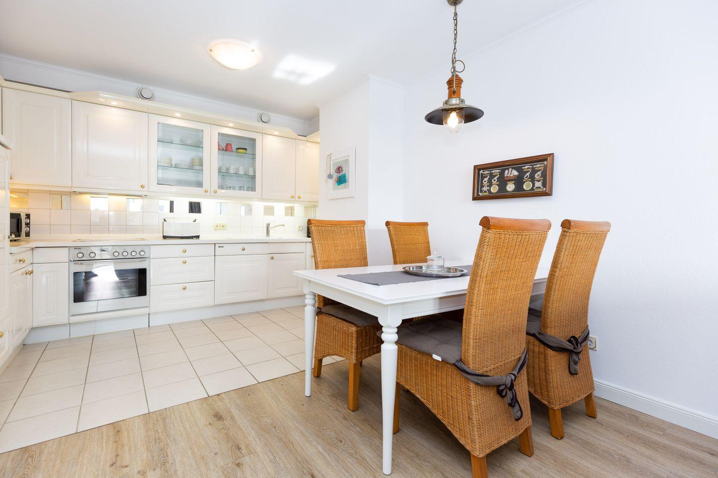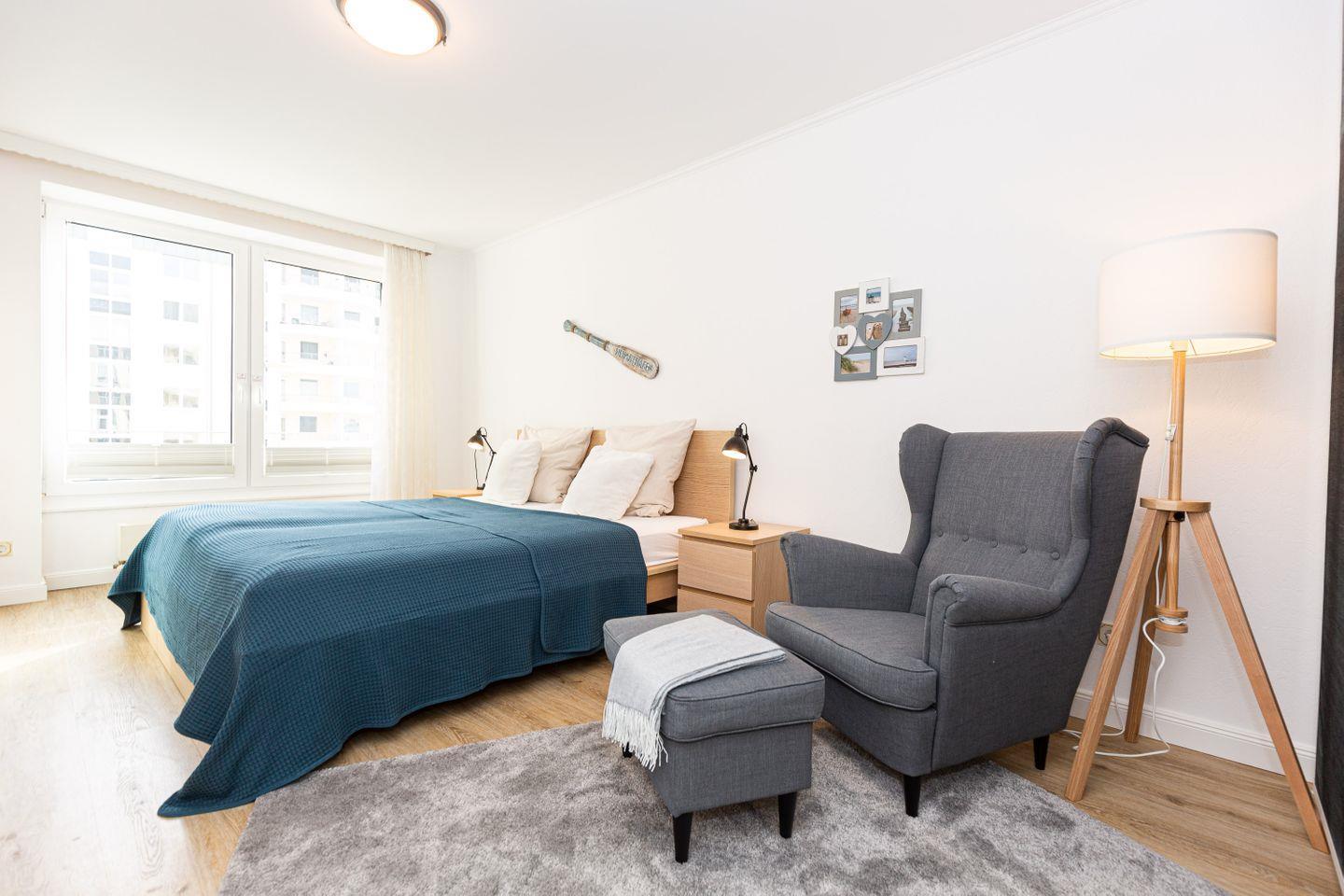 Haus "Kurpark-Residenz", Typ D2, App.-Nr. "226", bis 4 Personen, 2. OG, Ostseite ("Parkseite"), ca. 84 m² Größe, Wohnzimmer, sep. Schlafzimmer mit Doppelbett, 2. TV-Gerät und Babybett hinter Sichtschutz, sep. Kinderzimmer (innenliegend) mit Etagenbett (190 x 90 cm) mit hohem Einstieg (auch für Erwachsene geeignet), Küchenzeile mit 4er-Ceranfeld, Mikrowelle, Backofen und Geschirrspüler, Bosch-Tassimo-Kaffeemaschine, Bad mit Dusche, WC und Badewanne, Loggia, SAT-TV mit Flachbildschirm , kostenl. W-Lan Zugang im App., Radio mit USB-, SD- und AUX-Eingang, Nichtraucherwohnung, Tiefgaragenstellplatz, Haustiere sind nicht gestattet, Strandkorb im Sommer 2026.
