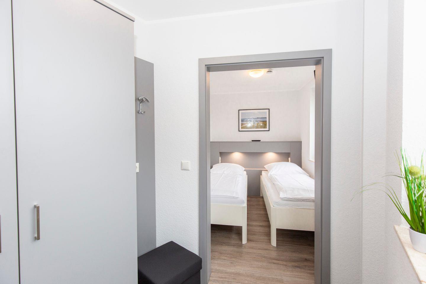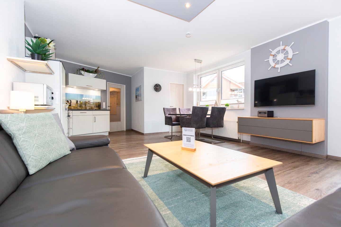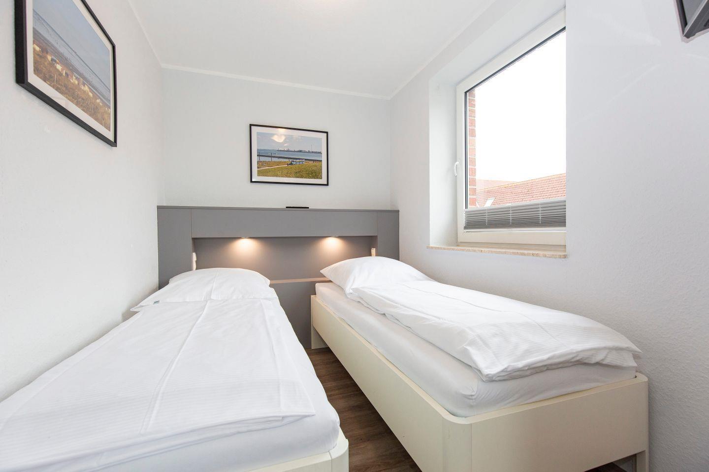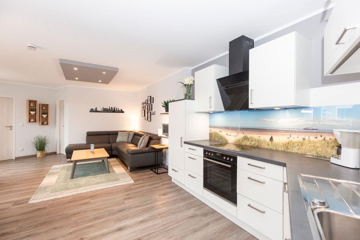 Haus "Lord Nelson", Typ 6, Appartement-Nr. "210", bis 4 Personen, 2. Etage, ca. 66 qm Größe, Südseite (ohne Meerblick, Richtung Trafalgar), Schlafzimmer mit Doppelbett, 2. Schlafzimmer mit 2 Einzelbetten, Wohnbereich mit integrierter Küche (Induktion mit 4 Kochfelder, Geschirrspüler und Mikrowelle, Dusche/WC, Balkon (Südseite), Flachbildschirm, kostenl. W-Lan Zugang im App. mit eigenem Router, Stellplatz in der Tiefgarage, Strandkorb im Sommer 2025, Nichtraucherwohnung, Haustiere sind nicht gestattet,