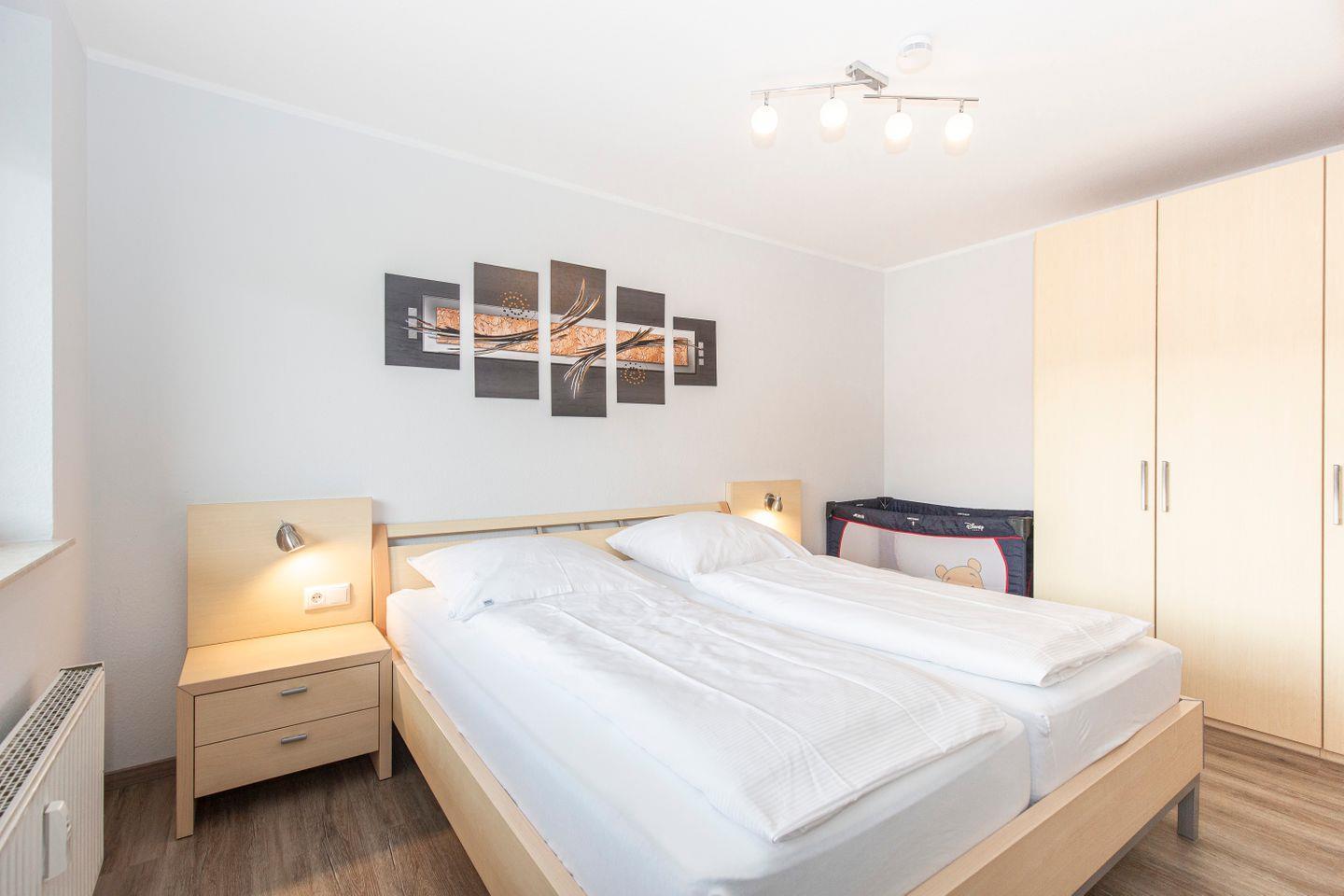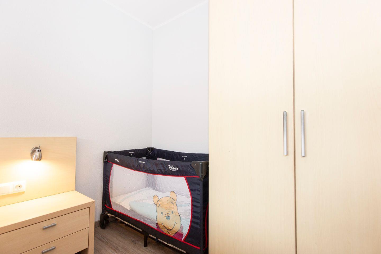 Das abgebildete Kinderbett kann gegen Gebühr dazu gebucht werden. Ebenso ein Kinder-Hochstuhl.