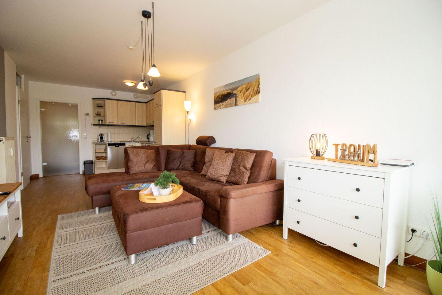 Die Ferienwohnung punktet mit einem unschlagbaren Wellnessangebot. In der Kurpark-Residenz können unsere Urlaubsgäste kostenlos das hauseigene Schwimmbad und die Sauna nutzen. Für Fragen stehen unsere Mitarbeiter täglich an der Rezeption des Hauses zur Verfügung. In den Sommermonaten 2026 gehört außerdem ein eigener Strandkorb zu dieser Ferienwohnung. Ein Parkplatz in der Tiefgarage ist ebenfalls im Preis enthalten.