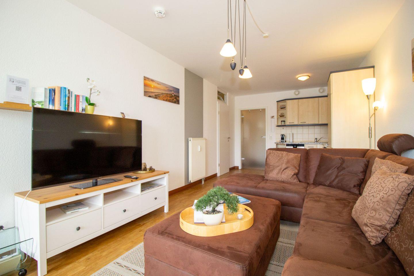 Haus "Kurpark-Residenz", Typ B, App.-Nr. "141", bis 4 Personen, 1. OG, Nord/Ostseite (Richtung "Kugelbake"), ca. 50 m² Größe, Wohn-/Essbereich (Schlafsofa bis zu zwei Kindern) mit offener Küche, separates Schlafzimmer mit Doppelbett (innenliegend), Dusche/WC, SAT-TV, Tiefgaragenstellplatz, Strandkorb im Sommer 2026, ohne Loggia, Haustiere sind nicht gestattet.