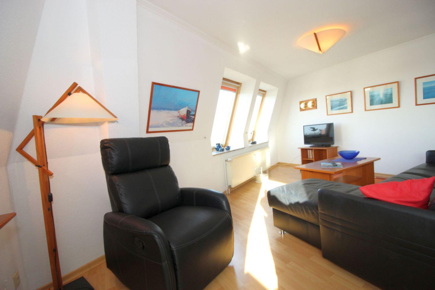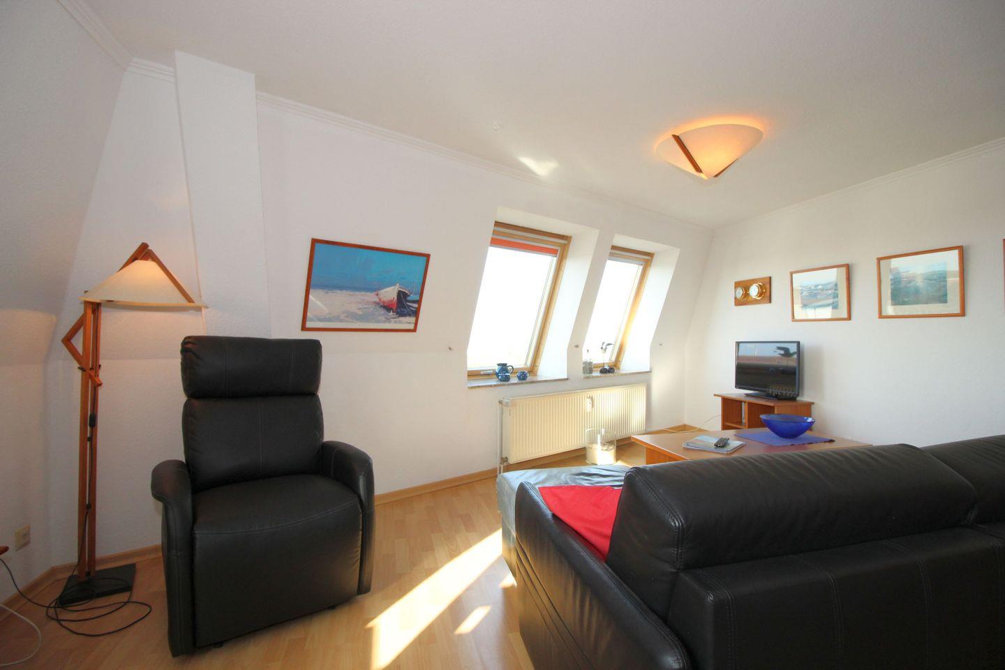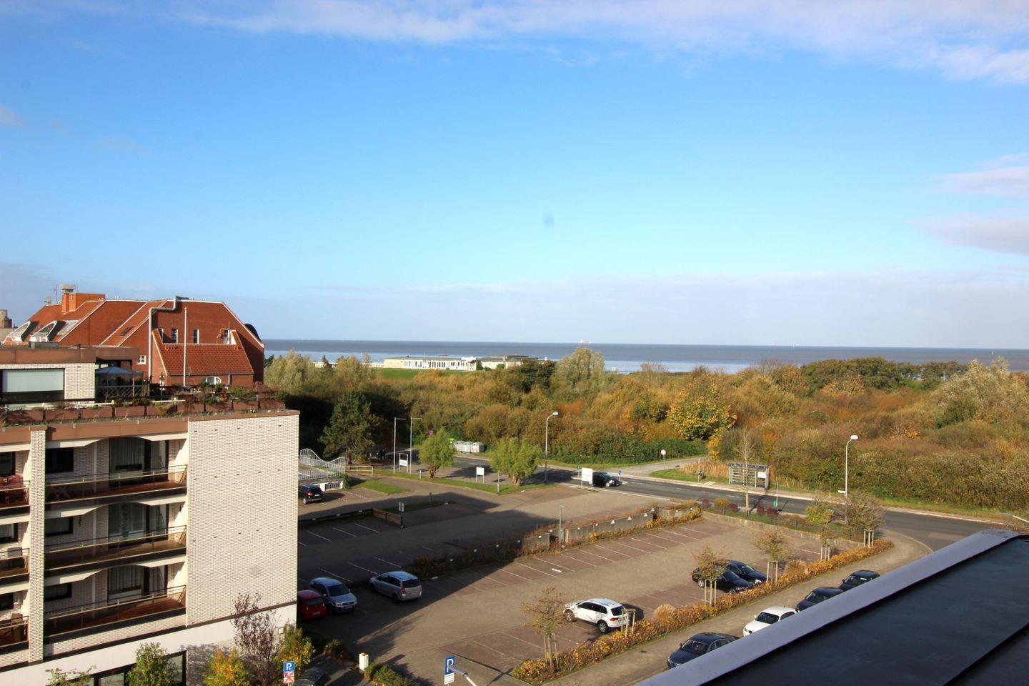 Haus "Trafalgar", Typ B, App.-Nr. 527, 5. Etage, ((Aufzug bis zur 4. Etage, links den Gang bis zum Ende - Tür 427 öffnen, dann Vorflur innen eigene Treppe rechts) bis 4 Pers., ca. 50 qm, Westseite (Meerblick), ohne Balkon, Wohn- Schlafraum mit Schlafcouch, sep. Schlafzimmer mit Doppelbett, Küchenzeile mit Ceranfeld, Geschirrspüler & Mikrowelle, Bad mit Dusche/WC, Kabel-TV, W-Lan im App, Haustiere sind nicht gestattet, Nichtraucher-Appartement, Tiefgaragenstellplatz, Strandkorb im Sommer 2026.