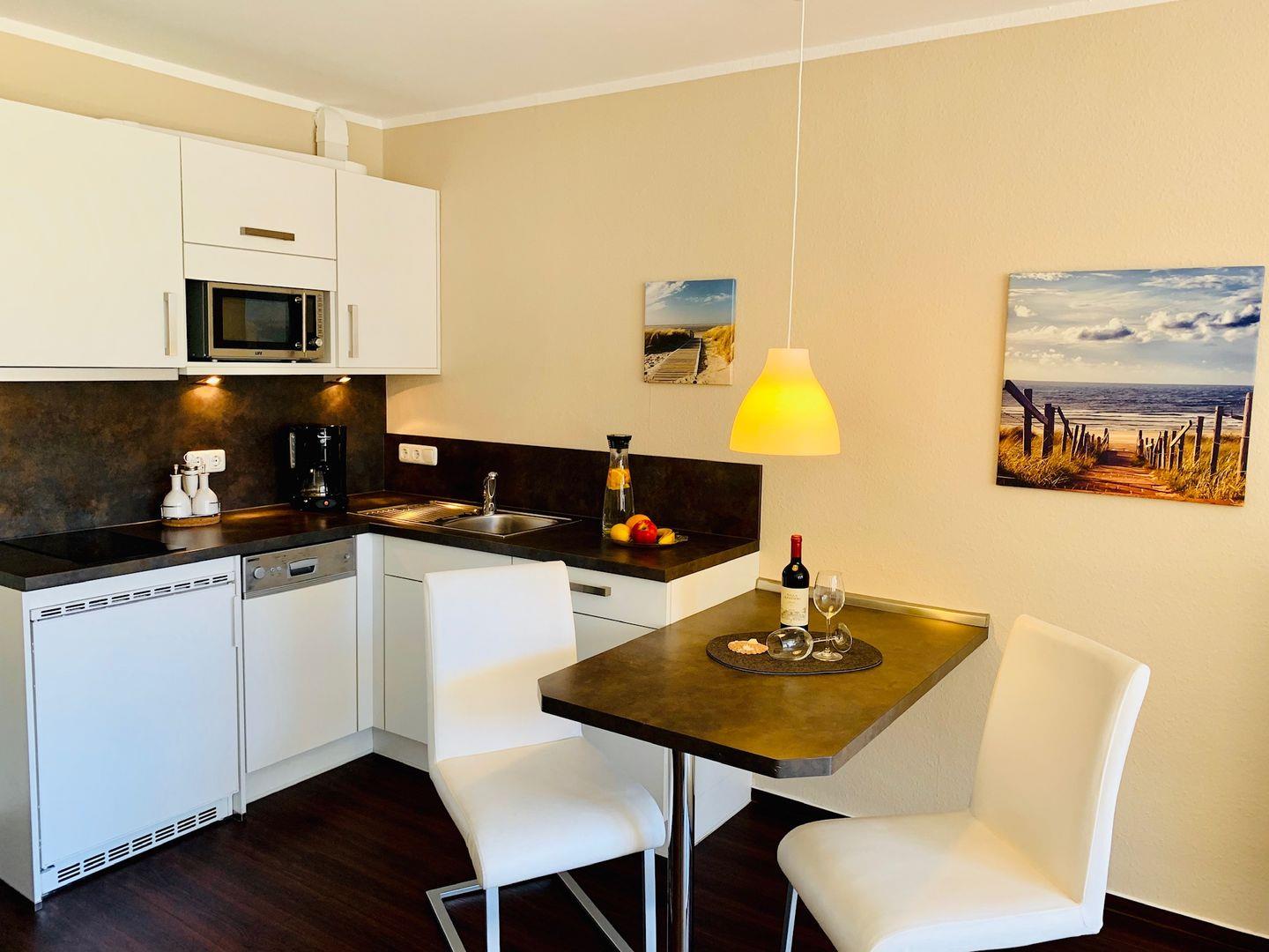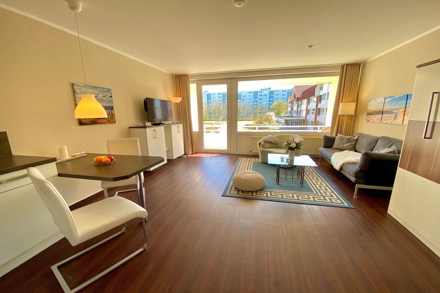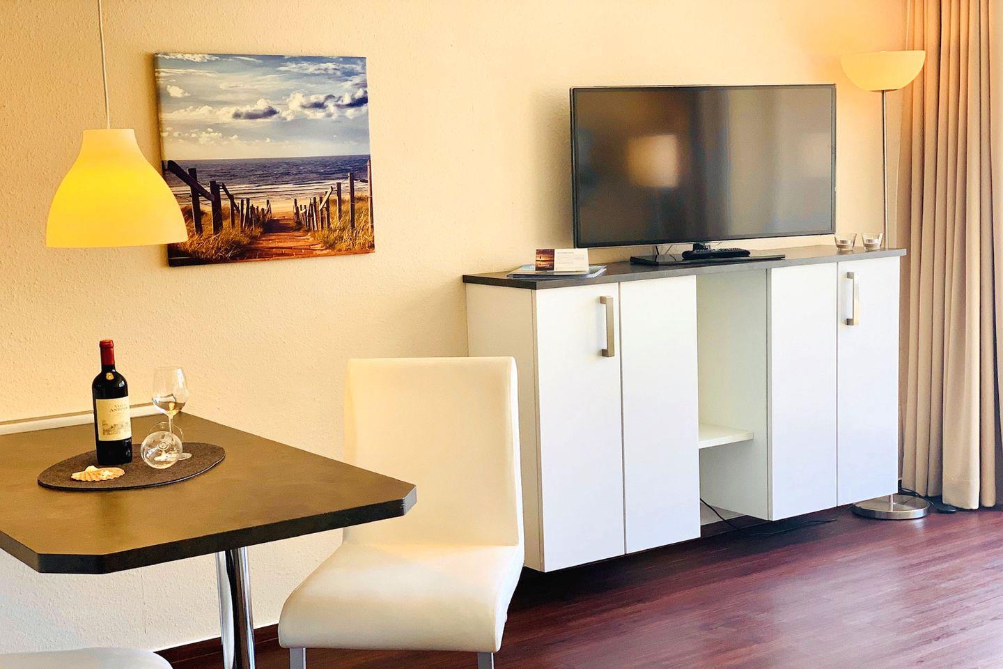 Haus "Trafalgar", Typ A-Ost, App.-Nr. 131, bis 2 Pers., 1. Etage, ca. 34 qm, Ostseite (ohne Meerblick), Wohn/Schlafbereich mit Schrankbett (einzeln klappbar), Küchenzeile mit Geschirrspüler, 2-Platten-Ceranfeld und Mikrowelle, Dusche/WC, Balkon, Kabel-TV, Tiefgaragenstellplatz, Nichtraucherwohnung, Haustiere sind nicht gestattet, WLAN-Zugang im App., ab 5 Übernachtungen 1 Wäschepaket p.P. inkl.