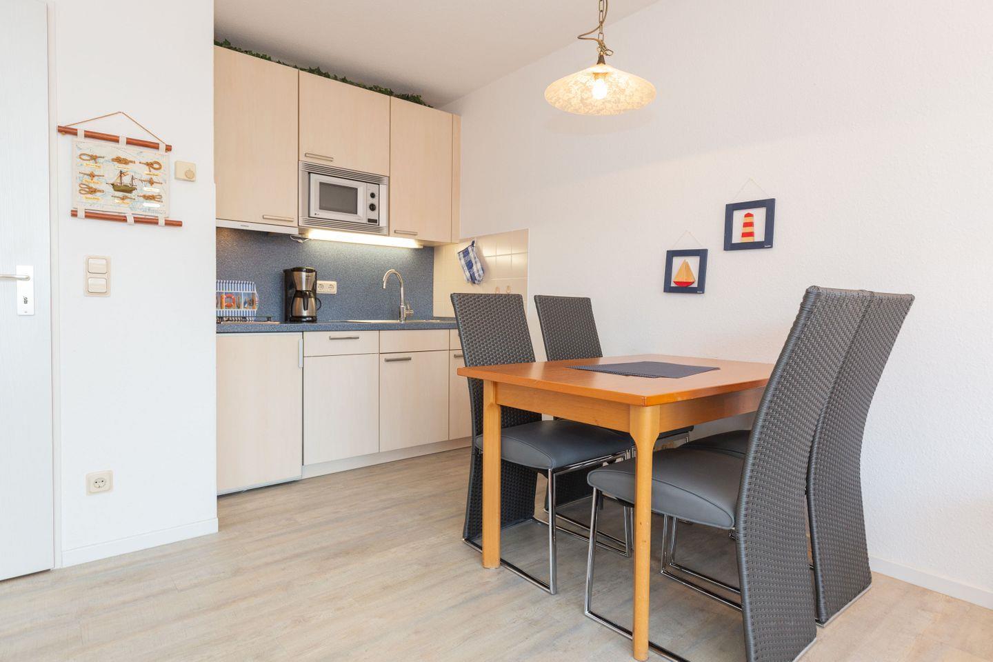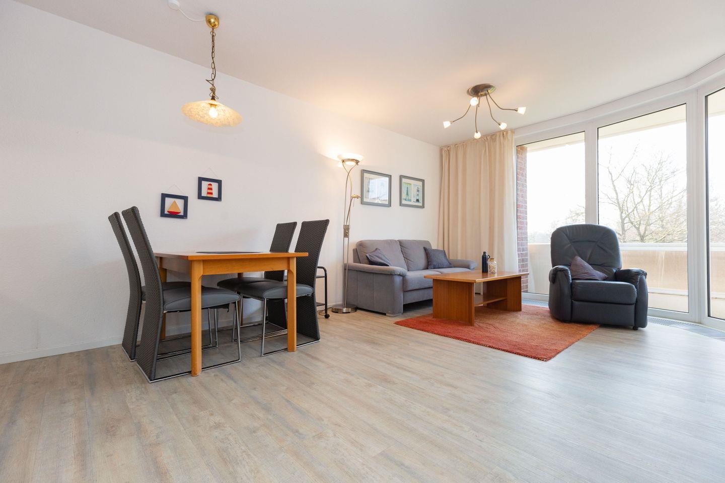 Haus "Trafalgar", Typ B, Appartement-Nr. 142, bis 2 Pers., 1.Etage, ca. 46 qm, Südseite (ohne Meerblick), Wohnzimmer mit Fernsehsessel, Schlafzimmer mit Doppelbett inklusive verstellbarer Lattenroste, Küchenzeile mit Geschirrspüler und Mikrowelle, Dusche/WC, Balkon, Kabel-TV, Telefon, kostenl. WLAN-Zugang im App., Haustiere sind nicht gestattet, Nichtraucherwohnung, Tiefgaragenstellplatz, Strandkorb im Sommer 2026.