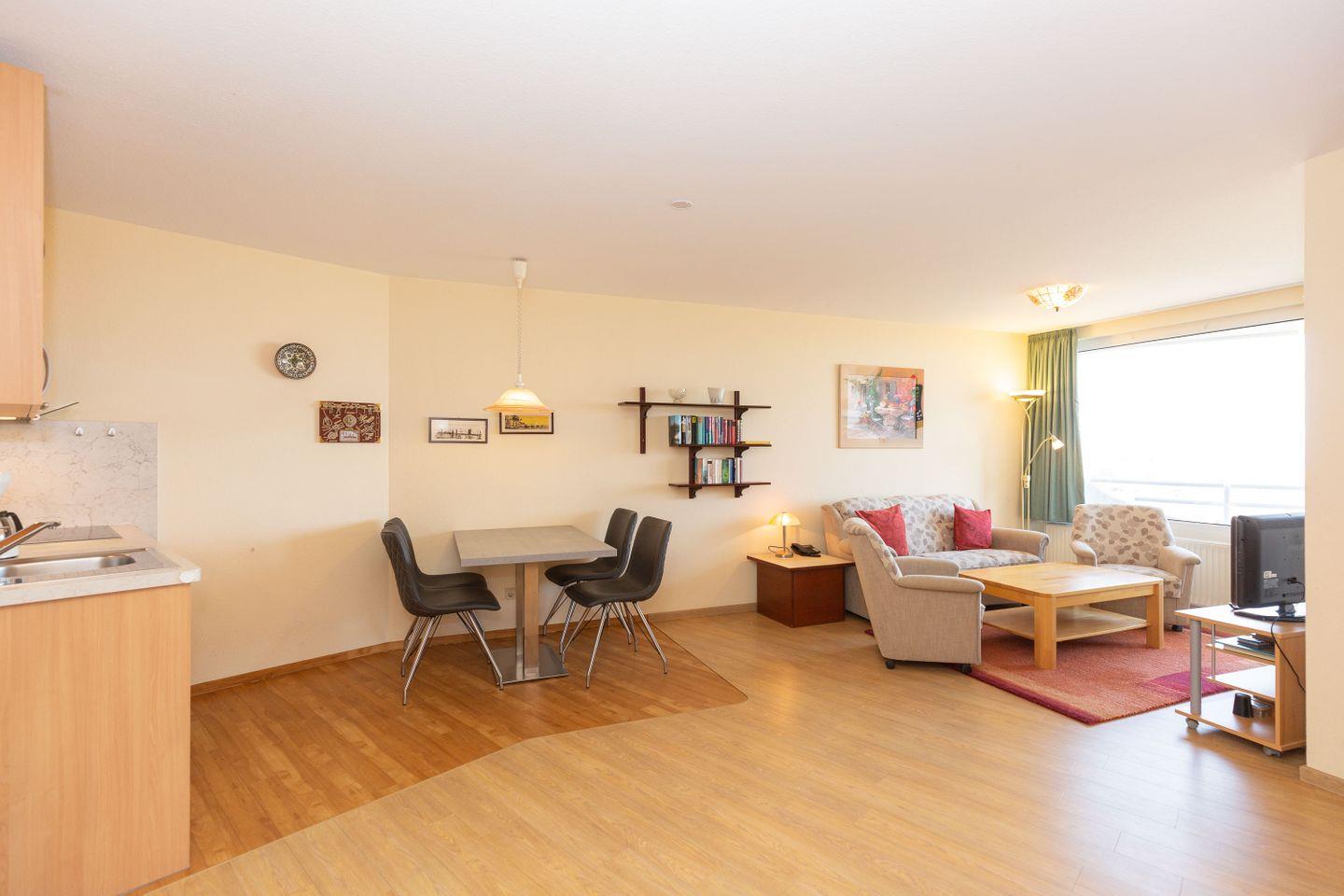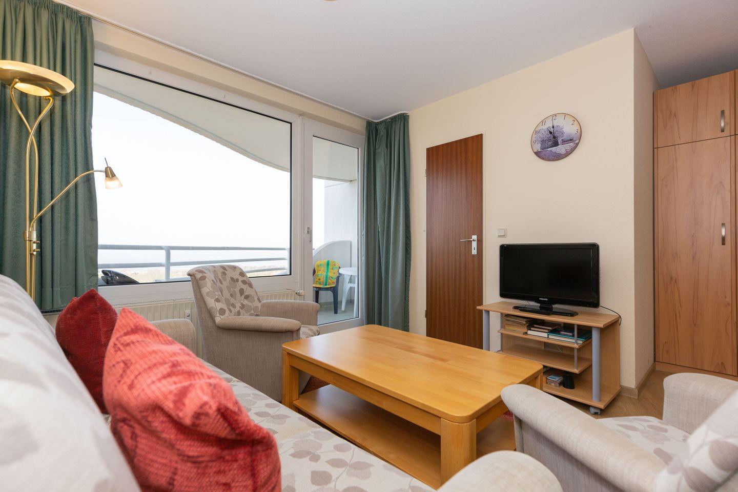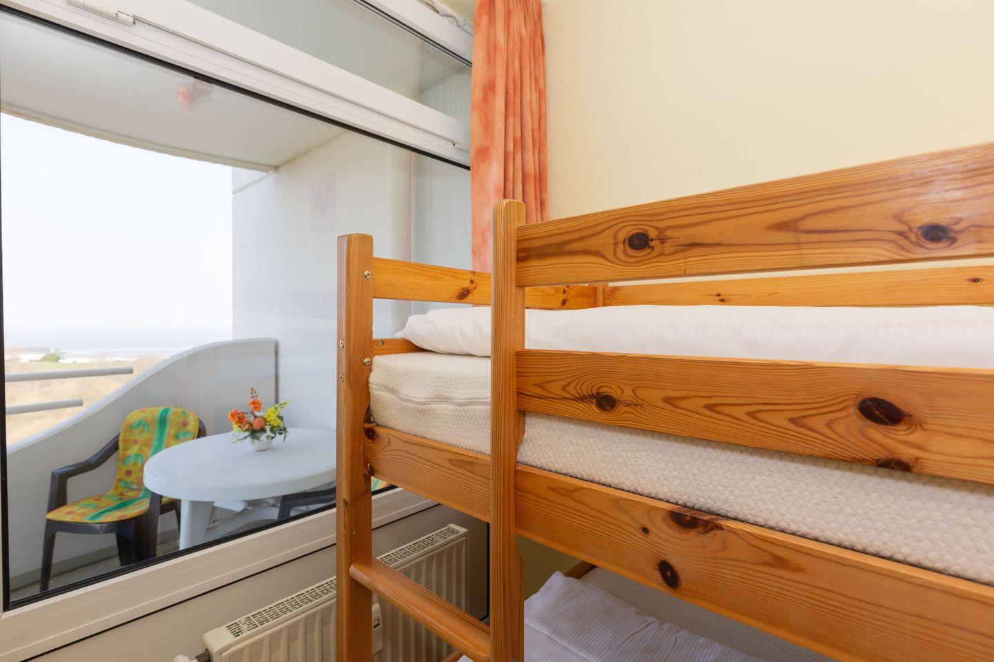 Haus "Lord Nelson", Typ 2, Appartement-Nr. "704", bis 4 Personen, 7. Etage, ca. 40 qm Wohnungsgröße, am Weltnaturerbe Wattenmeer (Meerblick Richtung Neuwerk), Wohnbereich mit Schrankbett (einzeln klappbar), separates kleines Kinderzimmer mit Etagenbett, Dusche/WC, Küchenzeile mit Mikrowelle und Geschirrspüler, Telefon, Kabel-TV, Balkon, Außenstellplatz, Haustiere sind nicht erlaubt, Strandkorb im Sommer 2026, Wlan-Zugang.