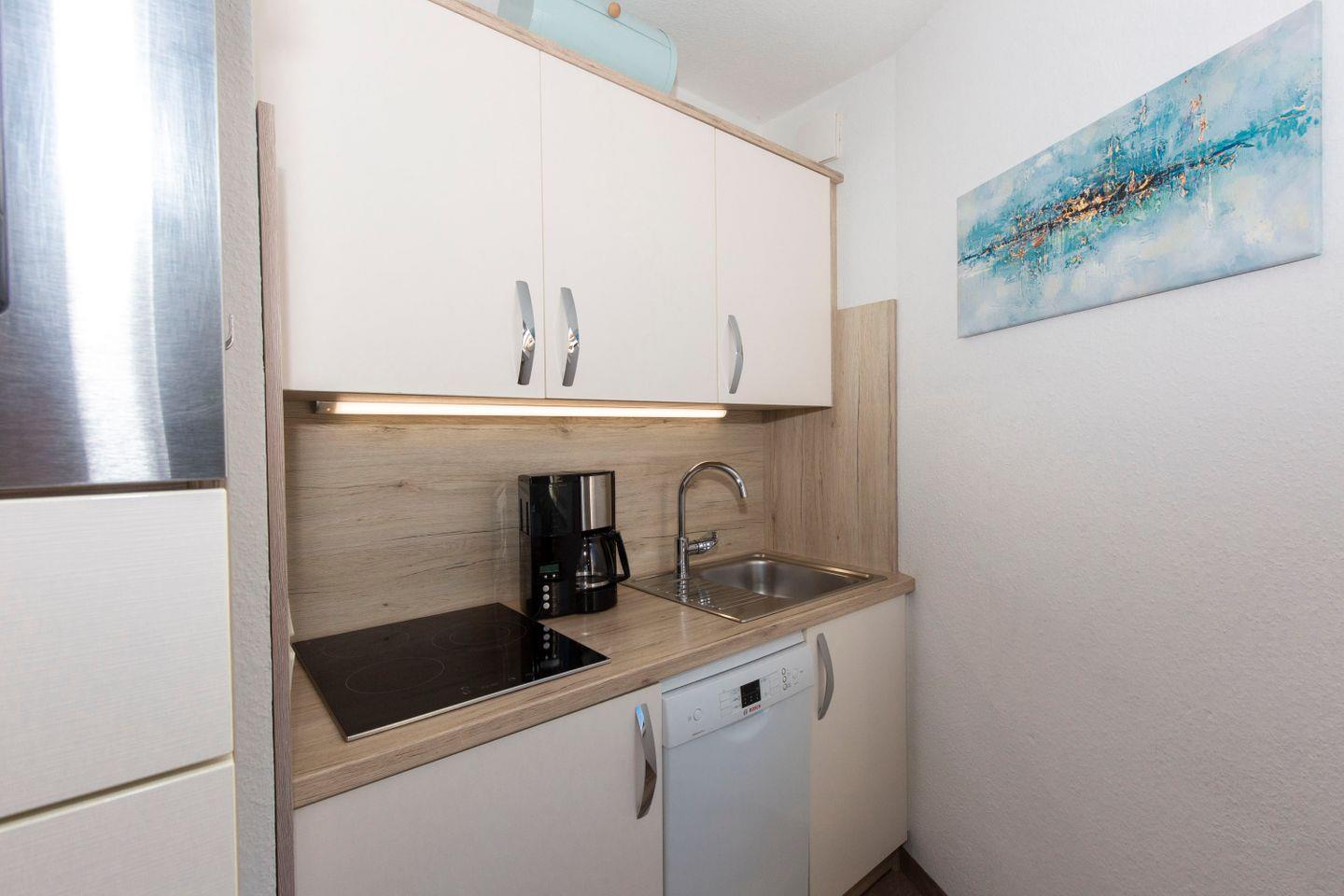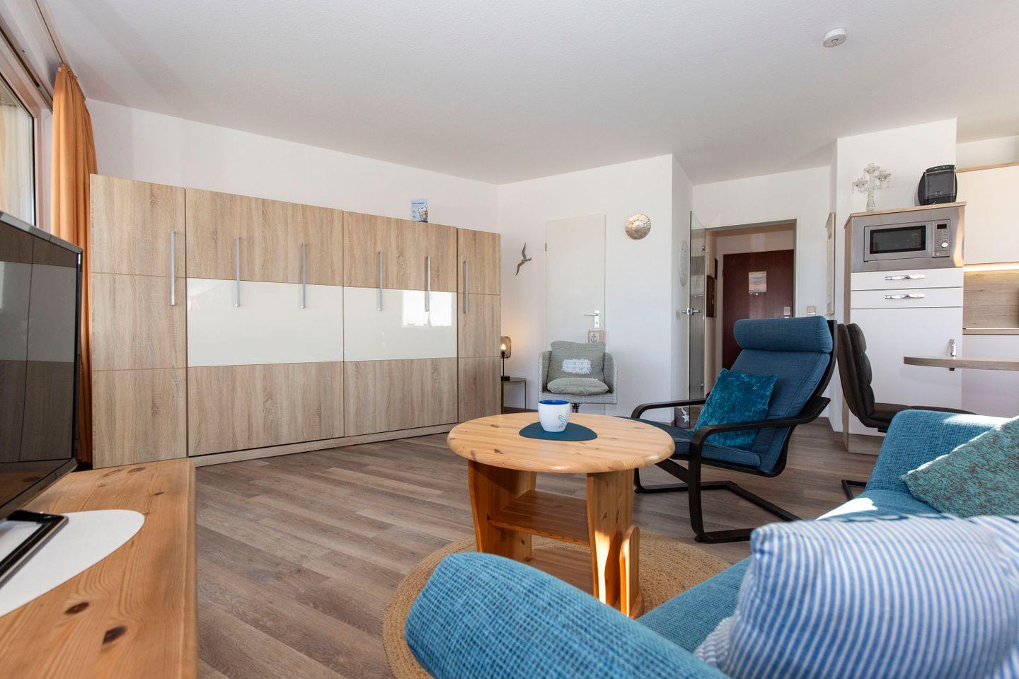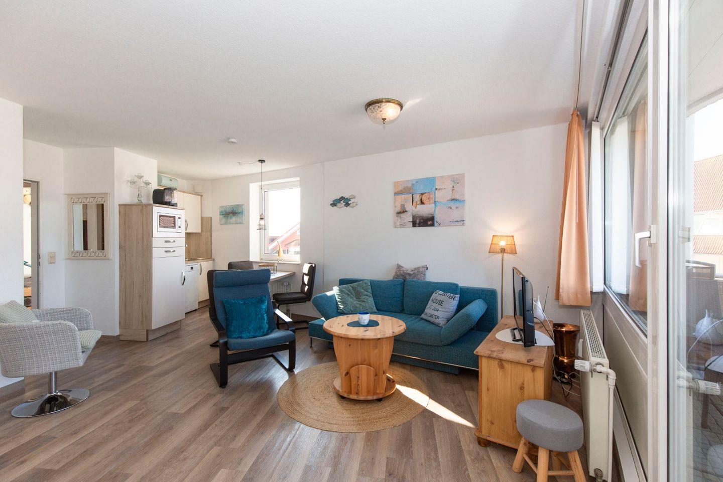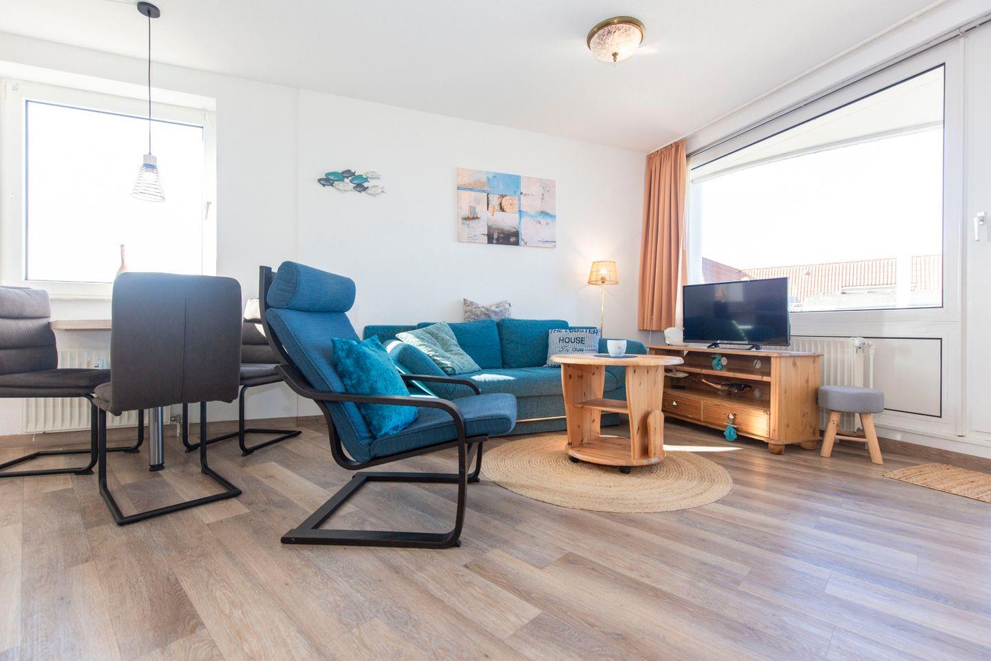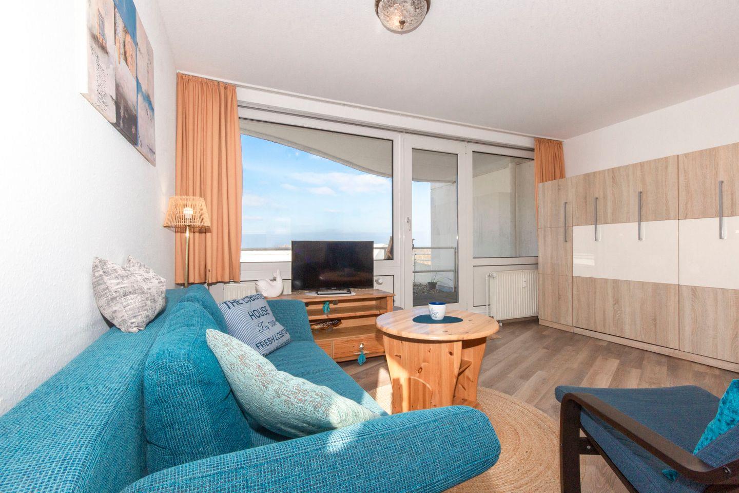 Haus "Lord Nelson", Typ 7, App.-Nr. 410, bis 3 Pers., 4. Etage, ca. 43 qm, Süd/Westseite, Meerblick Richtung Neuwerk, Wohnbereich mit Schrankbett (einzeln klappbar), sep. Schlafzimmer mit Einzelbett und TV, Dusche/WC, Küchenzeile mit Mikrowelle, Geschirrspüler und einem großen Ceranfeld, Balkon mit Sonnenliege, Telefon, kostenl. WLAN-Zugang im App., Kabel-TV, Tiefgaragenstellplatz, ab 5 Übernachtungen einmalig p.P. Bettwäsche und Handtücher inkl., Nichtraucher, großer Eckbalkon Richtung Nordsee, Haustiere sind nicht erlaubt, Strandkorb im Sommer 2026.