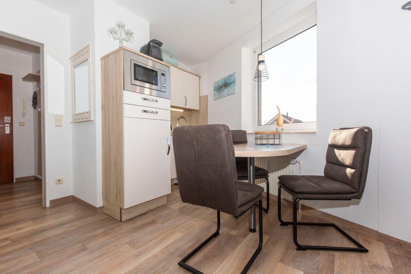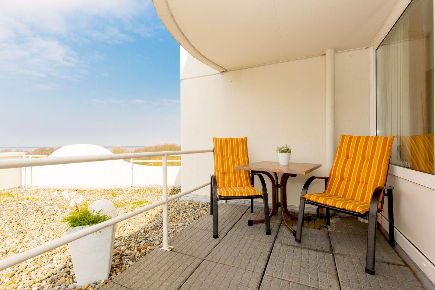 Auf dem großen, sonnenreichen Eckbalkon erwarten Sie nicht nur bequeme Balkonmöbel und eine Sonnenliege, sondern auch ein fabelhafter Ausblick auf die Nordsee. Die Ausrichtung nach Südwest ermöglicht Ihnen einen Blick bis zur Insel Neuwerk.