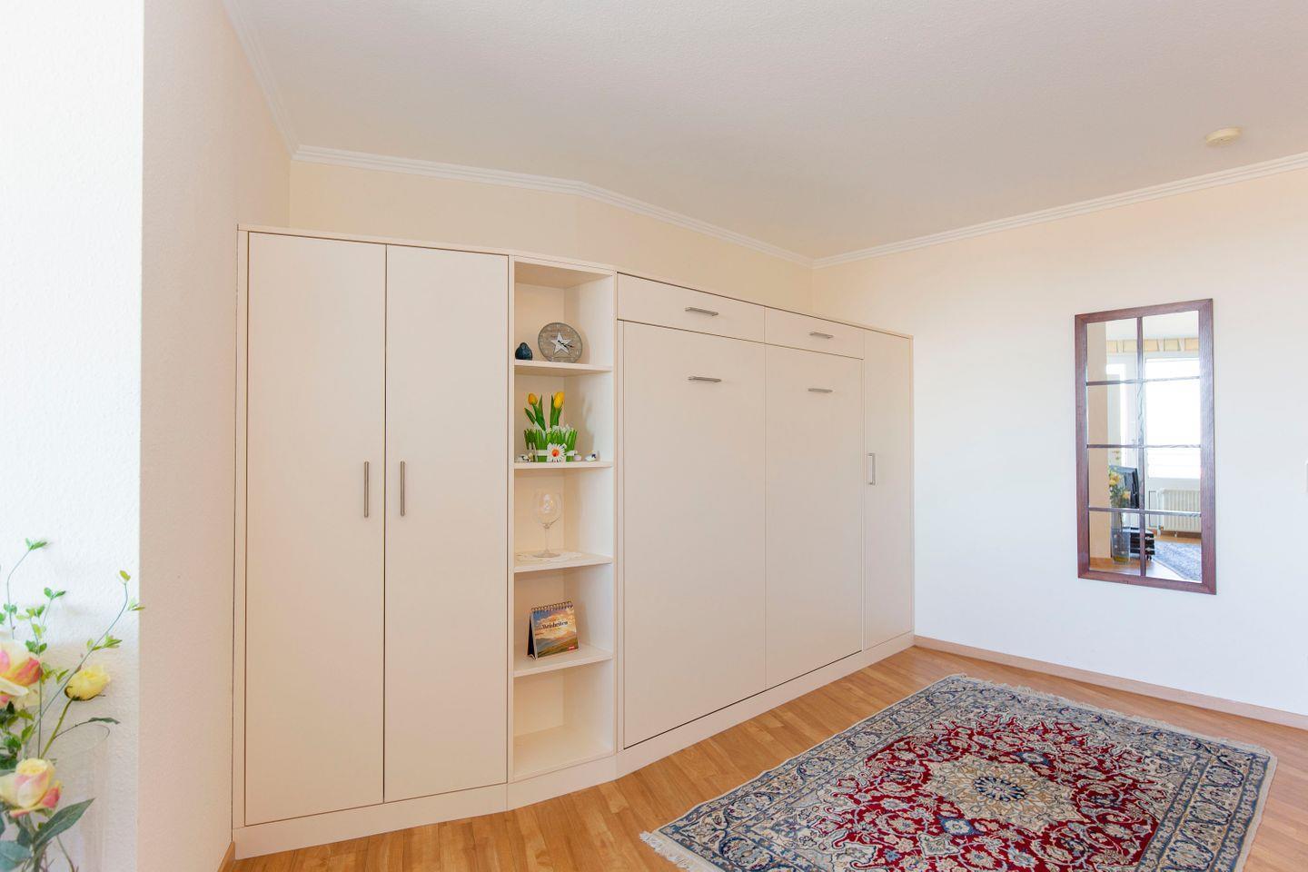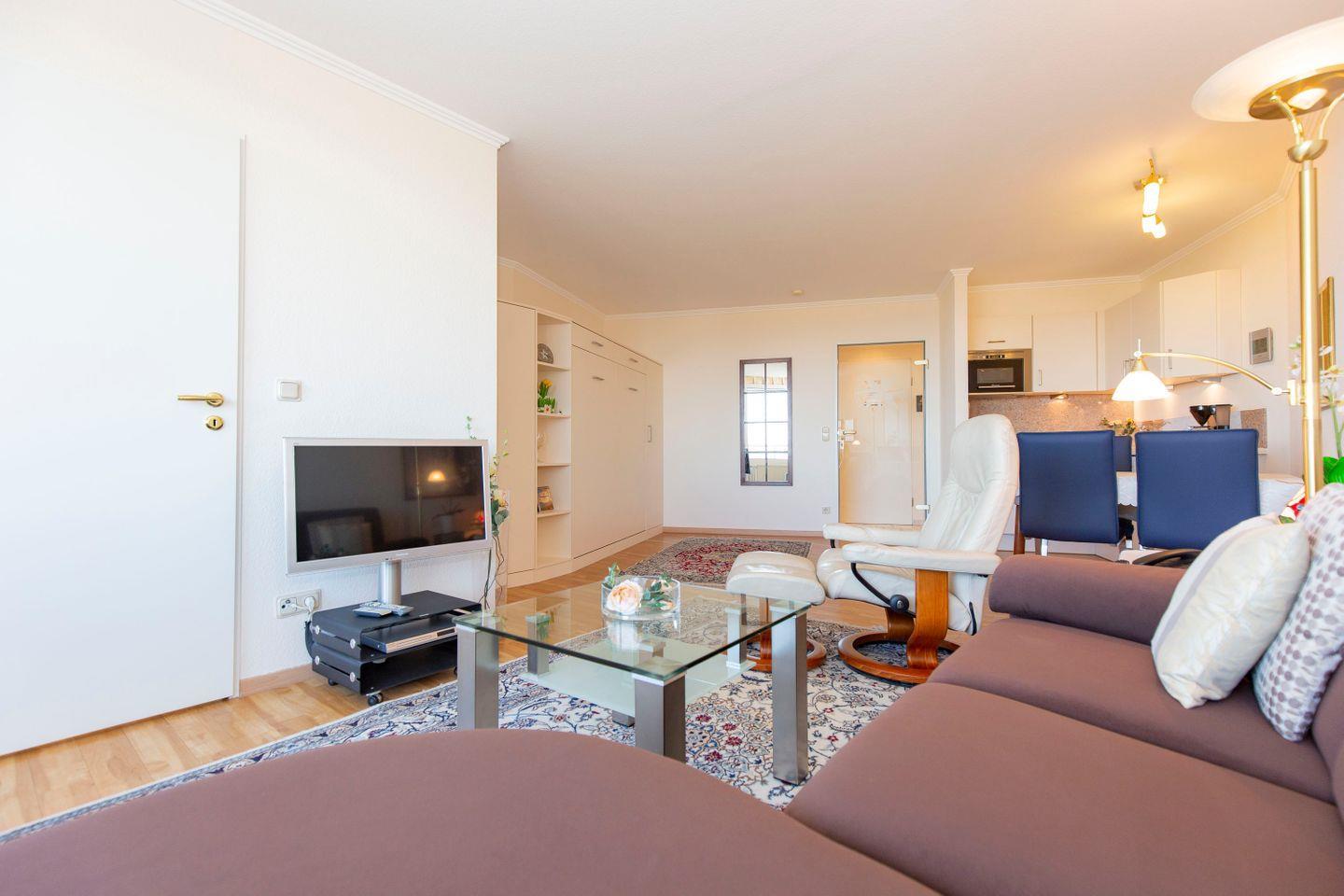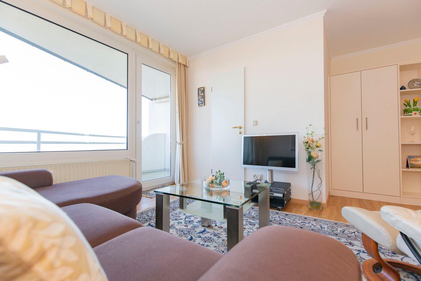 Haus "Lord Nelson", Typ 2, Appartement-Nr. "803", bis 3 Personen, 8. Etage, ca. 40 qm Wohnungsgröße, Weltnaturerbe Wattenmeer (Meerblick Richtung Neuwerk), Wohnbereich mit Schrankbett, separates kleines Schlafzimmer mit Einzelbett, Dusche/WC, Küchenzeile mit Geschirrspüler/Mikrowelle, 4 Platten Ceranfeld, Senseo-Maschine, Kabel-TV, DVD-und CD-Spieler, Tresor, kostenloser WLAN-Zugang im App. Balkon, Außenstellplatz, Strandkorb im Sommer 2025, Nichtraucherwohnung, Haustiere sind nicht gestattet.