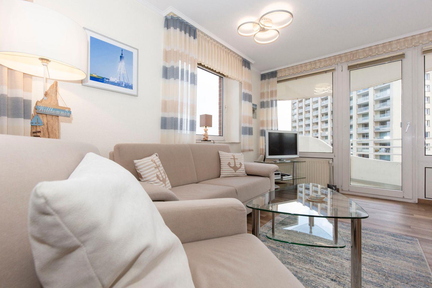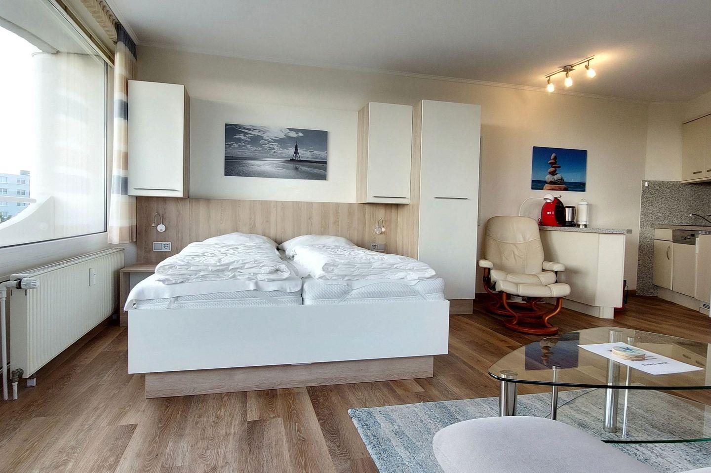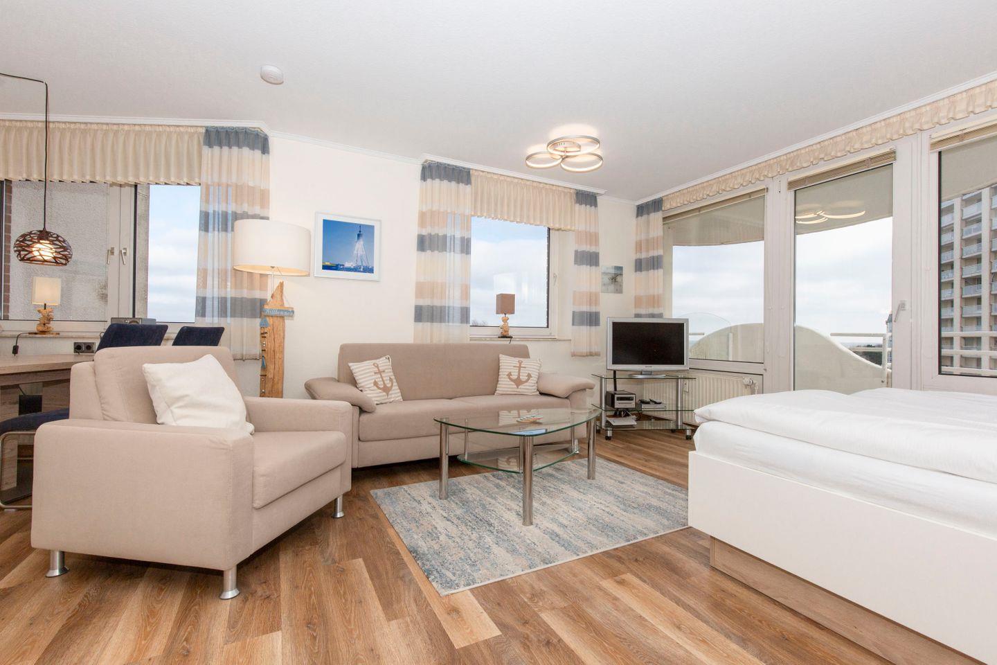 Haus "Lord Nelson", Typ 1, App.-Nr. 520, bis 2 Pers., 5. Etage, ca. 43 qm, Ostseite, Meerblick Richtung Nordsee, seitlicher Meerblick Richtung Elbe, Wohn-Schlafraum mit neuem Doppelbett (Frühjahr 2024), Dusche/WC, Küchenzeile mit Geschirrspüler und Mikrowelle, 4-Platten Ceranfeld, Balkon, Kabel-TV (Flat-Screen), kostenl. W-Lan Zugang im App., CD-Spieler, Tresor, Tiefgaragenstellplatz, Strandkorb im Sommer 2025, Haustiere sind nicht erlaubt, Nichtraucherwohnung.