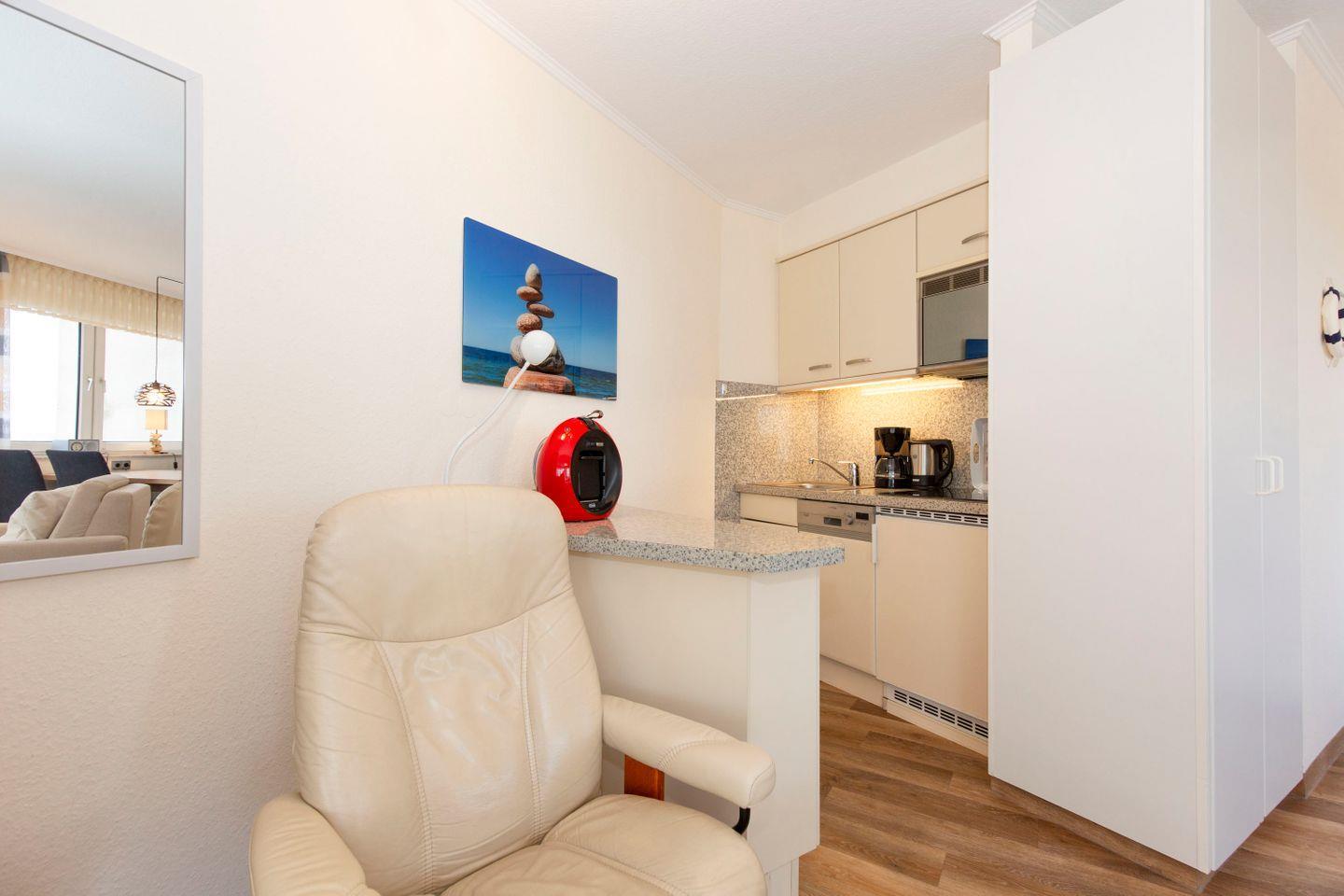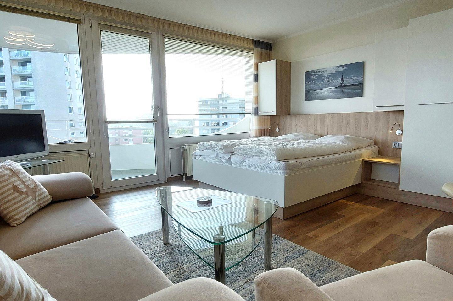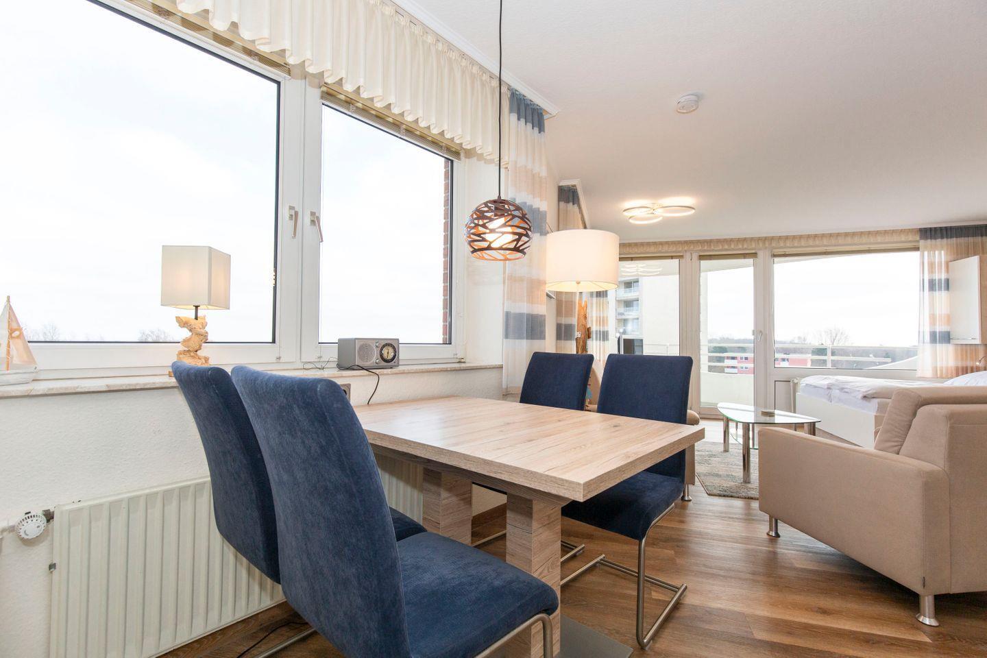 Haus "Lord Nelson", Typ 1, App.-Nr. 520, bis 2 Pers., 5. Etage, ca. 43 qm, Ostseite, Meerblick Richtung Nordsee, seitlicher Meerblick Richtung Elbe, Wohn-Schlafraum mit neuem Doppelbett (Frühjahr 2024), Dusche/WC, Küchenzeile mit Geschirrspüler und Mikrowelle, 4-Platten Ceranfeld, Balkon, Kabel-TV (Flat-Screen), kostenl. W-Lan Zugang im App., CD-Spieler, Tresor, Tiefgaragenstellplatz, Strandkorb im Sommer 2025, Haustiere sind nicht erlaubt, Nichtraucherwohnung.