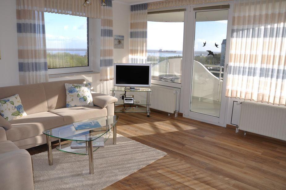 Die hell, modern und maritim eingerichtete Ferienwohnung liegt nur wenige Schritte vom feinen Sandstrand entfernt. Sie ist auf 43 m² für 2 Personen komfortabel ausgestattet mit Wohn-Schlafraum, moderner Küchenzeile mit Geschirrspüler und Mikrowelle, Duschbad/WC und Balkon. Durch mehrere Fenster genießen Sie einen traumhaften Panoramablick aus der 5. Etage auf die Nordsee und den Weltschifffahrtsweg. Durch die Top-Lage der Ferienwohnung können Sie die vorbeifahrenden Schiffe, manchmal auch Kreuzfahrtschiffe, gemütlich von mehreren Plätzen aus beobachten. Der nahegelegene Nordseestrand lädt zu ausgiebigen Wattwanderungen ein. Ganz in der Nähe befinden sich auch die Kugelbake, die das Wahrzeichen von Cuxhaven ist, sowie der Kurpark.