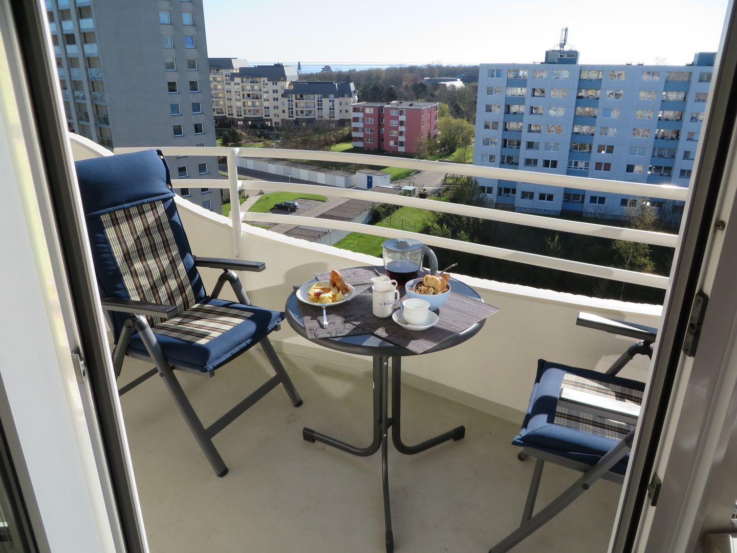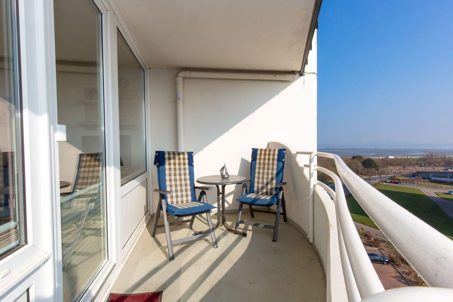 Neben einem möblierten Balkon mit Meerblick erwartet Sie in dieser FeWo eine große Dachterrasse. Sie ist mit einem Großraumstrandkorb bestückt. Bei Wind und Wetter können Sie hier die Aussicht auf den Weltschifffahrtsweg und die frische Nordseeluft genießen.