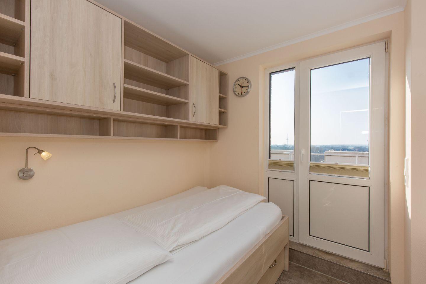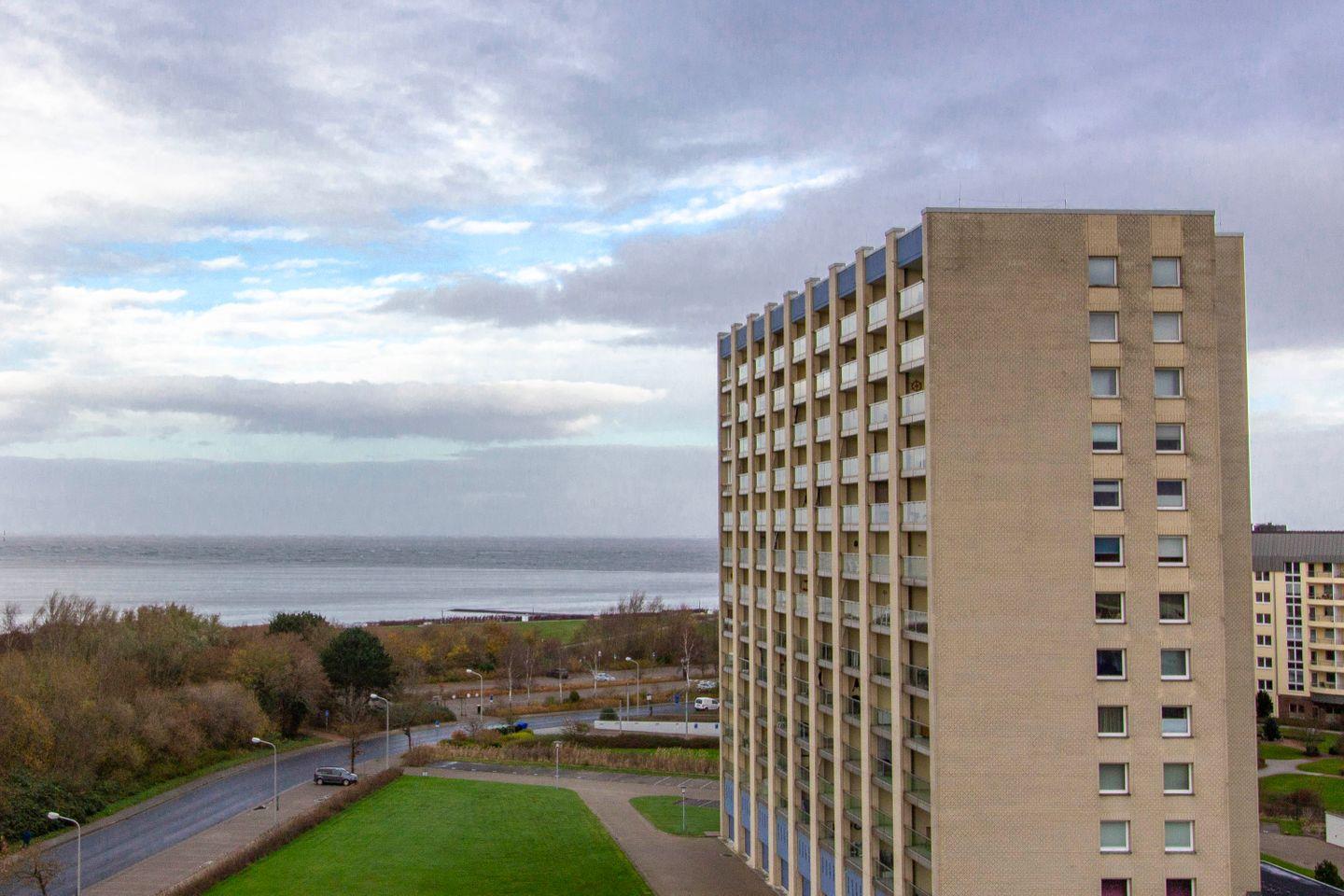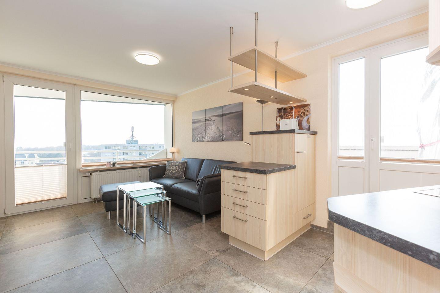 Haus "Lord Nelson", Typ 1, App.-Nr. "814", bis 2 Pers., 8.te Etage, ca. 43 qm groß, Süd-Ostseite, Meerblick zur Elbmündung, von der Dachterrasse (ca. 40 qm) auch Richtung Insel Neuwerk, separates Schlafzimmer mit 2 Einzelbetten (1m x 1,95m & 1,20m x 2,00m), Dusche/WC, Küchenzeile mit Geschirrspüler, Mikrowelle, Backofen, 4-Platten-Ceranfeld, Kabel-TV, CD-Player, kostenloser WLAN-Zugang im App., begehbarer Kleiderschrank, Balkon, Dachterrasse mit Großraumstrandkorb, Nichtraucher, Haustiere nicht erlaubt, Tiefgaragenstellplatz, im Sommer 2026 Strandkorb am Sandstrand.