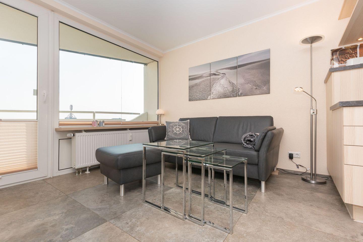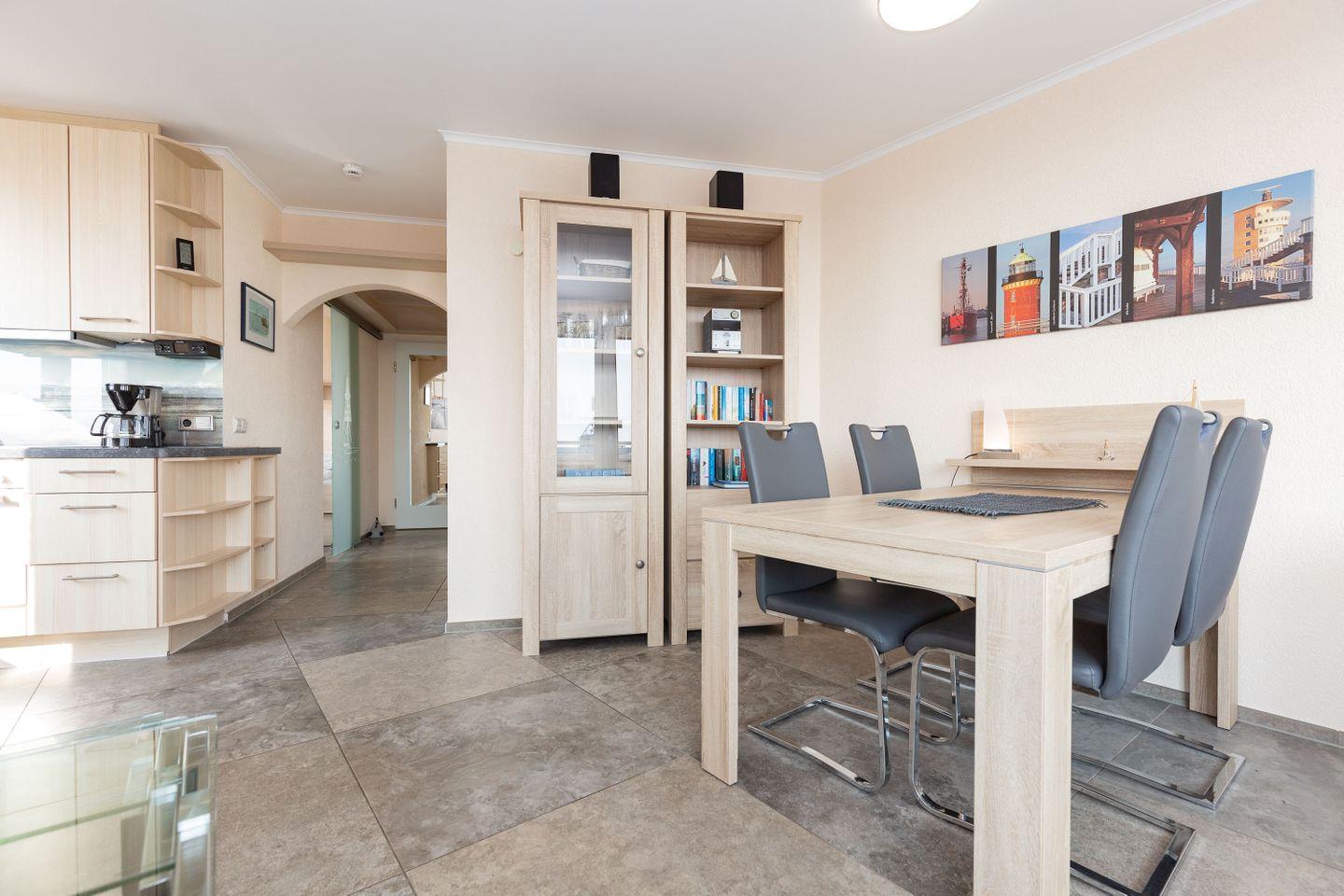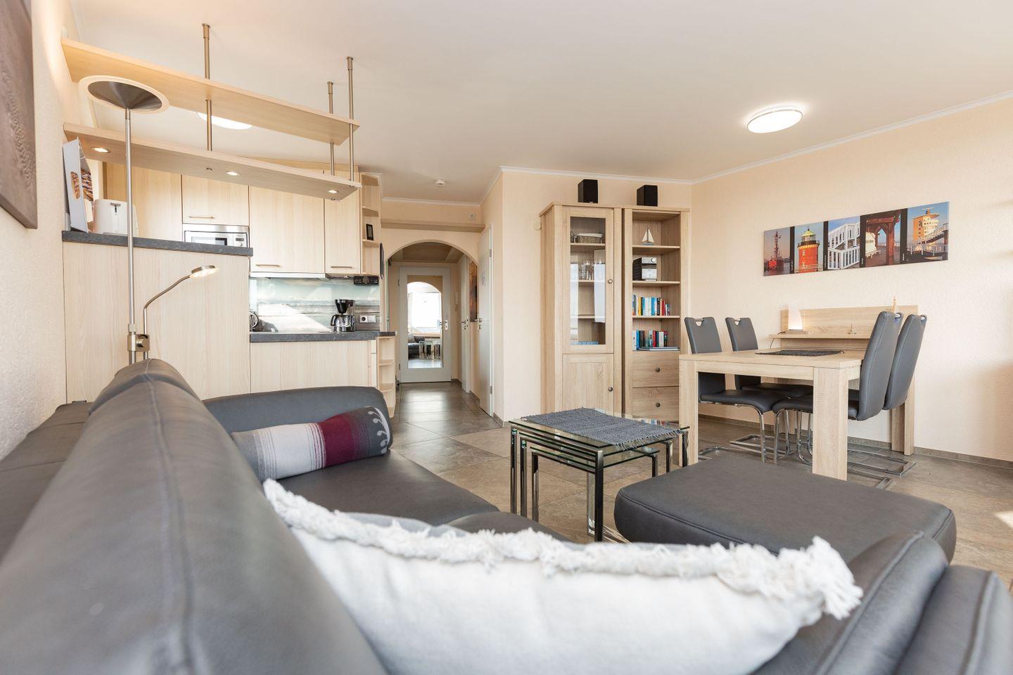 Mit einer modernen Einrichtung und viel Liebe zum Detail entpuppt sich die 2-Zimmer Ferienwohnung als wunderbares zu Hause auf Zeit an der Nordsee. Mit 44 m² Größe eignet sich das Urlaubsdomizil perfekt für Paare. Großzügigkeit ist hier Programm: Von dem Wohnbereich über den begehbaren Kleiderschrank bis hin zu der großen Dachterrasse. Zusätzlich erwartet Sie ein fabelhafter Ausblick auf die Nordsee in Richtung Weltschifffahrtsweg.