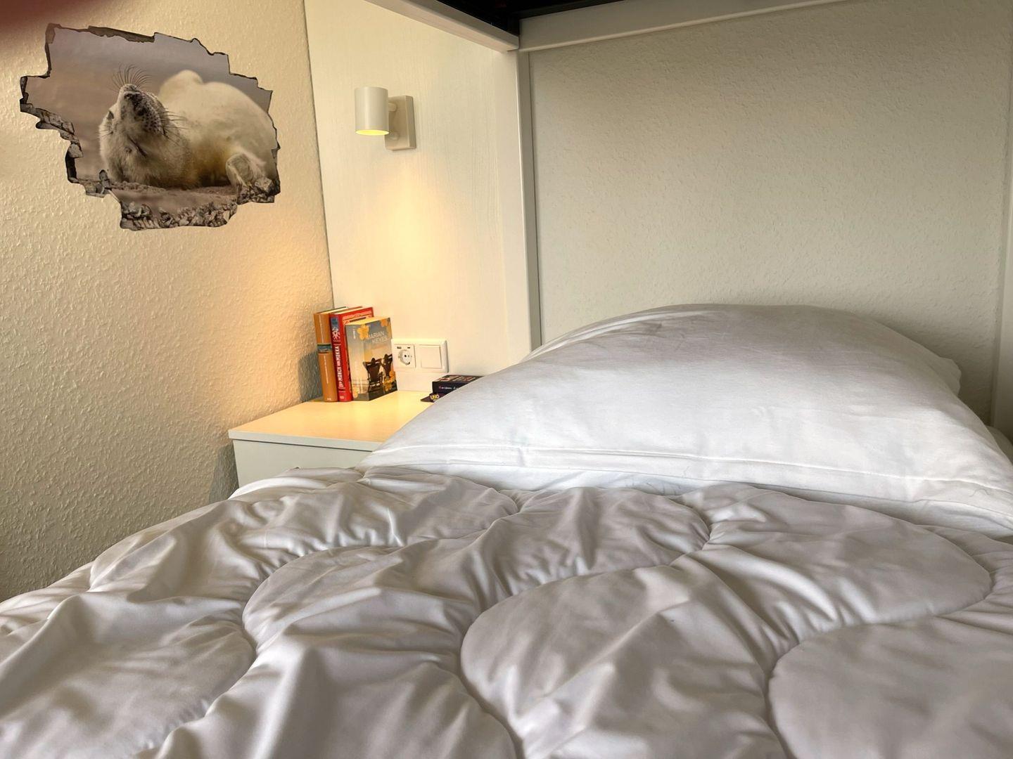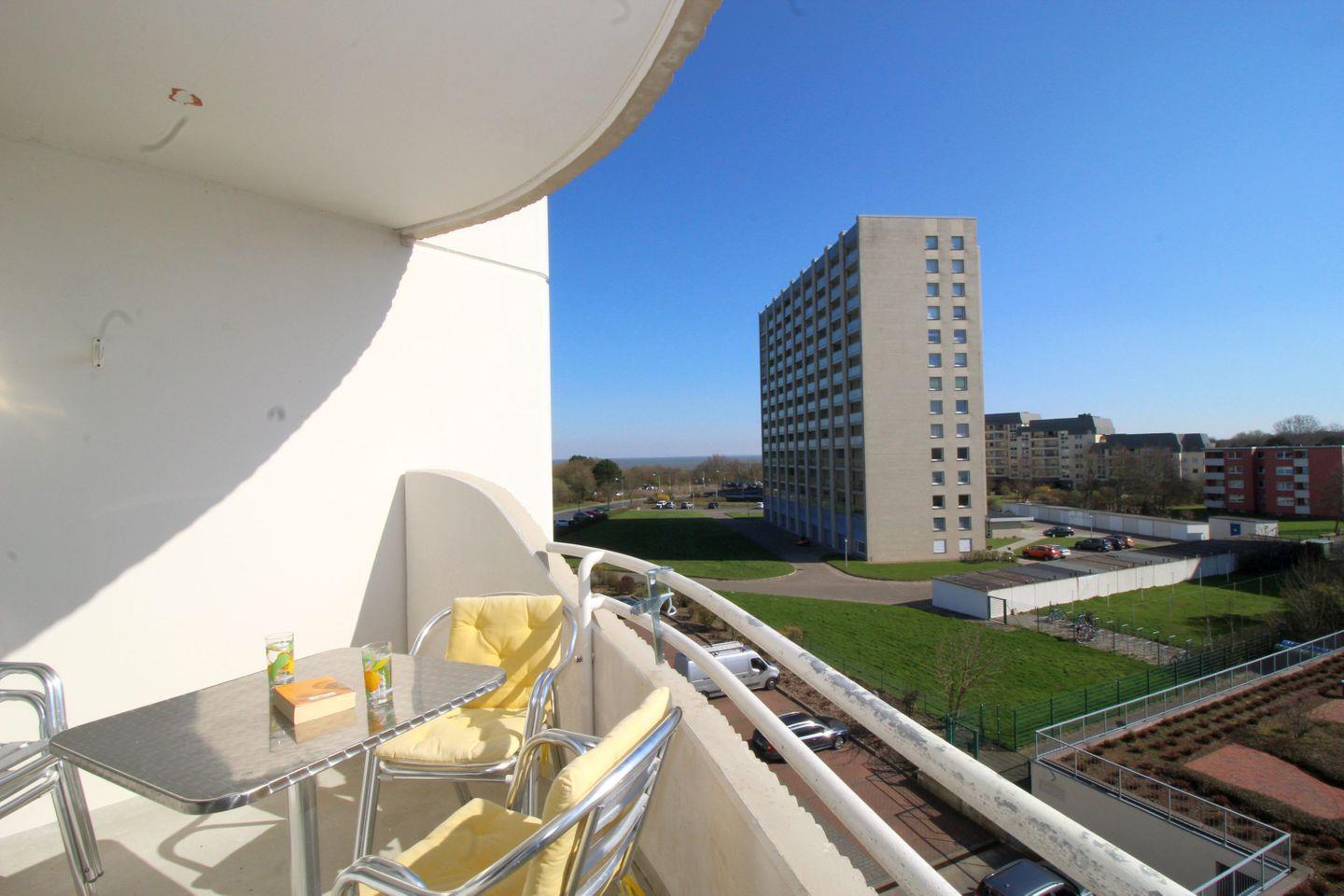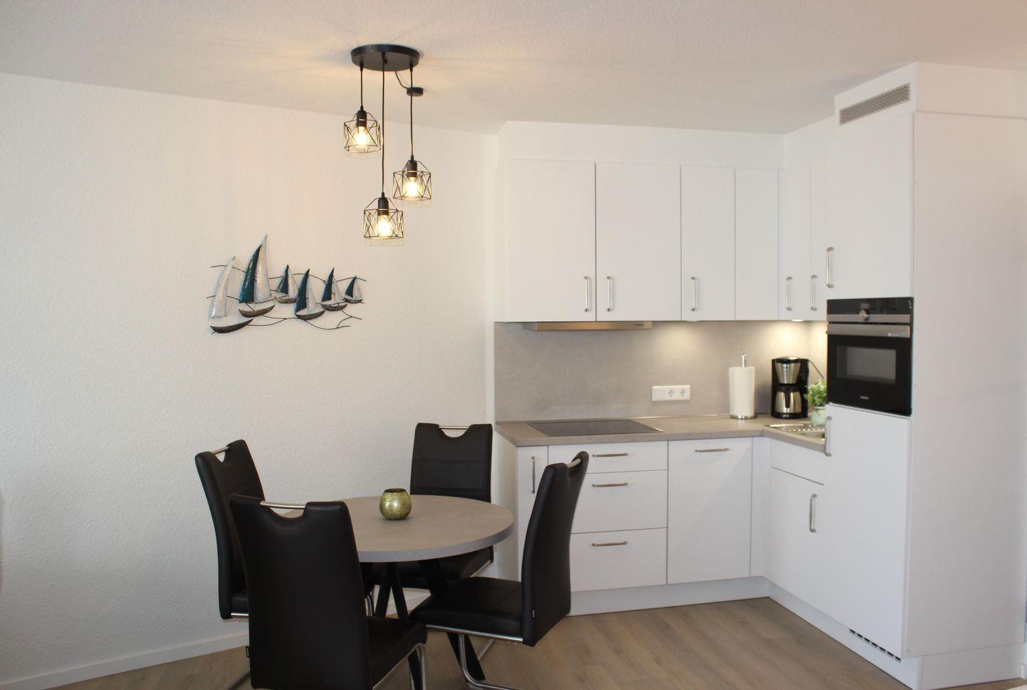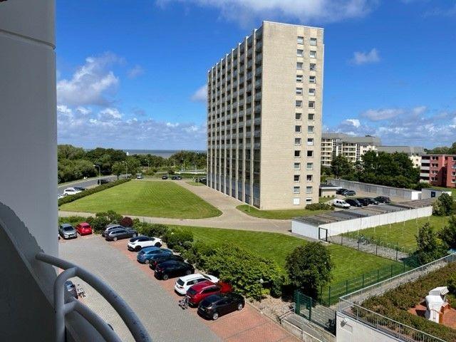 Haus "Lord Nelson", Typ 2, App.-Nr. "414", bis 4 Personen, 4. Etage, ca. 40 qm Wohnungsgröße, Ostseite (eingeschränkter Meerblick/Richtung Elbe), Balkon, Wohnbereich mit Doppelbett (durchgehende Matratze 180x200), separates kleines Schlafzimmer mit Etagenbett, Dusche/WC, Küchenzeile mit integriertem Backofen, großes Ceranfeld und Geschirrspüler, Kabel-TV, kostenl. WLAN-Zugang im App., Tiefgaragenstellplatz, Strandkorb im Sommer 2026, Nichtraucherappartement, keine Hunde erlaubt.