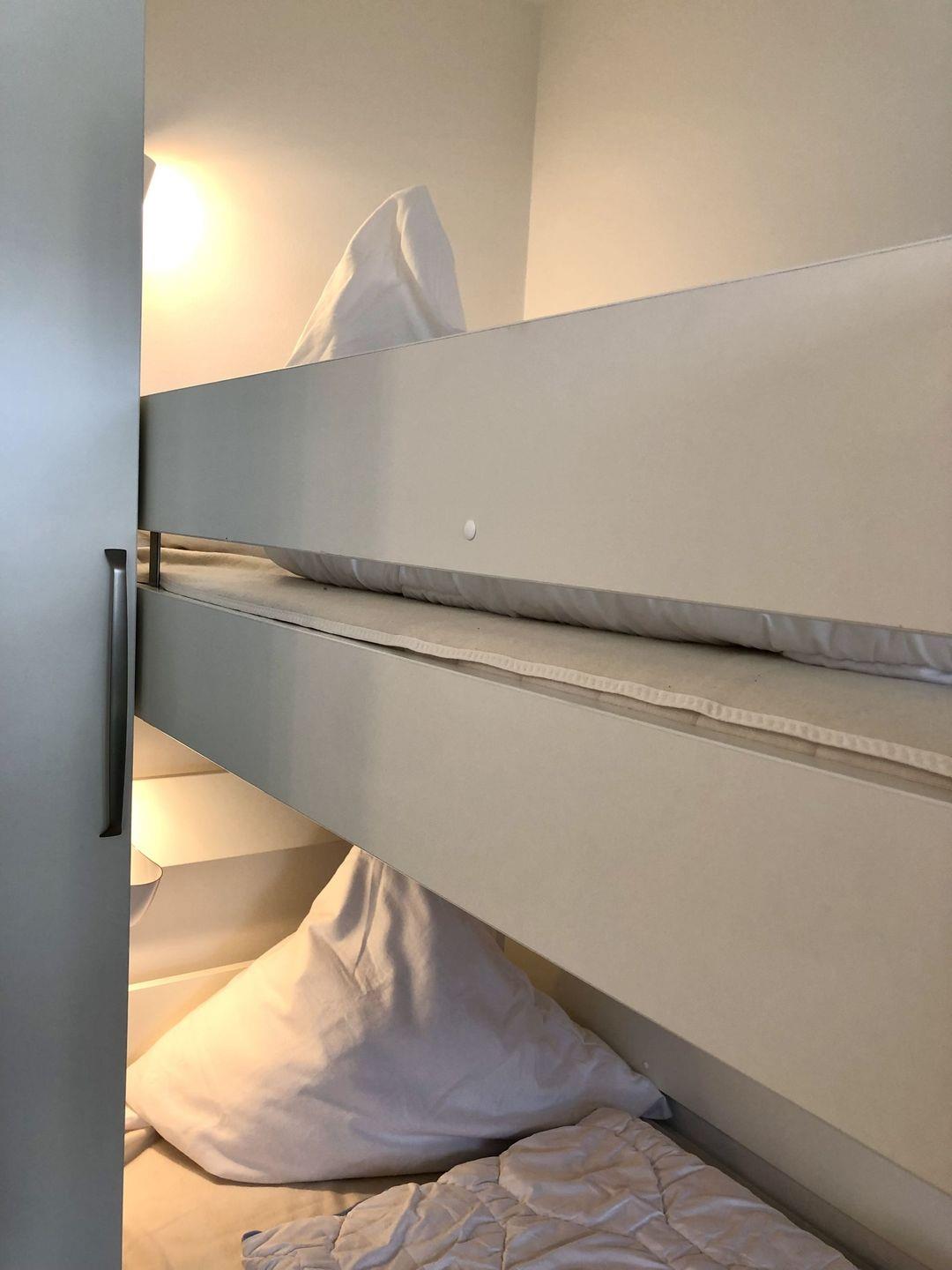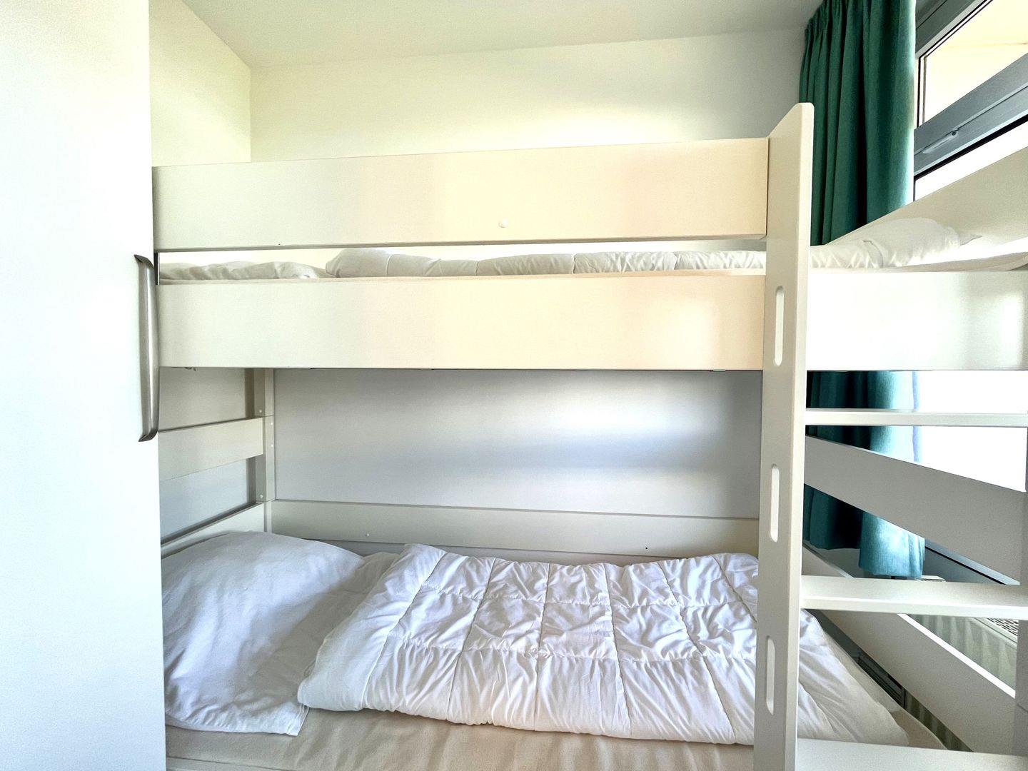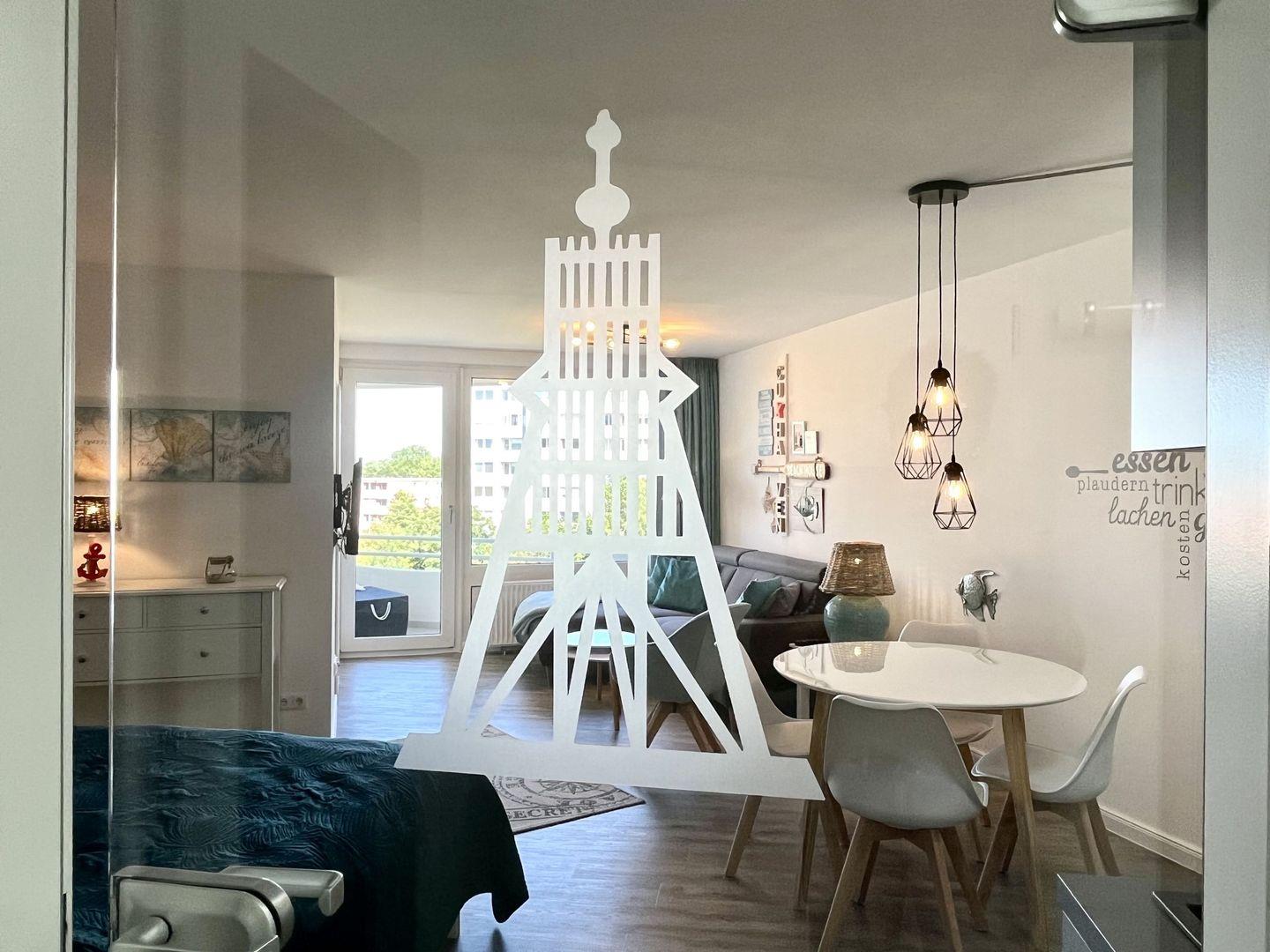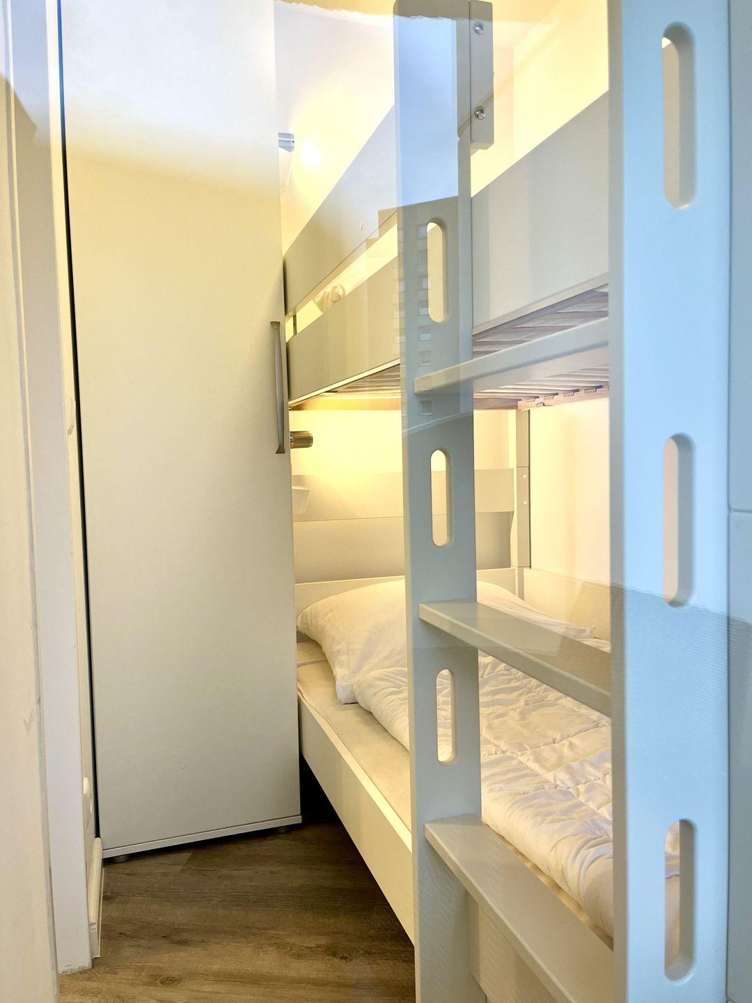 Haus "Lord Nelson", Typ 2, App.-Nr. 412, bis 4 Personen, ca 40 qm Größe, Weltschifffahrtsweg, seitlicher Meerblick Richtung Elbe, Wohnbereich mit Doppelbett, Kinderzimmer mit Etagenbett, Dusche/WC, Küchenzeile mit Geschirrspüler, Mikrowelle, 4-Platten-Ceranfeld, Balkon, kostenloses W-LAN im App., Kabel-TV, mobiler Bluetooth Speaker, Nichtraucherwohnung, keine Haustiere erlaubt, Strandkorb im Sommer 2026, Tiefgaragenstellplatz.
