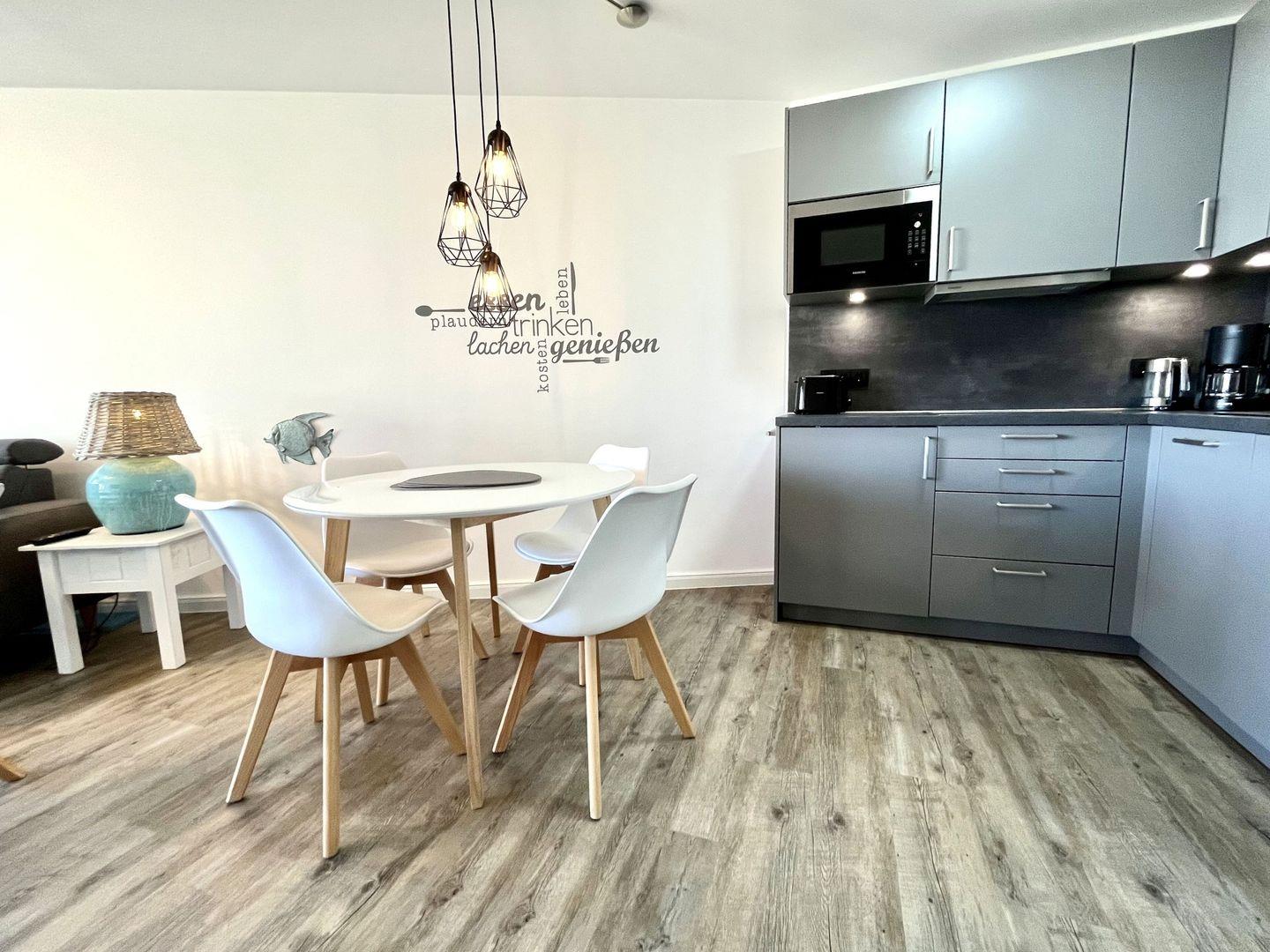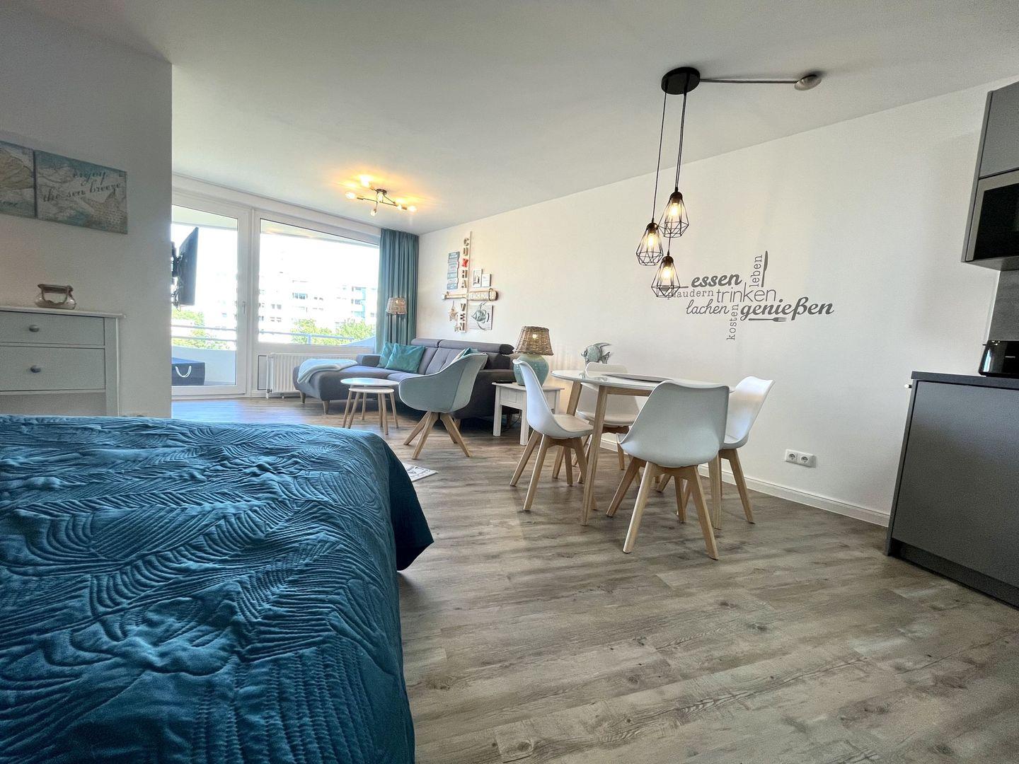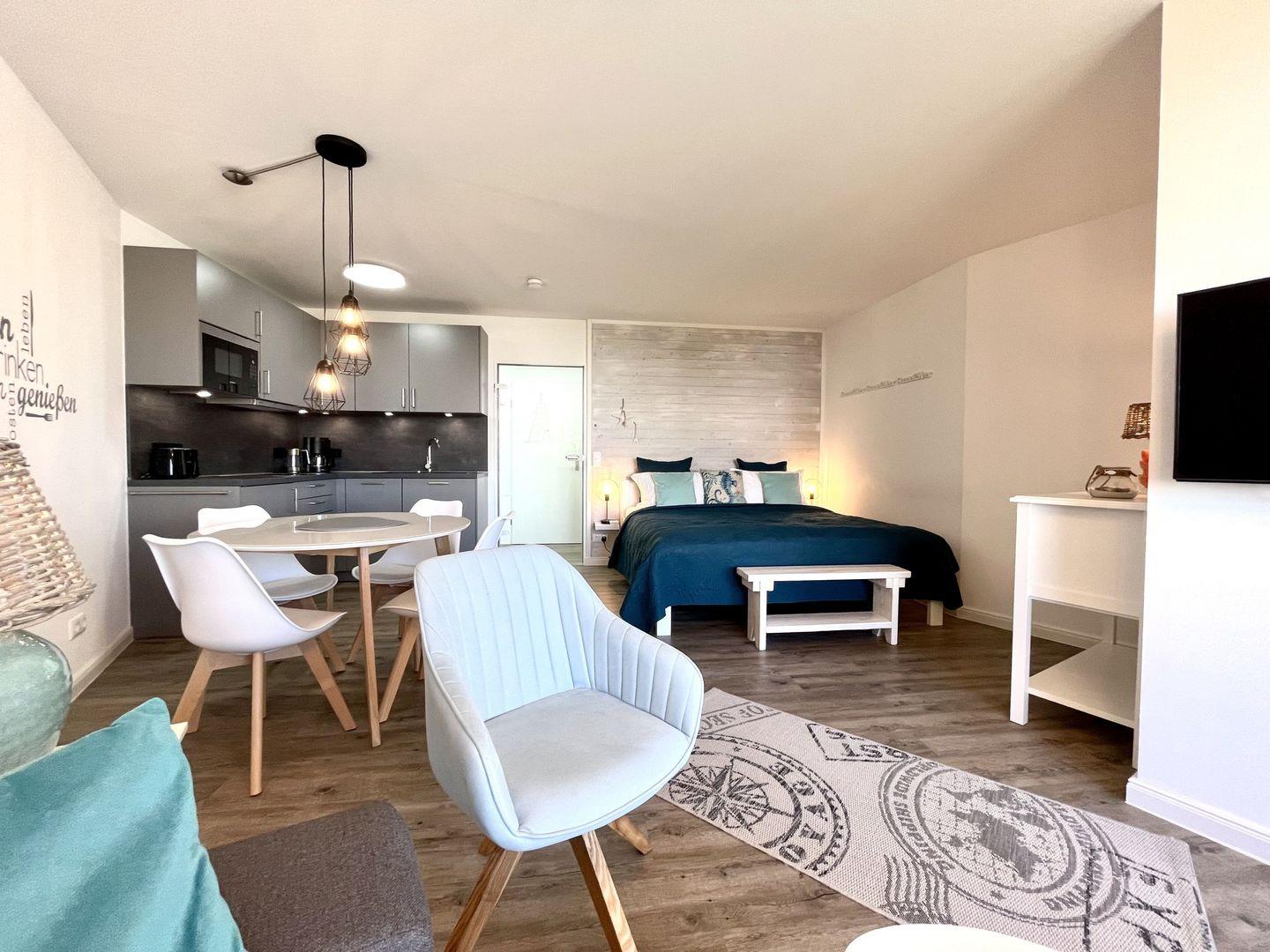 Haus "Lord Nelson", Typ 2, App.-Nr. 412, bis 4 Personen, ca 40 qm Größe, Weltschifffahrtsweg, seitlicher Meerblick Richtung Elbe, Wohnbereich mit Doppelbett, Kinderzimmer mit Etagenbett, Dusche/WC, Küchenzeile mit Geschirrspüler, Mikrowelle, 4-Platten-Ceranfeld, Balkon, kostenloses W-LAN im App., Kabel-TV, mobiler Bluetooth Speaker, Nichtraucherwohnung, keine Haustiere erlaubt, Strandkorb im Sommer 2026, Tiefgaragenstellplatz.