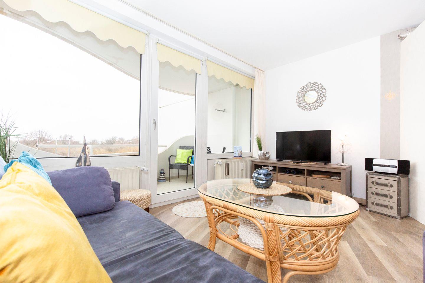 Komfortable Ferienwohnung in Cuxhaven-Döse mit Balkon, Schwimmbad, Sauna und Strandkorb im Sommer 2026.