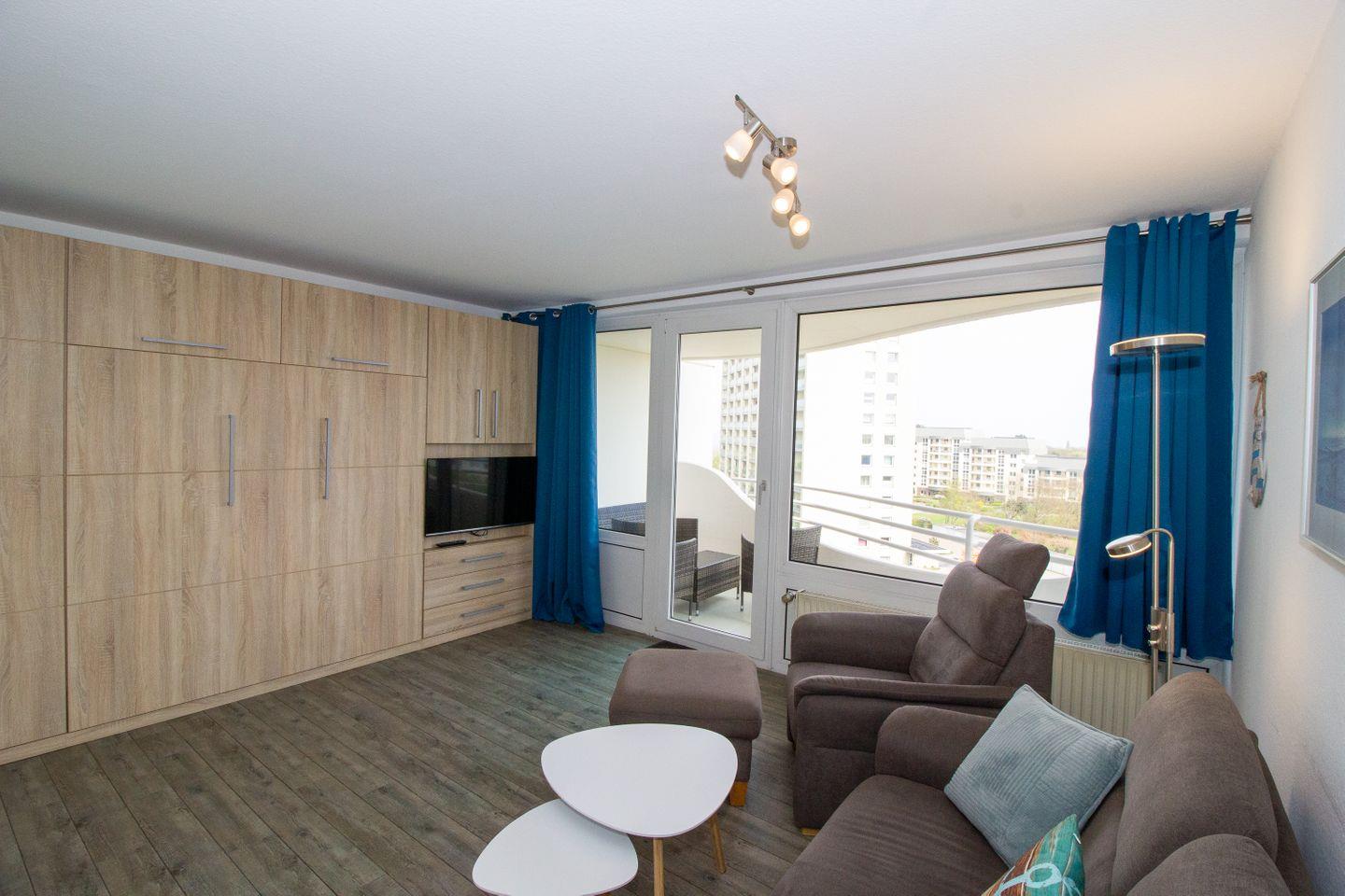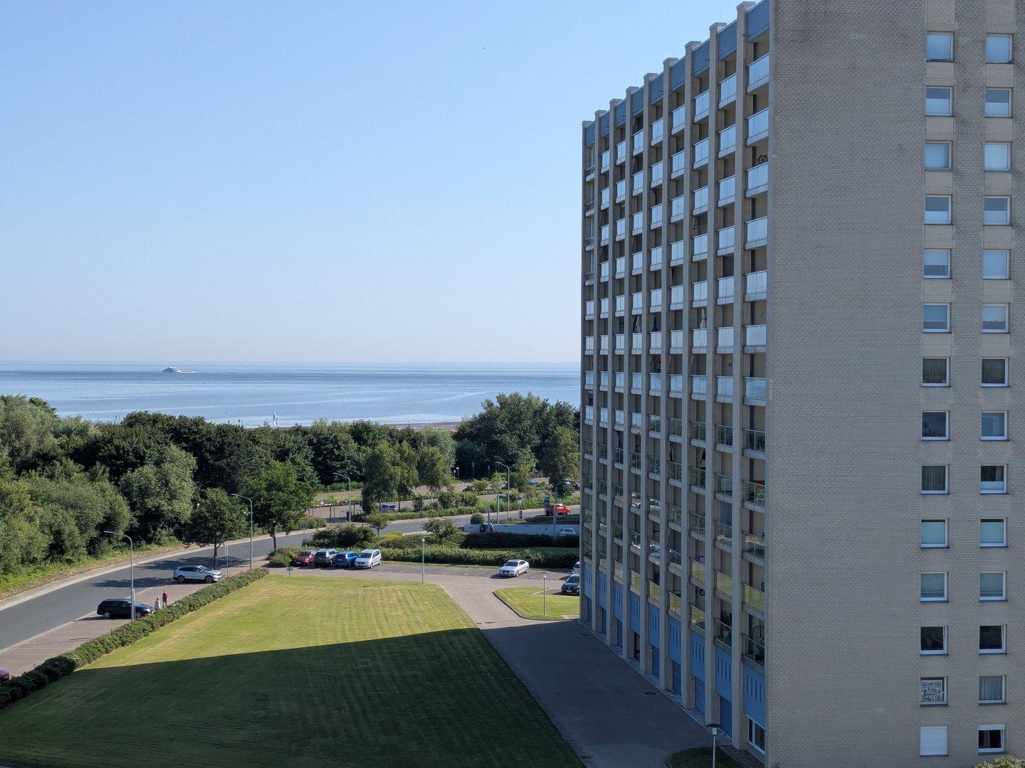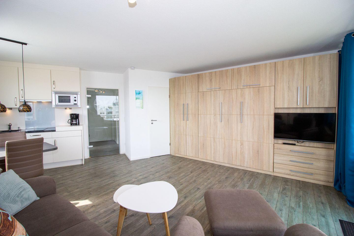Haus "Lord Nelson", Typ 1, App.-Nr. "713", bis 3 Pers., 7. Etage, ca. 43 qm groß, Süd-Ostseite, Meerblick zur Elbmündung, von der Dachterrasse (ca. 40 qm) auch Richtung Cuxhaven, sep. Schlafzimmer mit 1 Einzelbett und 2. TV (hier nur öffentlich-rechtliche Sender), Schrankdoppelbett im Wohnbereich, Dusche/WC, Küchenzeile mit Geschirrspüler, Mikrowelle, 2-Platten-Ceranfeld, Kabel-TV im Wohnzimmer, kostenl. WLAN-Zugang im App., Balkon, Dachterrasse, Nichtraucher, Haustiere nicht erlaubt, Tiefgaragenstellplatz, im Sommer 2026 Strandkorb am Sandstrand.