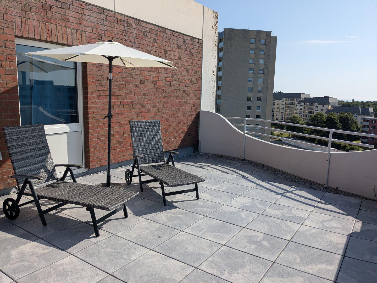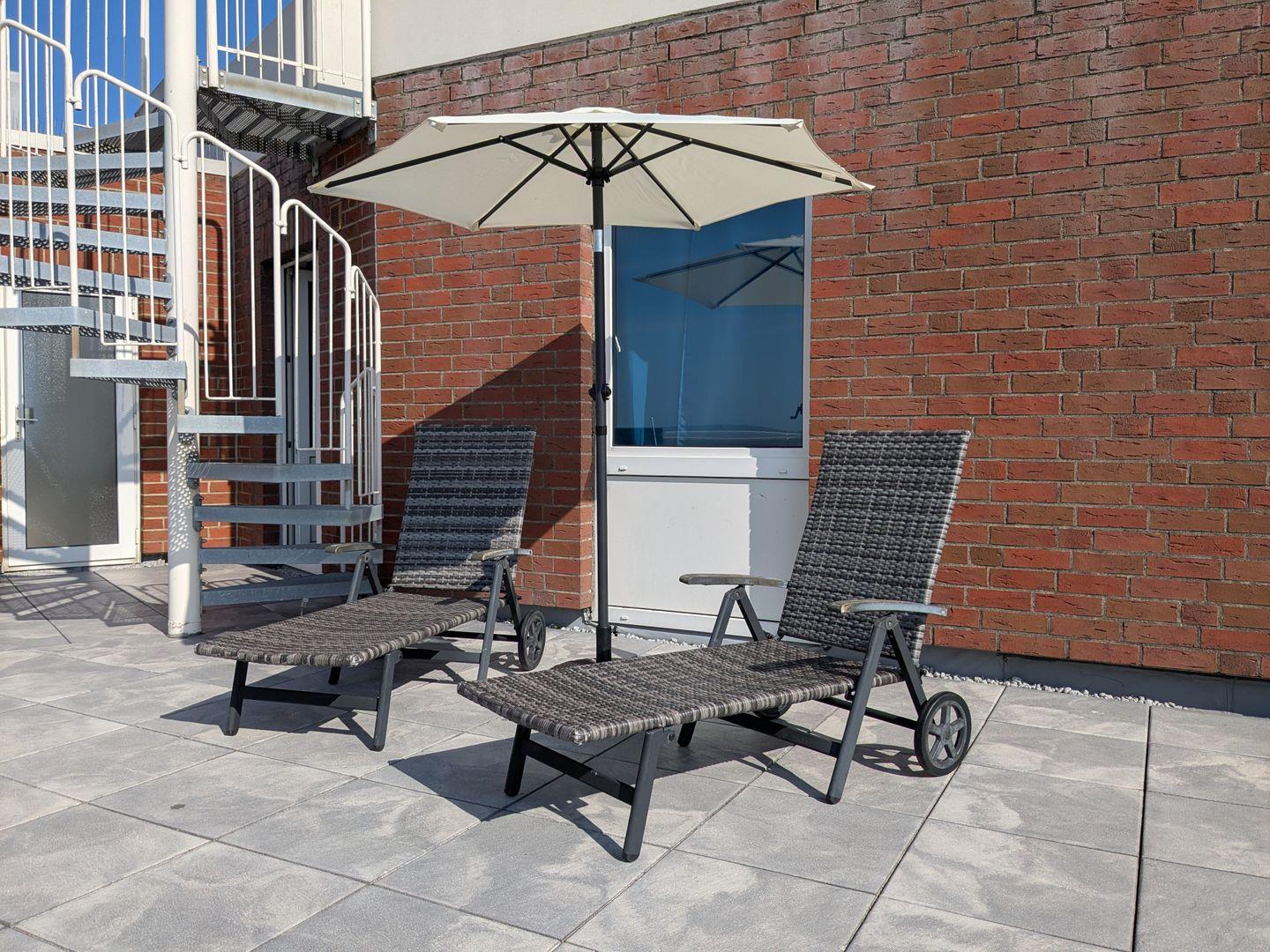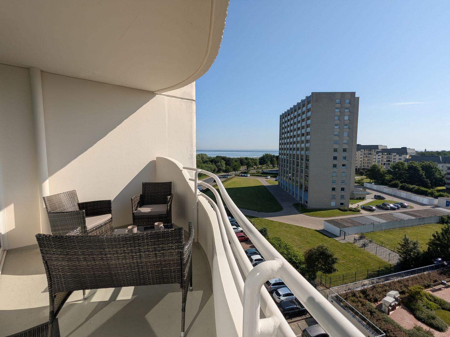Neben einem möblierten Balkon mit Meerblick erwartet Sie in dieser FeWo eine große Dachterrasse. Sie ist mit 2 Sonnenliegen und einem Sonnenschirm ausgestattet. Bei Wind und Wetter können Sie auf dem Balkon die Aussicht auf den Weltschifffahrtsweg und die frische Nordseeluft genießen.