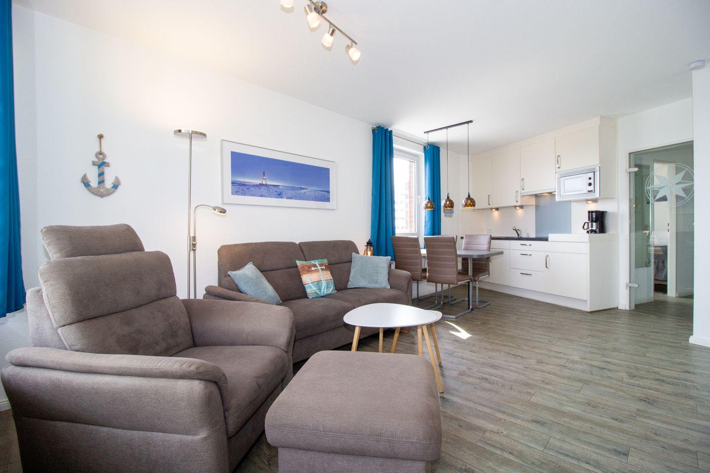 Mit einer modernen Einrichtung und viel Liebe zum Detail entpuppt sich die 2-Zimmer Ferienwohnung als wunderbares zu Hause auf Zeit an der Nordsee. Mit 43 m² Größe eignet sich das Urlaubsdomizil perfekt für Einzelreisende, Paare oder auch kleine Familien. Großzügigkeit ist hier Programm: Von dem Wohnbereich bis hin zu der großen Dachterrasse. Zusätzlich erwartet Sie ein fabelhafter Ausblick auf die Nordsee in Richtung Weltschifffahrtsweg.