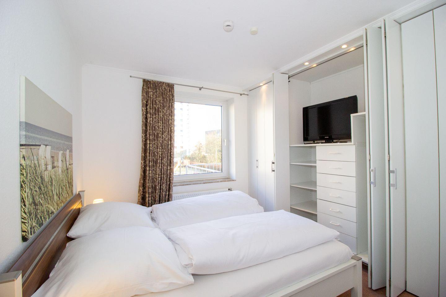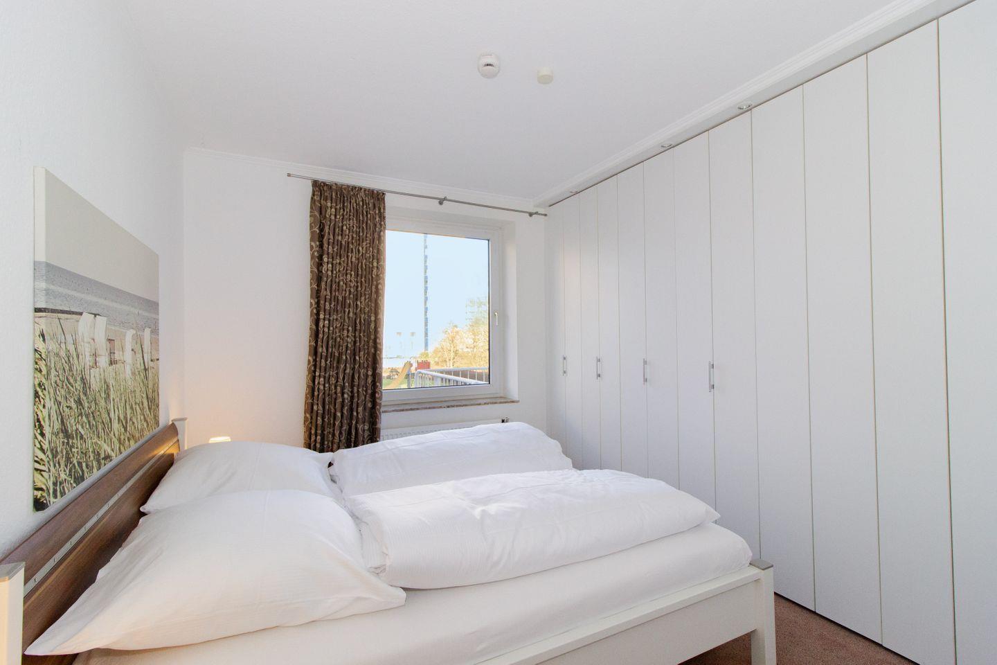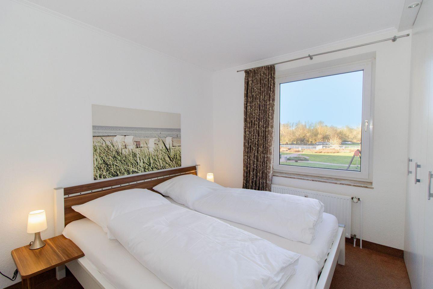 Haus "Trafalgar", Typ D, Appartement-Nr. 150, bis 4 Pers., 1. Etage, ca. 70 qm, Nord-/Ostseite (ohne Meerblick), Wohnzimmer mit großer Couch, 1. Schlafzimmer mit Doppelbett, 2. Schlafzimmer mit zwei Einzelbetten (eins davon als Schrankbett), separate Küche mit Backofen, Geschirrspüler, Ceranfeld und Mikrowelle, Bad/WC, Balkon, Kabel-TV, WLAN im App., Haustiere sind nicht gestattet, Nichtraucherwohnung, Tiefgaragenstellplatz, Strandkorb im Sommer 2026.