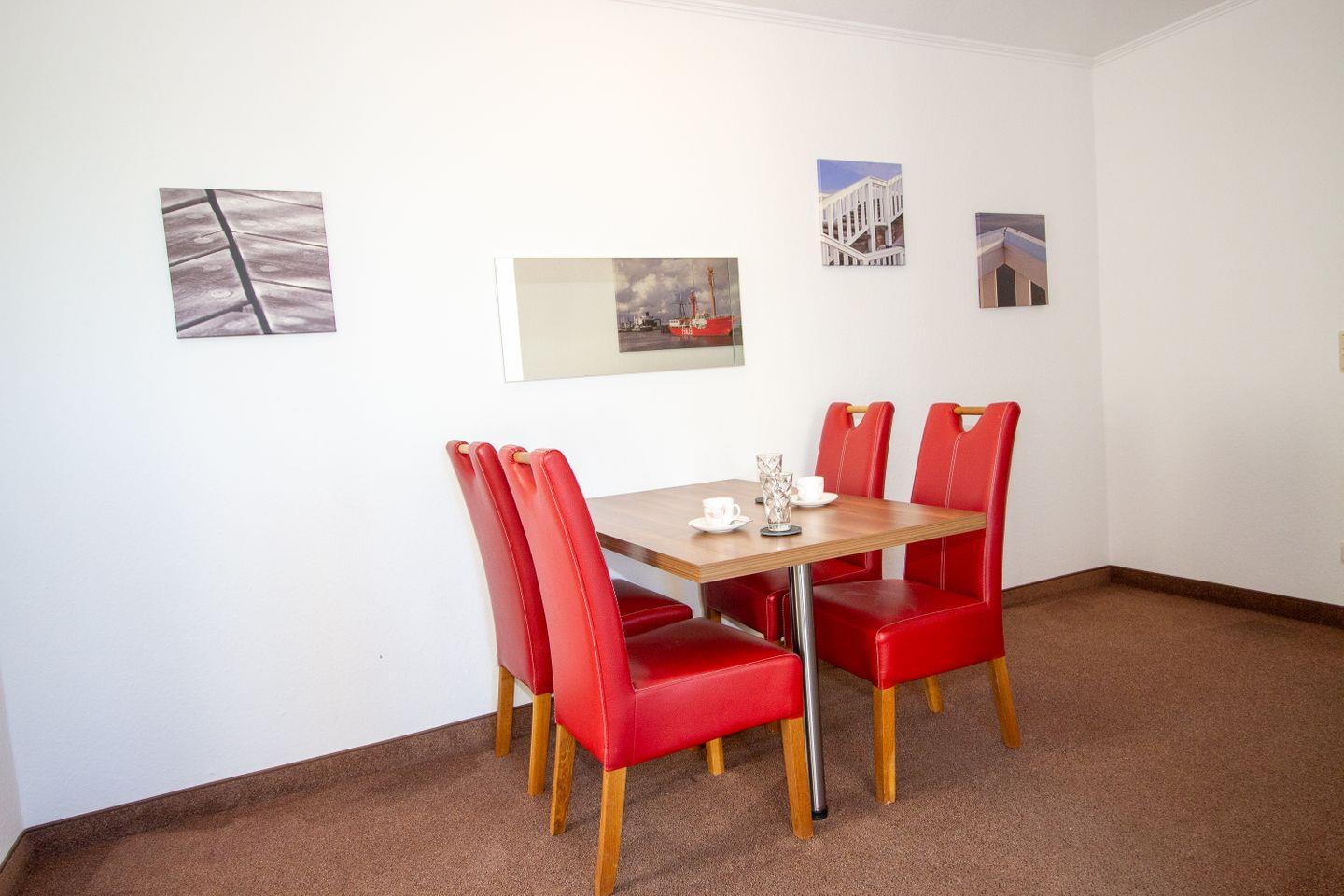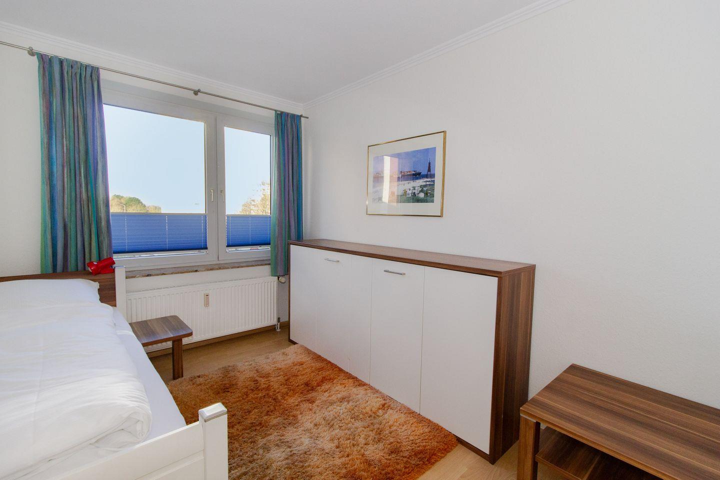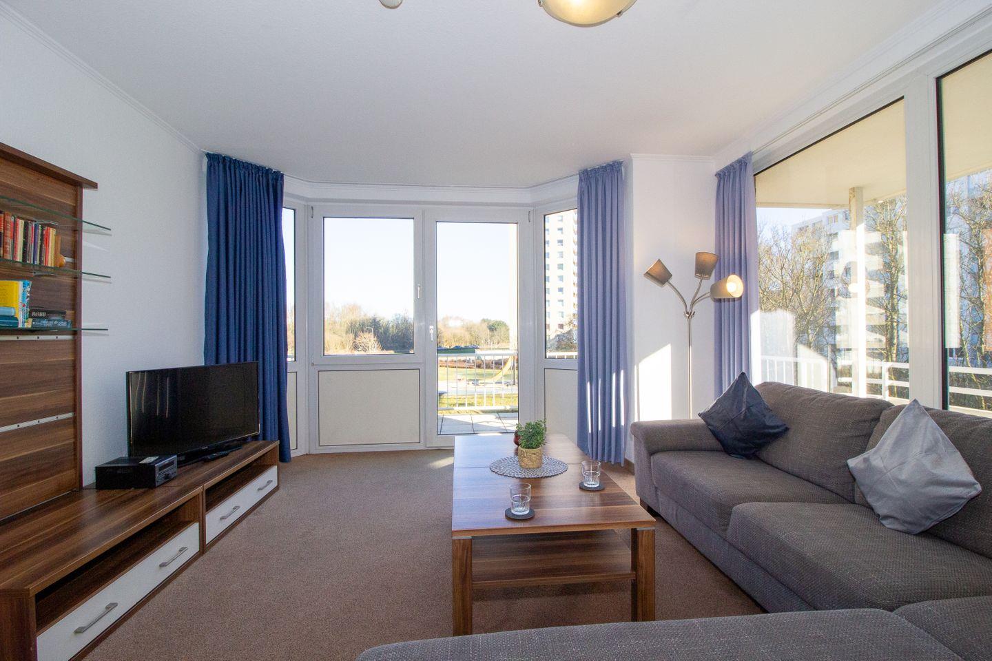 Haus "Trafalgar", Typ D, Appartement-Nr. 150, bis 4 Pers., 1. Etage, ca. 70 qm, Nord-/Ostseite (ohne Meerblick), Wohnzimmer mit großer Couch, 1. Schlafzimmer mit Doppelbett, 2. Schlafzimmer mit zwei Einzelbetten (eins davon als Schrankbett), separate Küche mit Backofen, Geschirrspüler, Ceranfeld und Mikrowelle, Bad/WC, Balkon, Kabel-TV, WLAN im App., Haustiere sind nicht gestattet, Nichtraucherwohnung, Tiefgaragenstellplatz, Strandkorb im Sommer 2026.