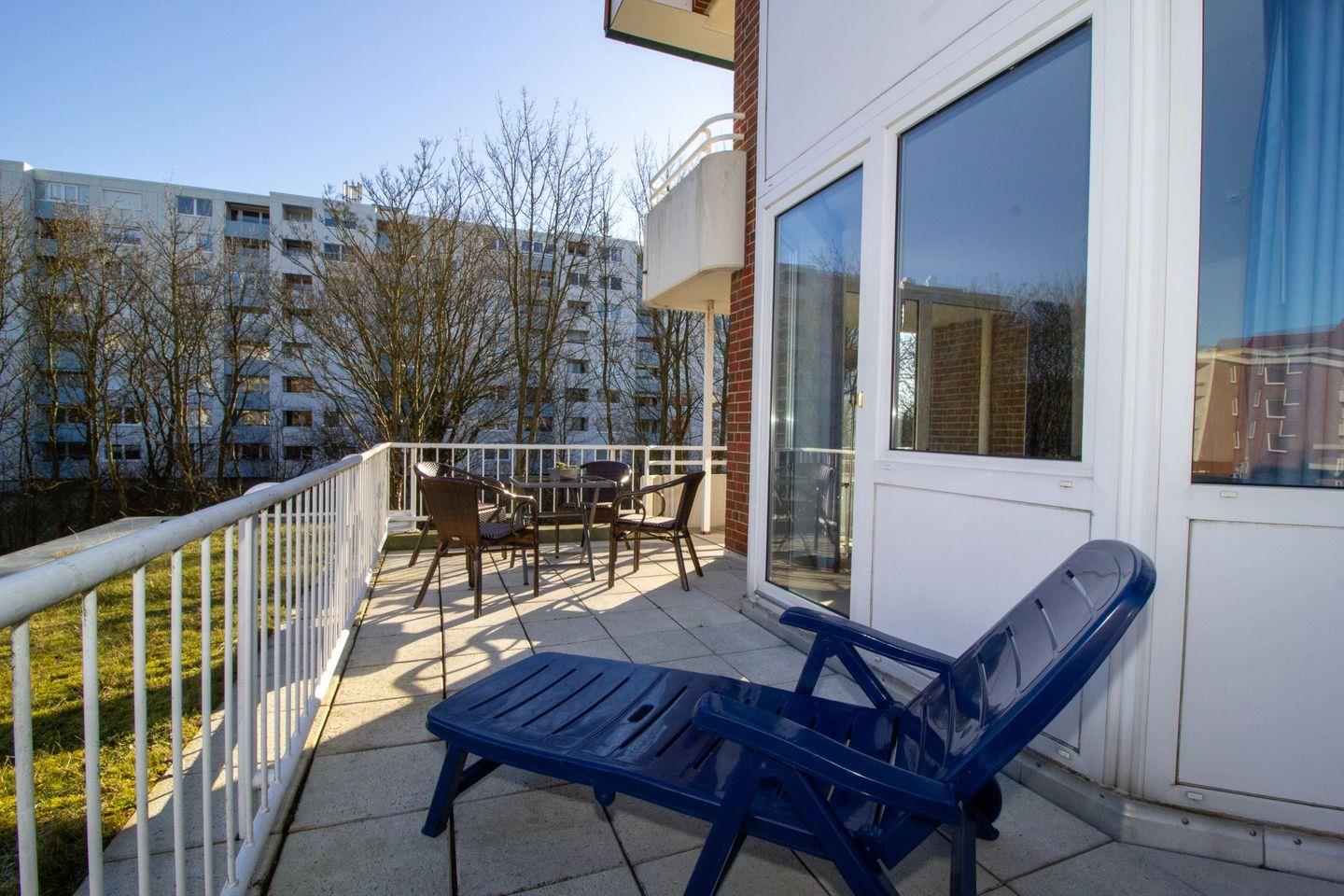 Der Balkon ist sehr großzügig gestaltet. Neben der Korbstühlen kann auch auf einer Sonnenliege (ohne Auflage) auf dem Balkon verweilt werden.