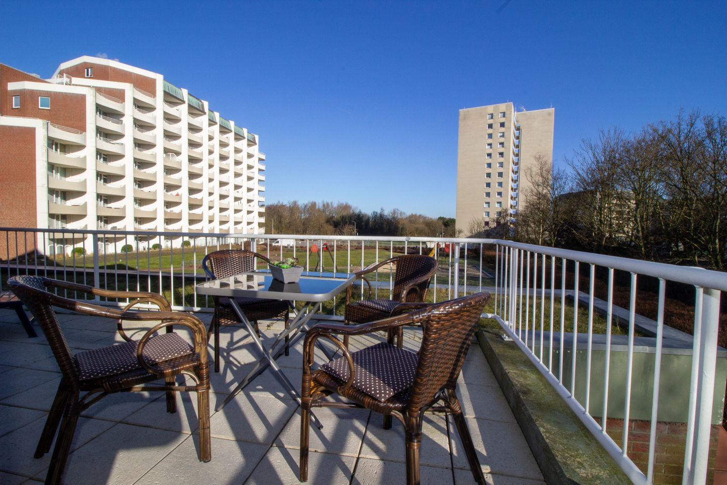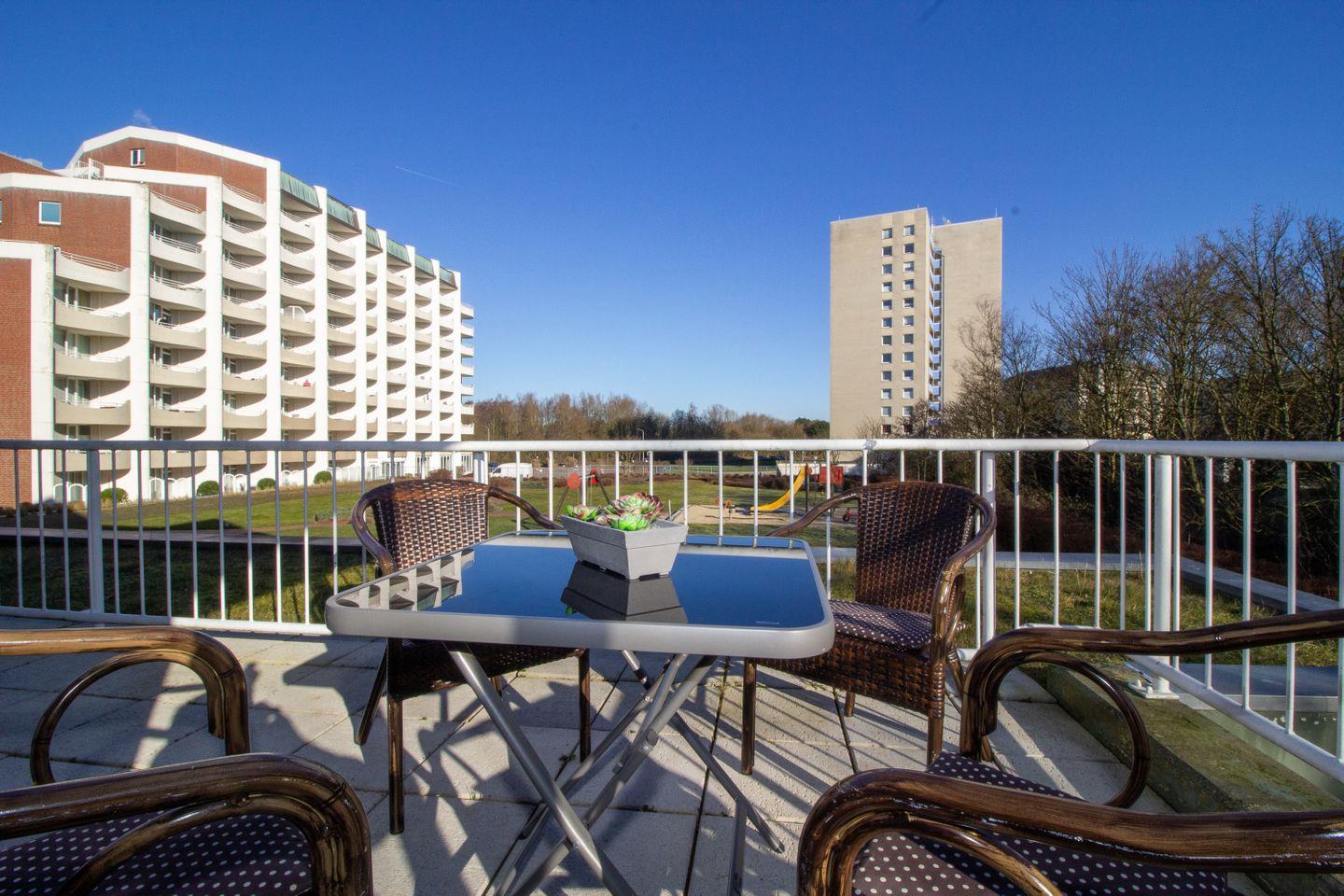 Helles 3-Zimmer-Appartement in Cuxhaven-Döse mit großem Balkon, Schwimmbad, Sauna und Strandkorb am Strand.