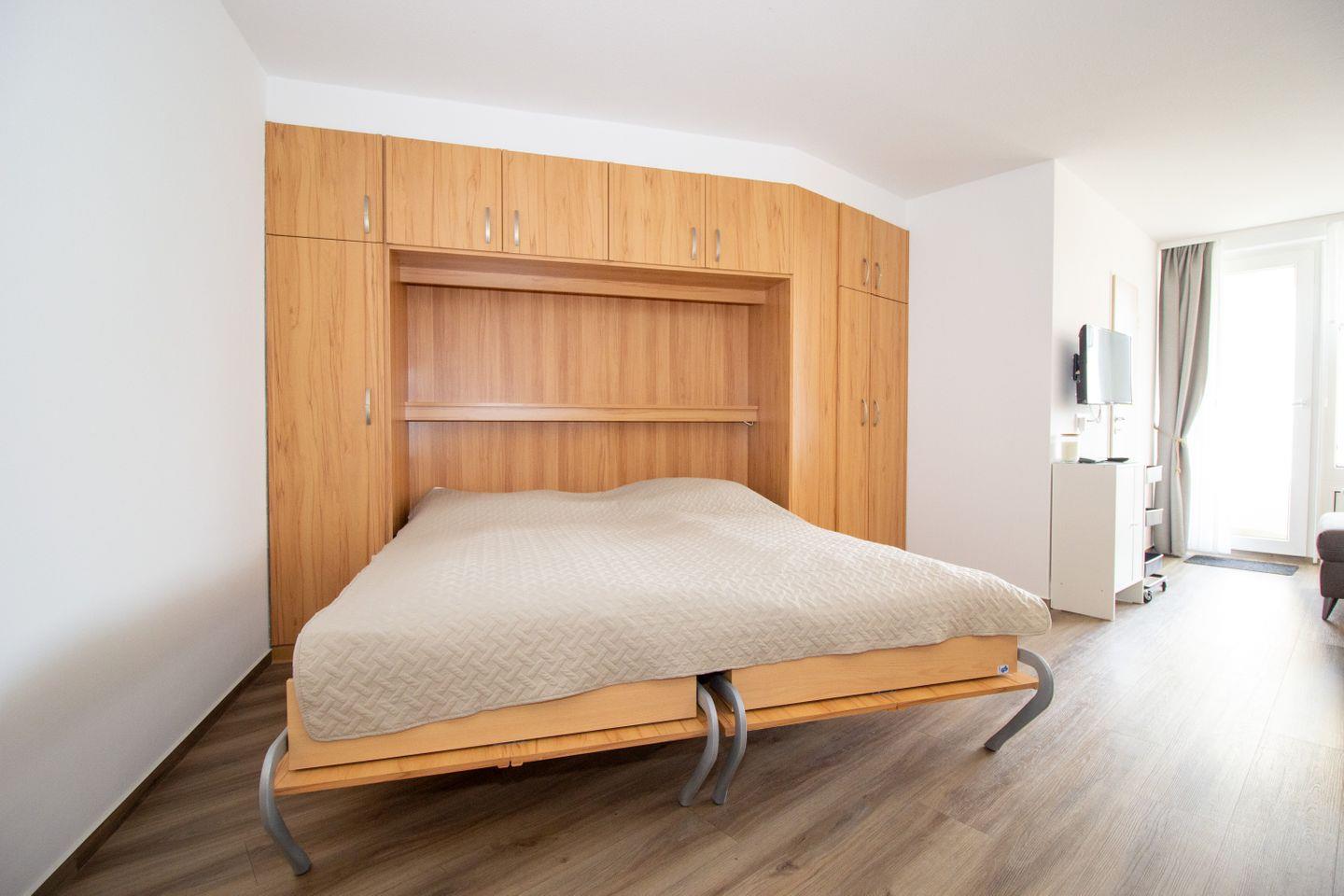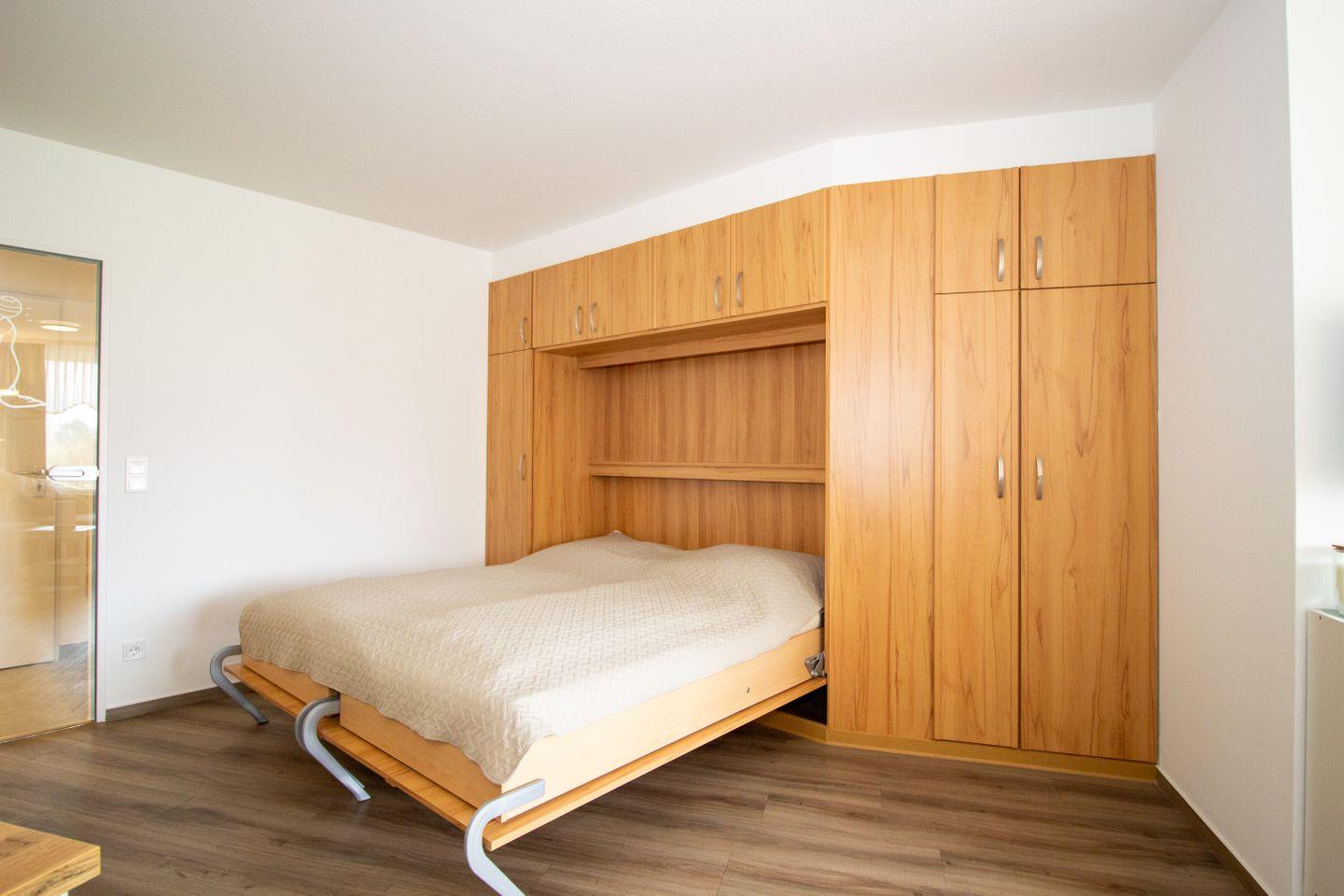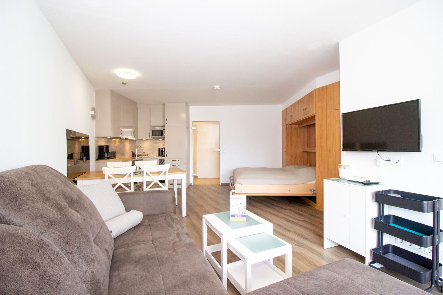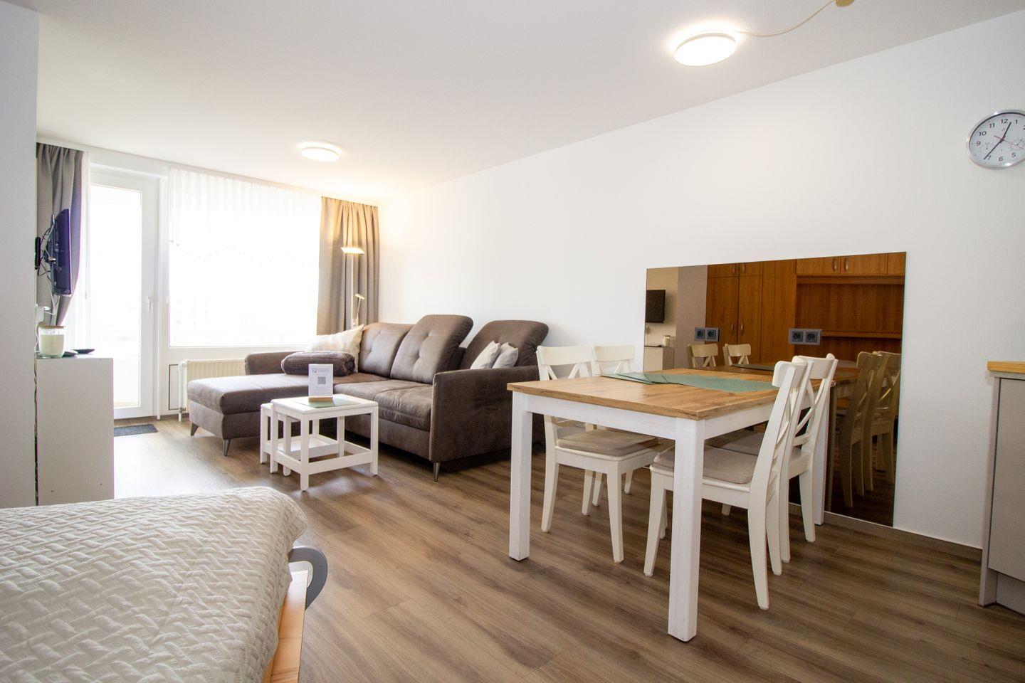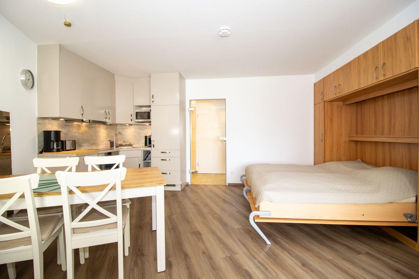 Die Ferienwohnung verfügt über einen Wohn/Schlafraum, ein kleines separates Schlafzimmer sowie ein Badezimmer mit Dusche. Die offene Küche ist modern ausgestattet und grenzt direkt an das Wohnzimmer an. Zur Ausstattung gehören ein 4-Platten-Ceranfeld, Backofen, Mikrowelle, Kühlschrank, Toaster, Wasserkocher, Kaffeemaschine sowie komplettes Geschirr und Besteck. Dies ermöglicht eine flexible Selbstversorgung während Ihres Aufenthalts. Des Weiteren steht eine Spülmaschine zur Verfügung, welche den Abwasch erleichtert.