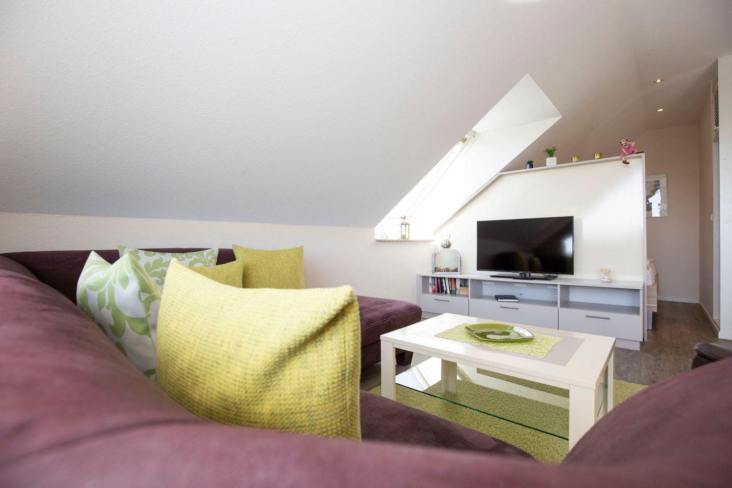 Haus "Trafalgar", Typ B-Süd, App.-Nr. "341", bis 2 Pers., 3. Etage, Südseite (ohne Meerblick), Wohn/Schlafraum mit Doppelbett, Küchenzeile mit 4-Platten-Ceranfeld und Mikrowelle, Dusche/WC, ca. 40 qm Größe mit Dachschrägen, Balkon, Kabel-TV, kostenl. WLAN-Zugang im App., Tiefgaragenstellplatz, Nichtraucherwohnung, Haustiere sind nicht gestattet, Strandkorb im Sommer 2026.