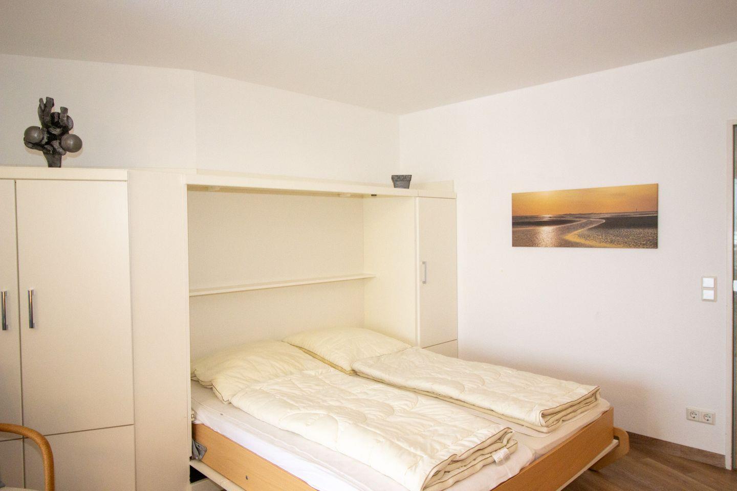 Haus "Lord Nelson", Typ 2, App.-Nr. 404, bis 3 Personen, 4. Etage, ca. 40 qm, Lage Richtung Weltnaturerbe Wattenmeer, Meerblick Richtung Neuwerk, Wohn/Schlafbereich mit Schrankbett, sep. Schlafzimmer mit Einzelbett, Dusche/WC, Küchenzeile mit 3-Platten Ceranfeld, Mikrowelle und Geschirrspüler, Balkon, Kabel-TV, Tiefgaragenstellplatz, Nichtraucherappartement, Haustiere sind auf Anfrage erlaubt, Strandkorb im Sommer 2026.