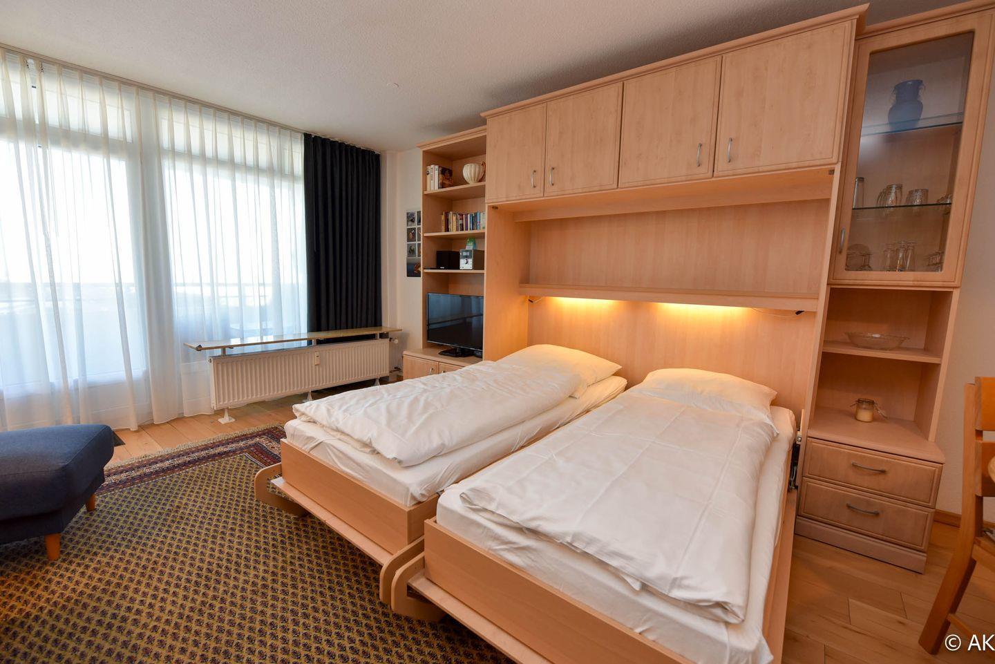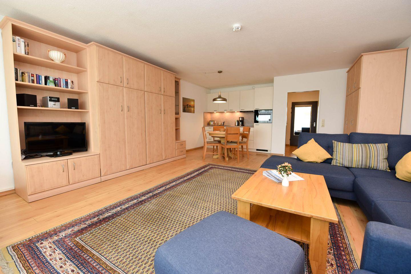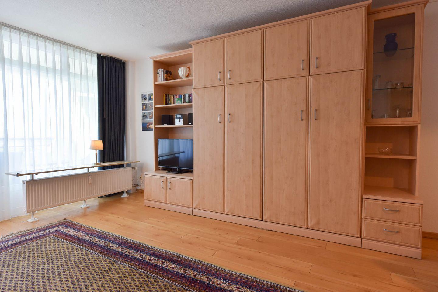Die komfortable gestaltete Ferienwohnung umfasst einen kombinierten Wohn- und Schlafbereich, ausgestattet mit praktischen Schrankklappbetten für eine maximale Raumausnutzung. Die integrierte Küchenzeile ist mit allem ausgestattet, was Sie für Ihren Aufenthalt benötigen: ein Kühlschrank, eine Kaffeemaschine, ein Wasserkocher, ein Toaster sowie ein E-Herd mit Cerankochfeld stehen Ihnen zur Verfügung. Genießen Sie Ihre Lieblingssendungen auf unserem Flachbildfernseher und profitieren Sie von dem Komfort eines neu renovierten Bades mit einer bodentiefen Dusche und WC.