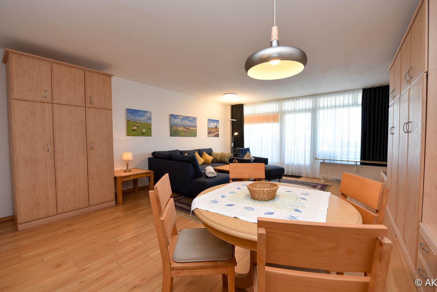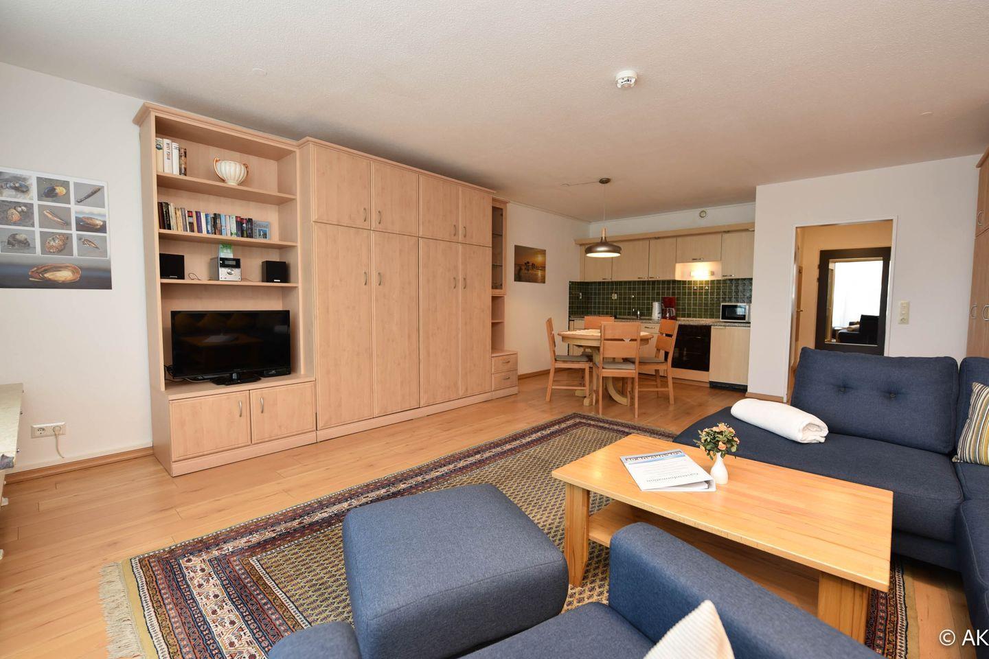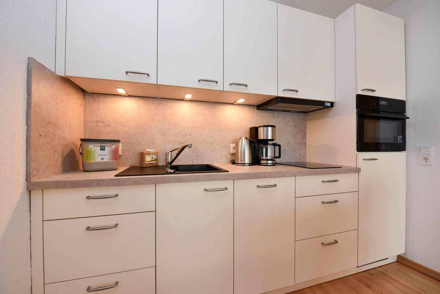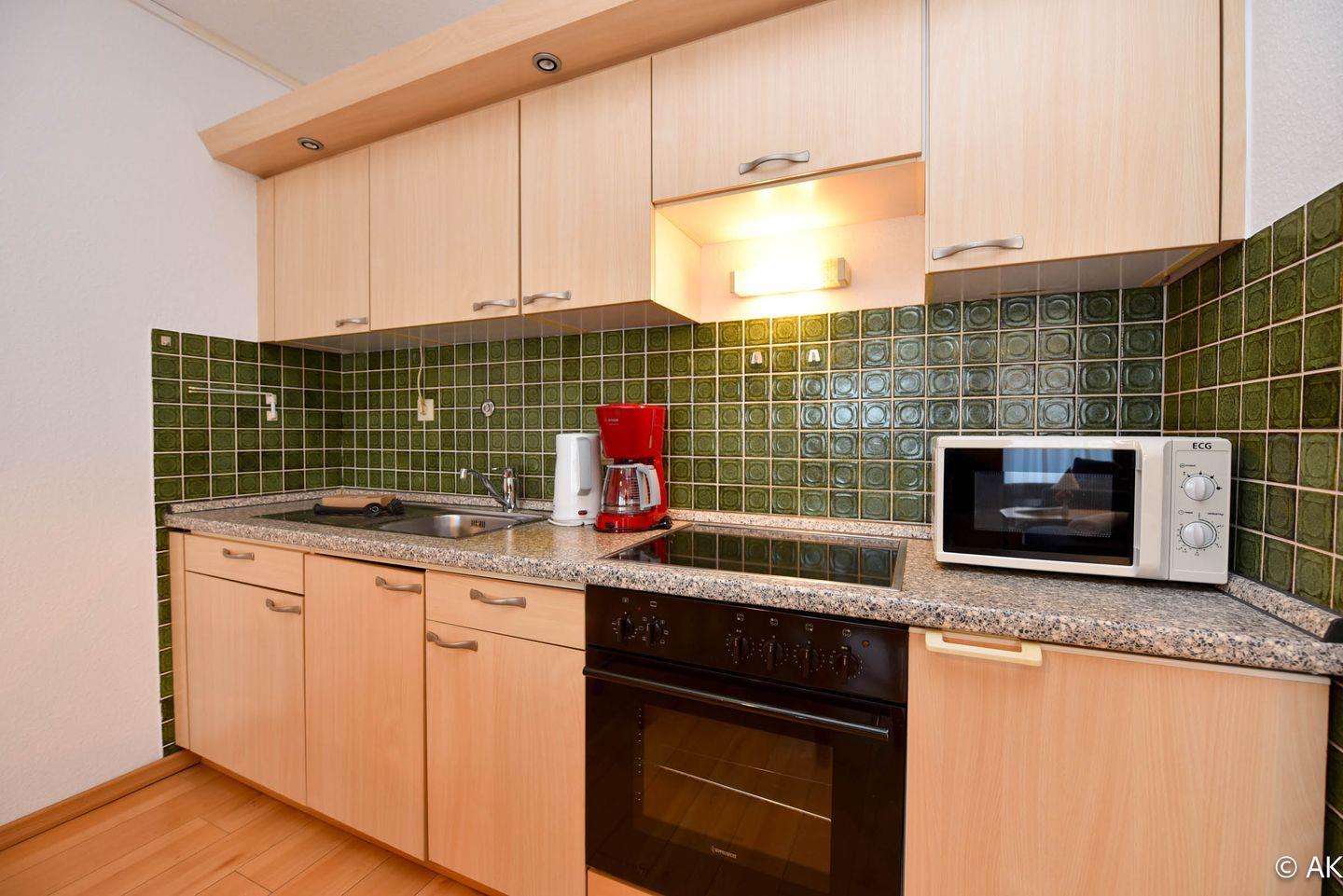 Die komfortable gestaltete Ferienwohnung umfasst einen kombinierten Wohn- und Schlafbereich, ausgestattet mit praktischen Schrankklappbetten für eine maximale Raumausnutzung. Die integrierte Küchenzeile ist mit allem ausgestattet, was Sie für Ihren Aufenthalt benötigen: ein Kühlschrank, eine Kaffeemaschine, ein Wasserkocher, ein Toaster sowie ein E-Herd mit Cerankochfeld stehen Ihnen zur Verfügung. Genießen Sie Ihre Lieblingssendungen auf unserem Flachbildfernseher und profitieren Sie von dem Komfort eines neu renovierten Bades mit einer bodentiefen Dusche und WC.