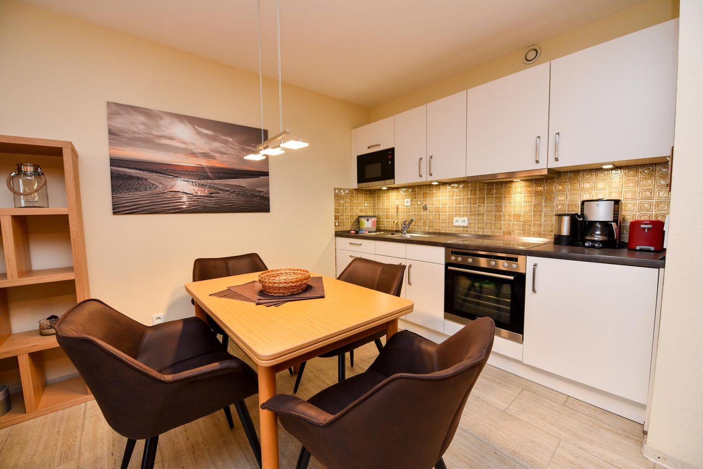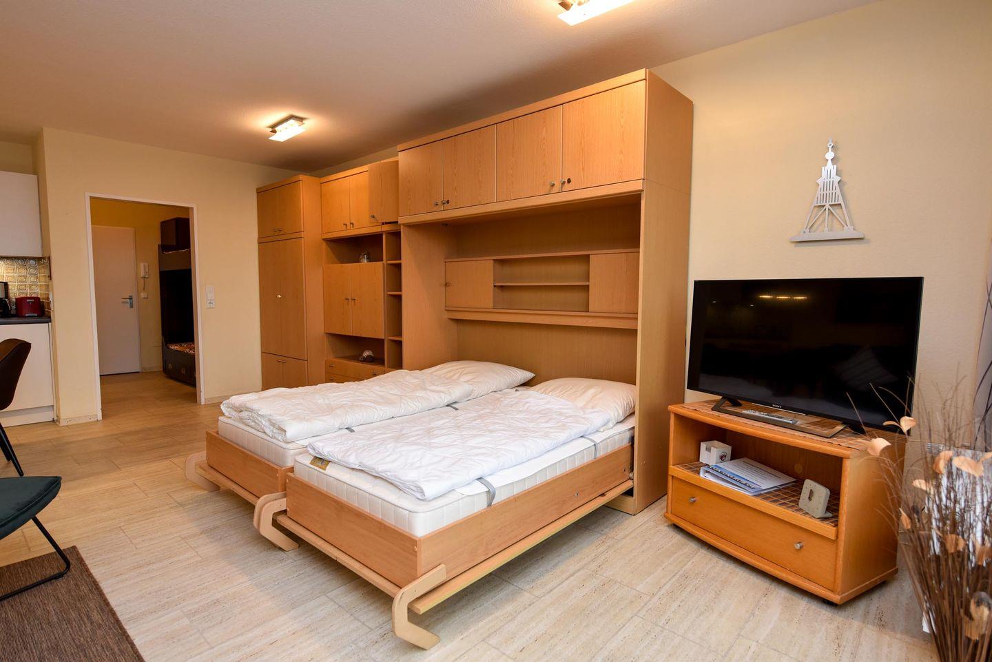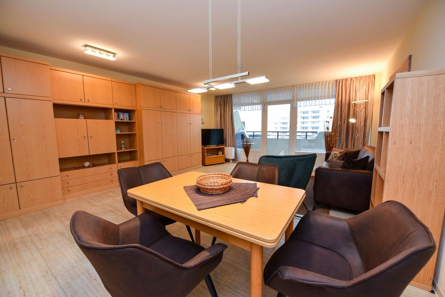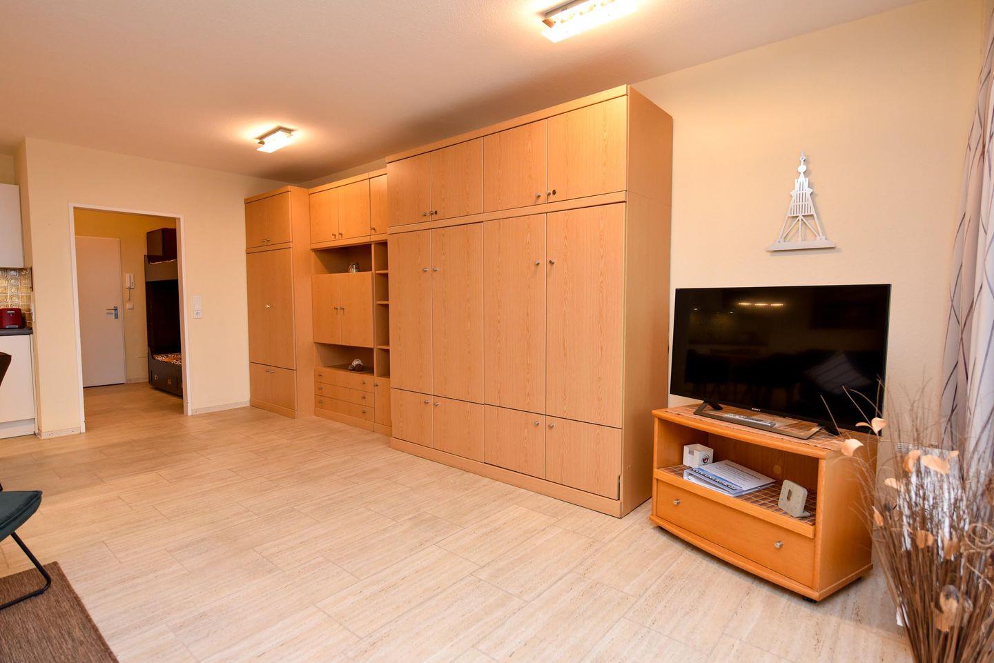 Die in der 4. Etage gelegene Wohnung mit Balkon und Seesicht ist aufgeteilt in einen Wohn-/Schlafraum mit Schrankklappbetten und Küchenzeile mit Kühlschrank, Kaffeemaschine, Wasserkocher, Mikrowelle, Toaster, E-Herd; Flachbildfernseher ist vorhanden; Bad mit Dusche und WC; Balkon. Pkw-Tiefgaragenstellplatz.