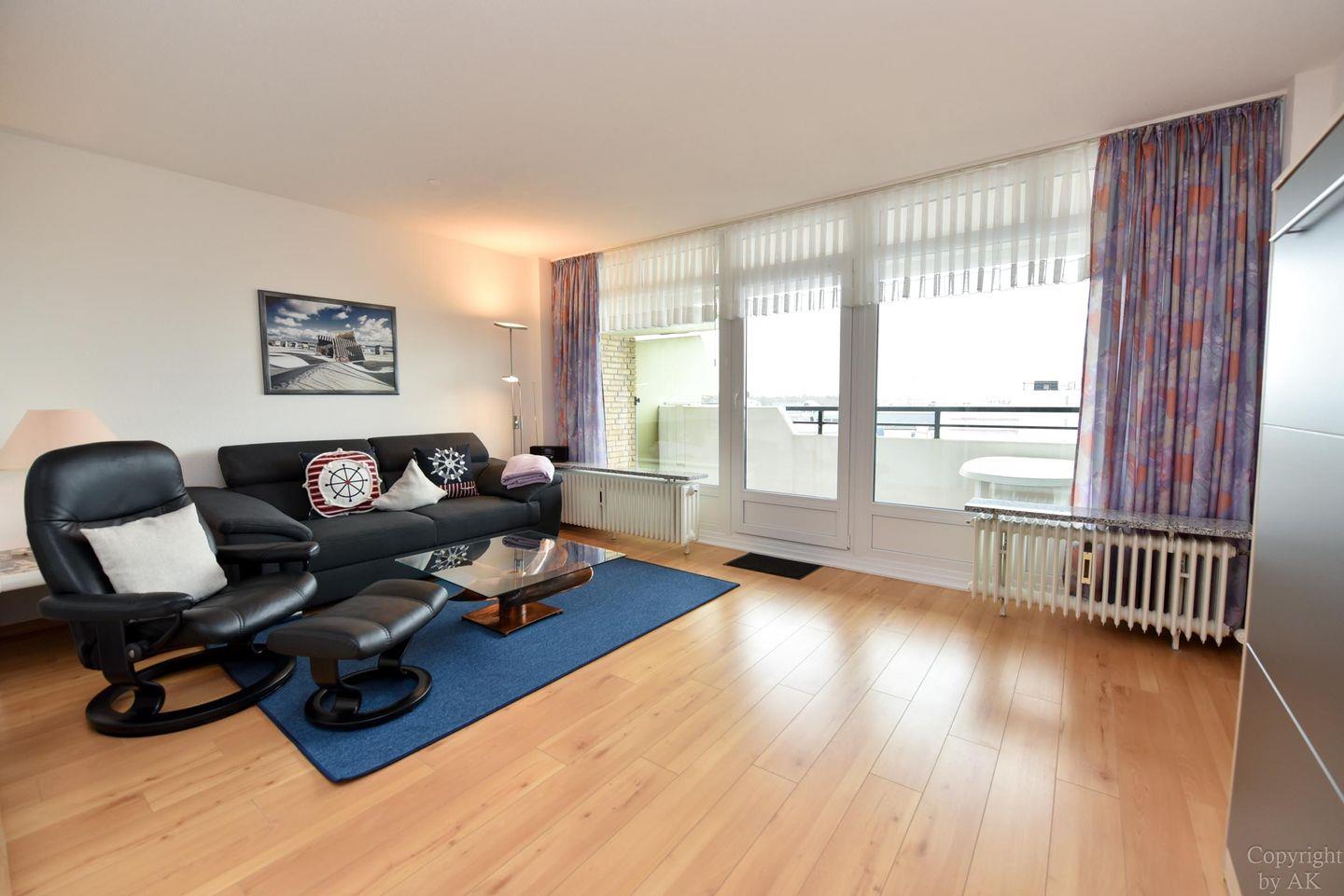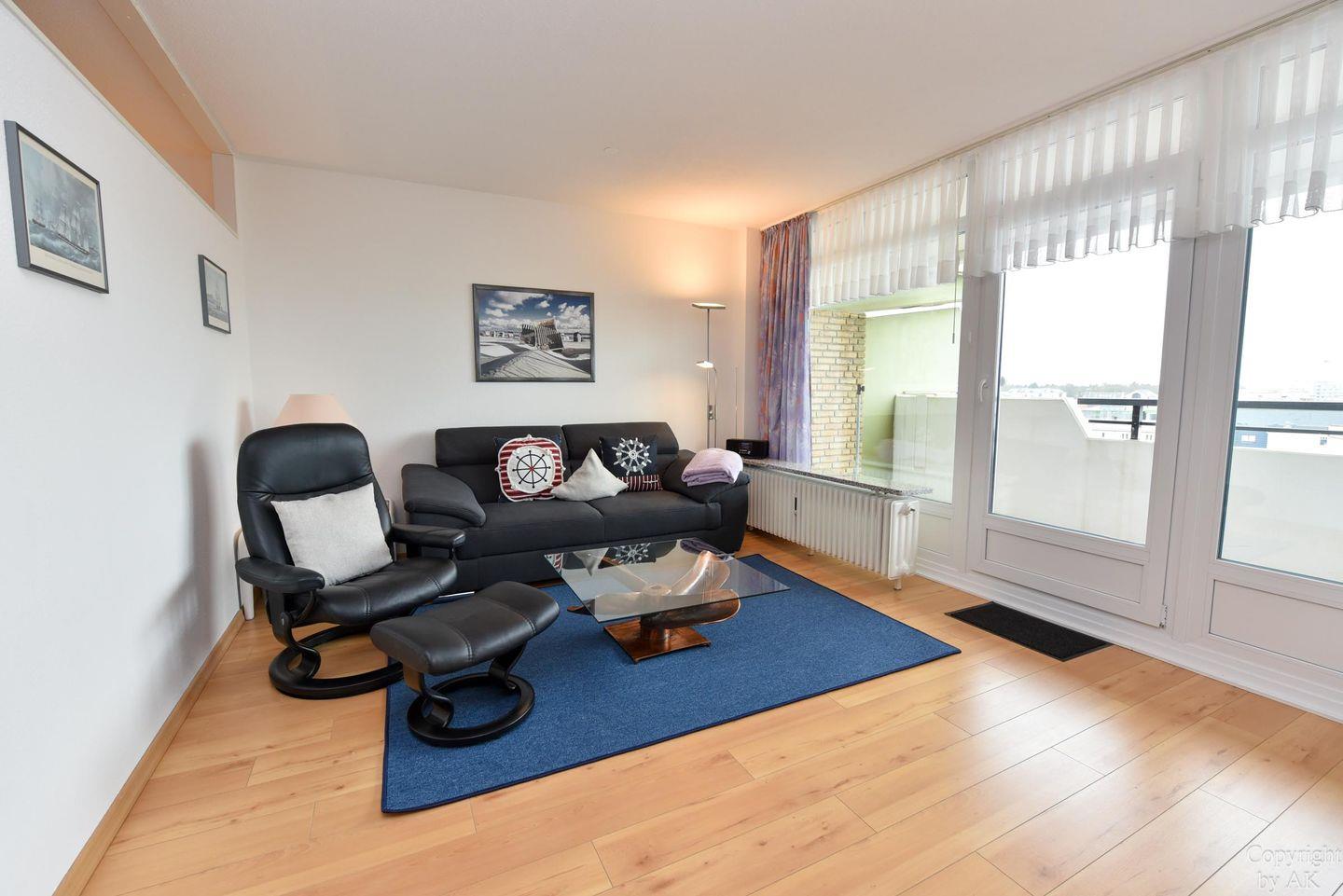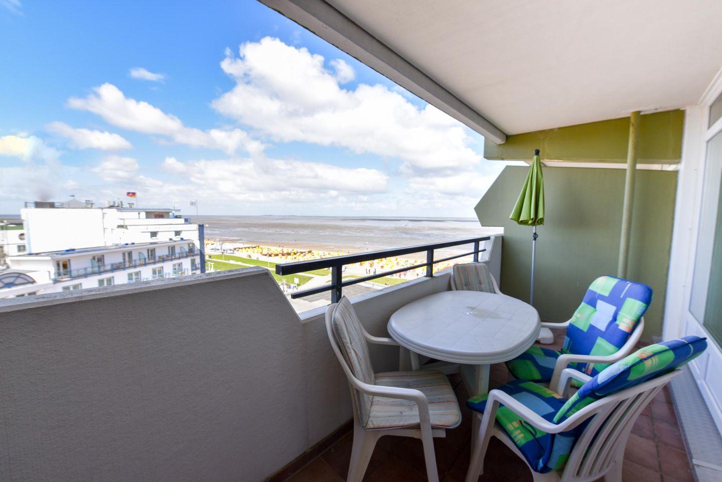 Die Wohnung Nr. 87 im Haus Panorama liegt in der 6. Etage und bietet einen beeindruckenden Seeblick in Richtung der Insel Neuwerk.