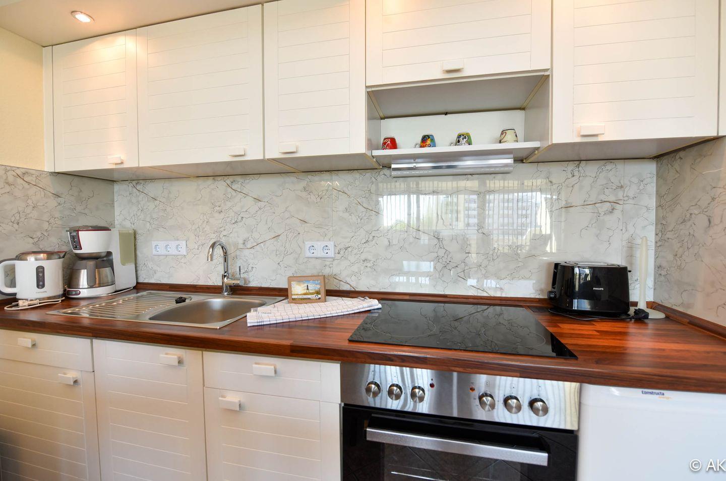 1 Wohn-/Schlafzimmer mit Schrankklappbetten; Küchenzeile mit Kühlschrank, Kaffeemaschine, E-Herd; Flachbildfernseher vorhanden; Bad mit Dusche u. WC; Pkw-Tiefgaragenstellplatz. Lage: 3. Etage, Seesicht vom Balkon
