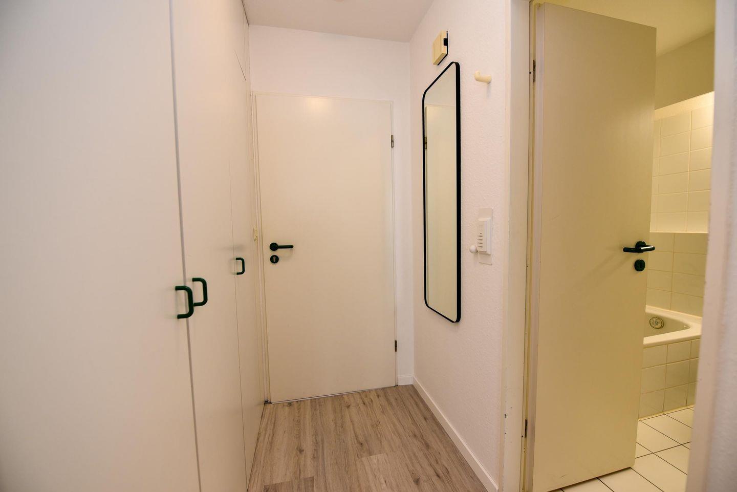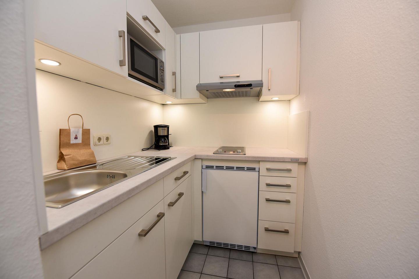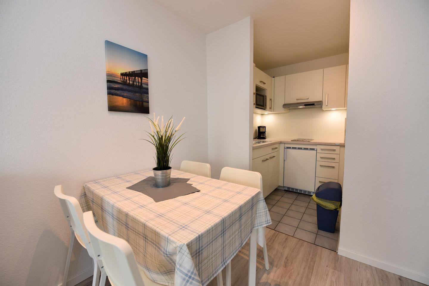 Das Appartement wurde frisch renoviert und ist vollausgestattet, um Ihnen einen komfortablen Aufenthalt zu ermöglichen. Es bietet ein Schlafzimmer mit zwei Einzelbetten sowie ein Wohnzimmer mit einem Schlafsofa und einer praktischen Küchenzeile. In der Küchenzeile finden Sie einen Kühlschrank und eine Mikrowelle für Ihre kulinarischen Bedürfnisse.