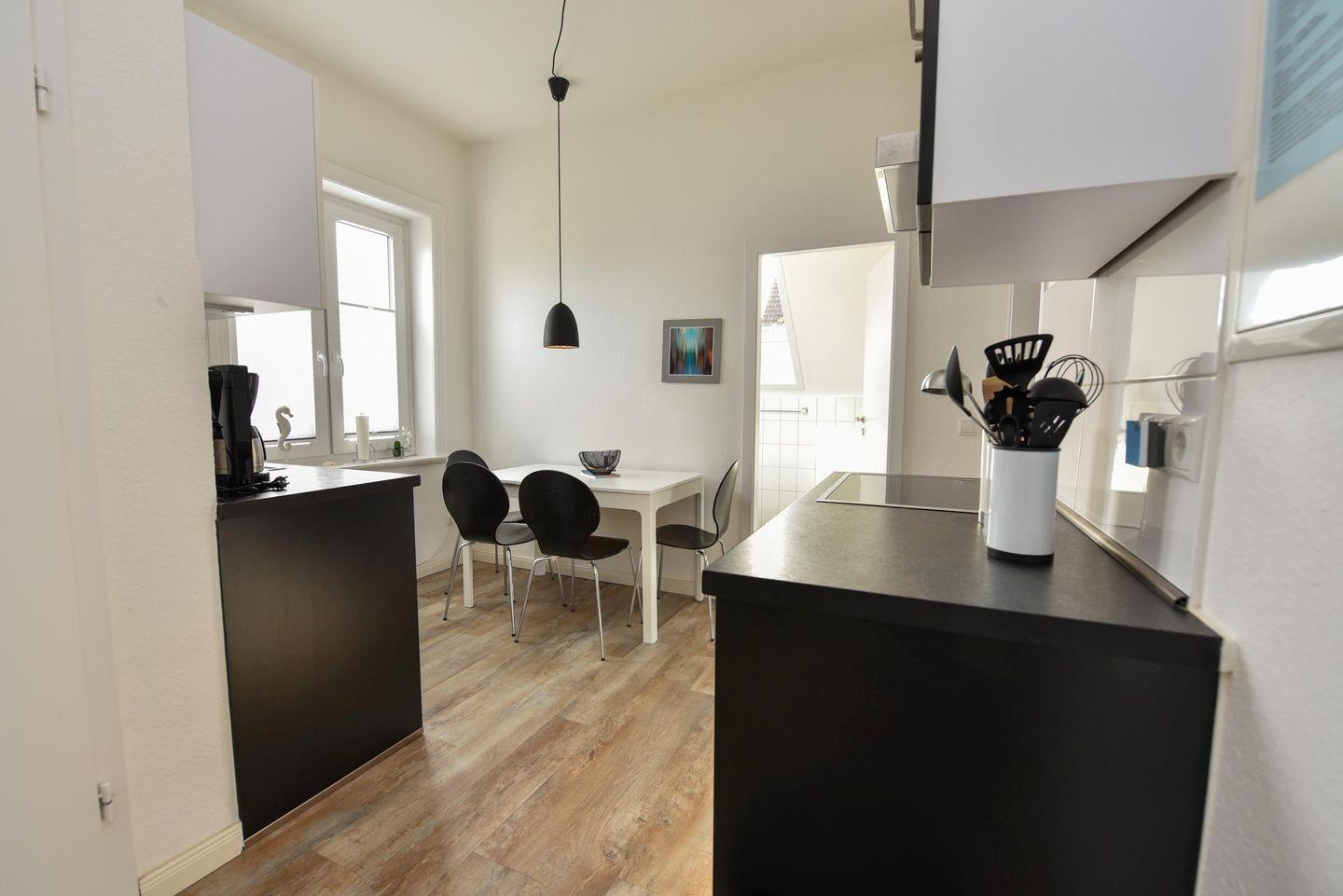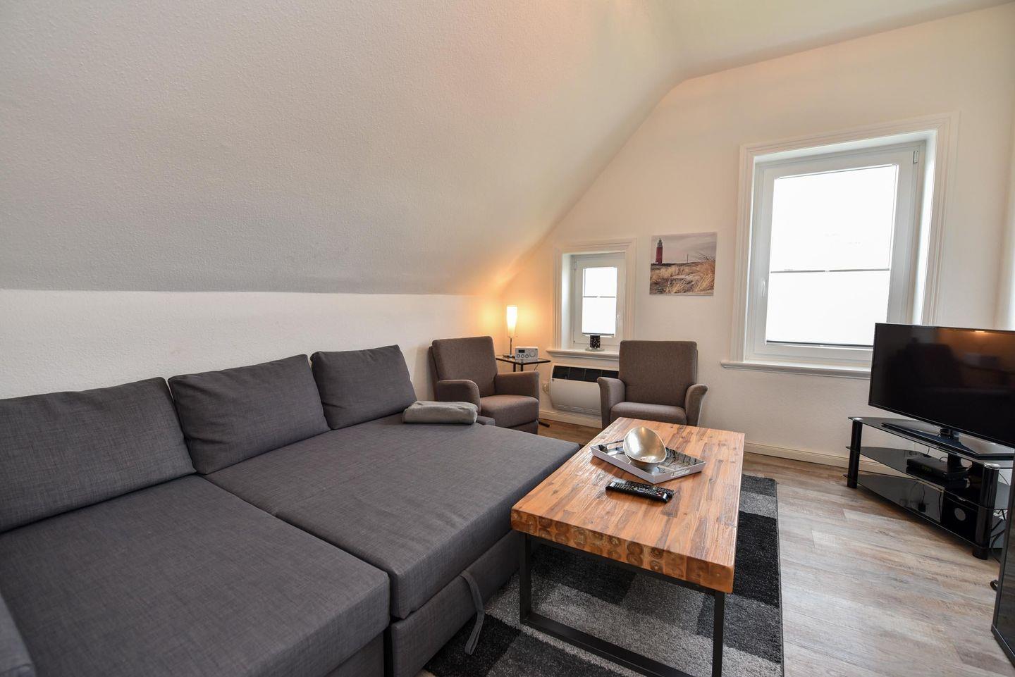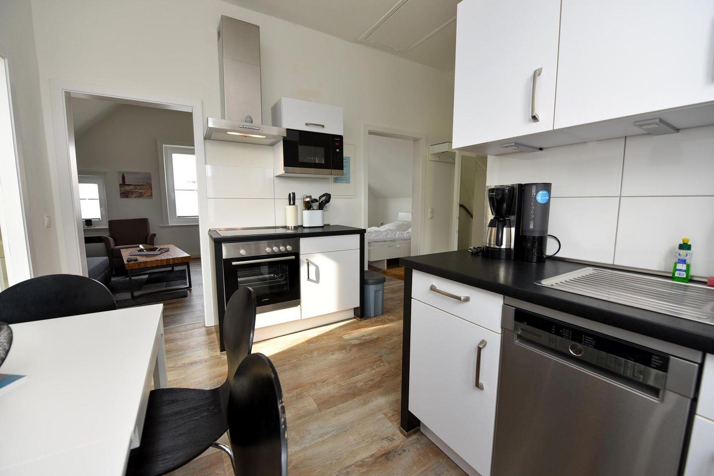 Die Wohnung Brise 2 im Obergeschoß ist eine Wohnung für vier Personen, bestehend aus einem Wohnzimmer mit einer Doppelschlafcouch, einem Schlafzimmern mit Doppelbett, einem Badezimmer und einem Gäste WC sowie einem Koch- und Essbereich. Zur Ausstattung der Küche zählen unter anderem Herd, Backofen, Microwelle, Kühl- und Gerfrierkombination, Geschirrspüler, Kaffeemaschine, Wasserkocher uvm.