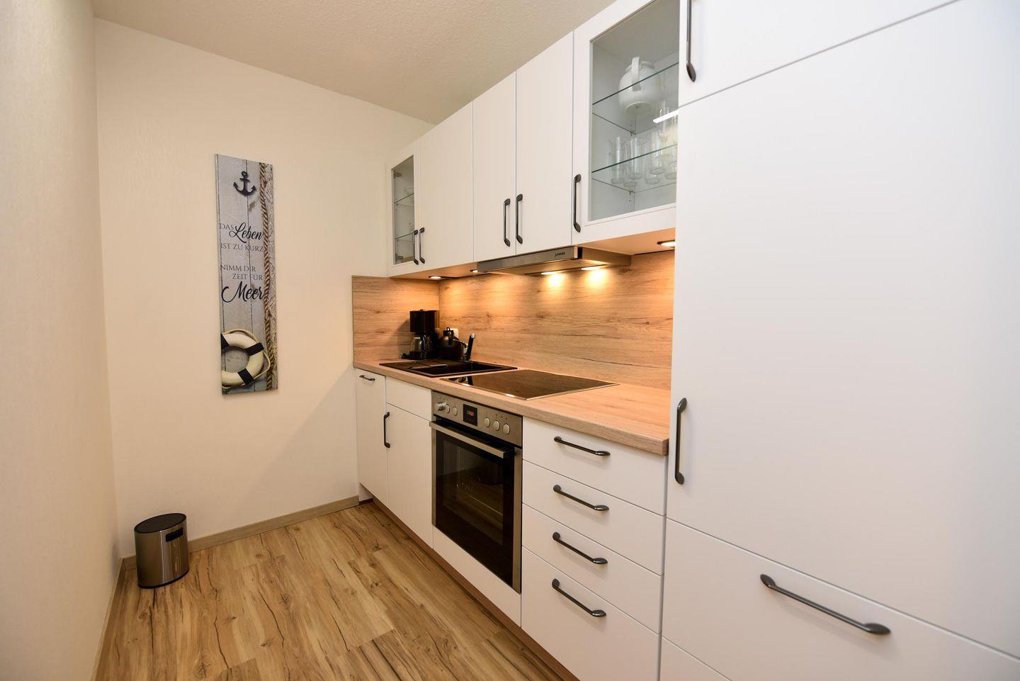 Die Wohnung verfügt über 1 Wohnzimmer mit gemütlicher Sitzecke, eine Schlafnische mit einem bequemen Boxspingbett und eine moderne und voll ausgestattete Küchenzeile mit Kühlschrank, Kaffeemaschine, E-Herd/Backofen. Auch das hell geflieste Badezimmer mit bodentiefer Dusche und WC wurde in 2022 neu renoviert und entspricht modernstem Standard.