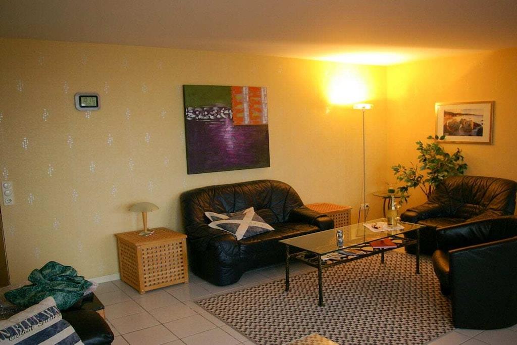 Sie erreichen die Ferienwohnung vom Haupteingang barrierrefrei mit dem Fahrstuhl. Von der geräumigen Wohndiele als "Wintergarten" gelangt man ins Wohnzimmer mit zwei Sofas, wobei eines auch als Schlafcouch genutzt werden kann. Für Unterhaltung sorgen das TV-Gerät mit DVD-Player, Stereoanlage, DVD´s, Bücher und eine Spielsammlung. Kostenloses WLan ist selbstverständlich ebenfalls vorhanden. Das Schlafzimmer hat direktem Zugang zur Terrasse. Die separate Küche ist voll ausgestattet mit Backofen und Ceranfeld, Geschirrspüler, Kühl-Kombi, Mikrowelle und allen erforderlichen Utensilien. Das großzügige Duschbad verfügt neben einem großen Spiegel und ausreichend Ablagen auch über einen beleuchteten Vergrößerungsspiegel und einen Föhn. In der Tiefgarage ist ein PKW-Stellplatz für Sie reserviert. Für Fahrräder gibt es einen abgeschlossenen Fahrradkeller.