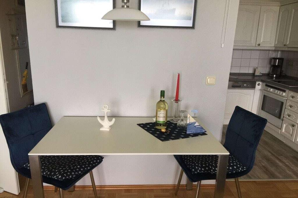 Die Ferienwohnung 21 im Haus Seeterrassen verzaubert mit direktem Blick auf die Elbmündung, einem der größten Schifffahrtswege der Welt. Neben dem Seeblick haben Sie freie Sicht auf die Grimmershörnbucht und den Grünstrand mit Strandkörben. Tags und Nachts können Sie die Schiffe vorbeifahren sehen. Die Wohnung wird regelmäßig auf den neusten Stand gebracht.neu eingerichtet, das Badezimmer komplett saniert. Entspannen Sie im hellen und freundlichen Wohn-/Esszimmer mit schöner Couchecke mit LCD-Fernseher und bereiten Sie in der schicken, offenen Küche mit Geschirrspüler Ihre Mahlzeiten zu, die Sie am Esstisch servieren können. Im Schlafzimmer gibt es ein Doppelbett. Ein freundliches Duschbad komplettiert die Ferienwohnung. Internet kostenlos.