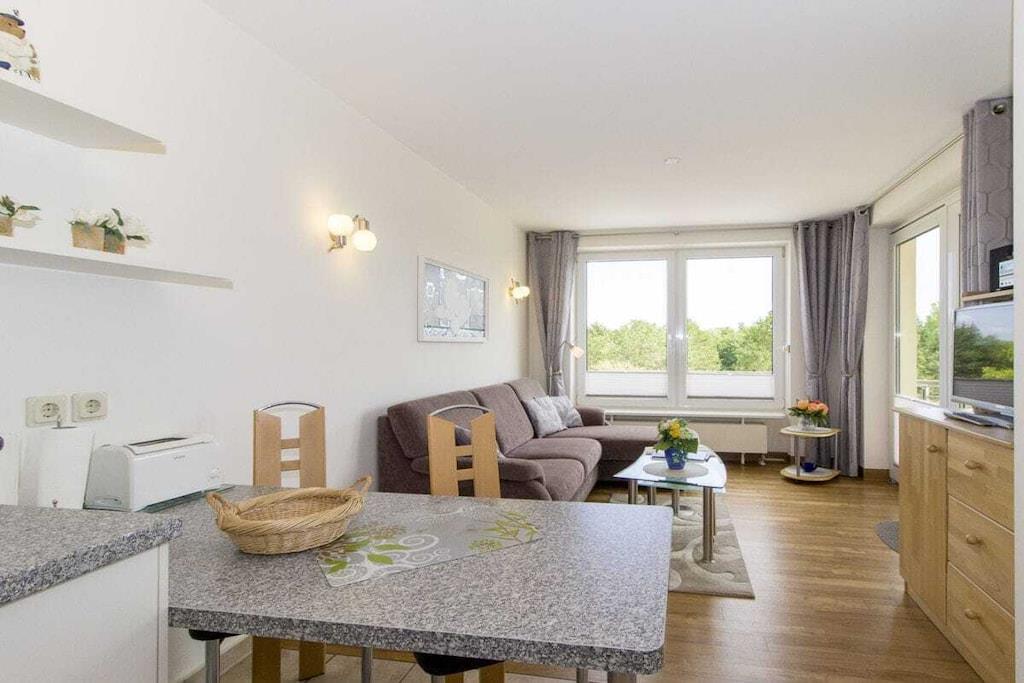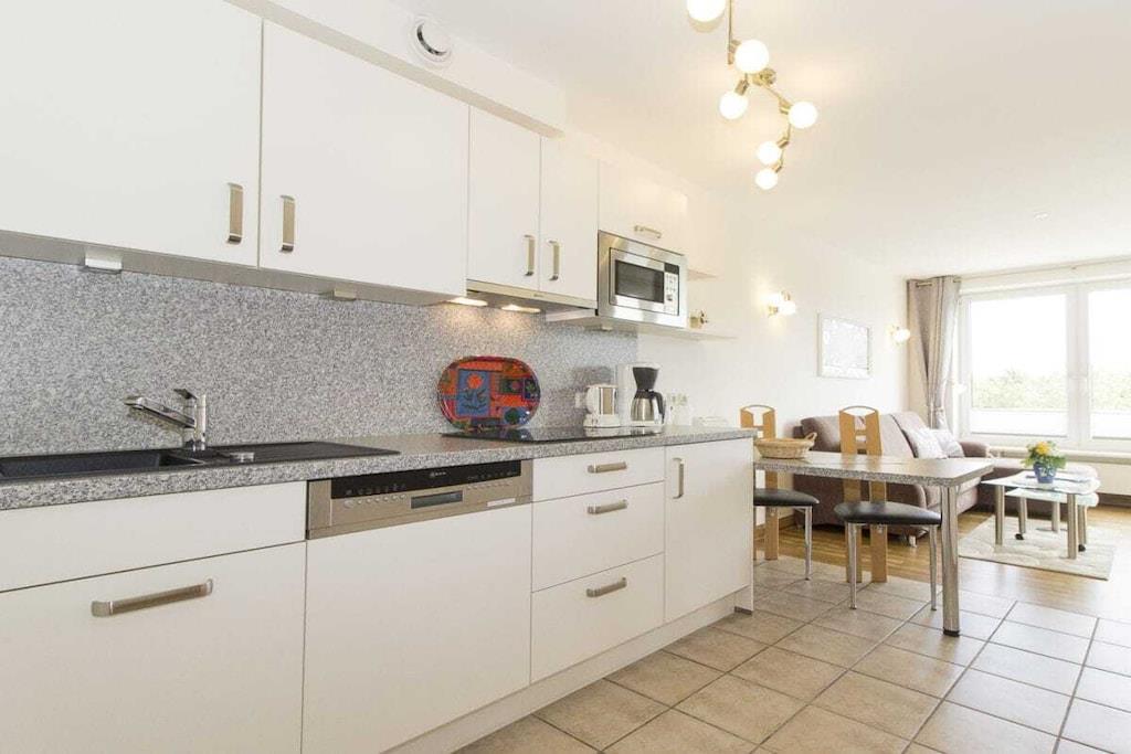 Haus Kurpark-Residenz, Ferienwohnung 204 mit seitlichem Seeblick für 3 - 4 Personen 47 m², Ostseite (Richtung "Kugelbake"), Wohnzimmer mit Schlafcouch und Flachbild-TV mit DVD, sep. Schlafzimmer mit Fenster zum Balkon, Doppelbett (180x200) und 2. TV mit DVD, neue Küchenzeile mit Geschirrspüler, 4-Platten-Cerankochfeld, Mikrowelle, Dusche/WC, Loggia, kostenloser Internetzugang, Nichtraucherwohnung, Tiefgaragenstellplatz, eigener Strandkorb von Mitte April-Mitte Oktober Ein großzügiges Hallenbad mit Gegenstromanlage sowie verschiedene Saunen bieten sportliche Betätigung und Entspannung. Ein Tischtennisraum, ein Fahrradkeller und eine separate Sonnenterrasse runden das Angebot ab. Münz-Waschmaschinen und -Trockner sind ebenfalls vorhanden.