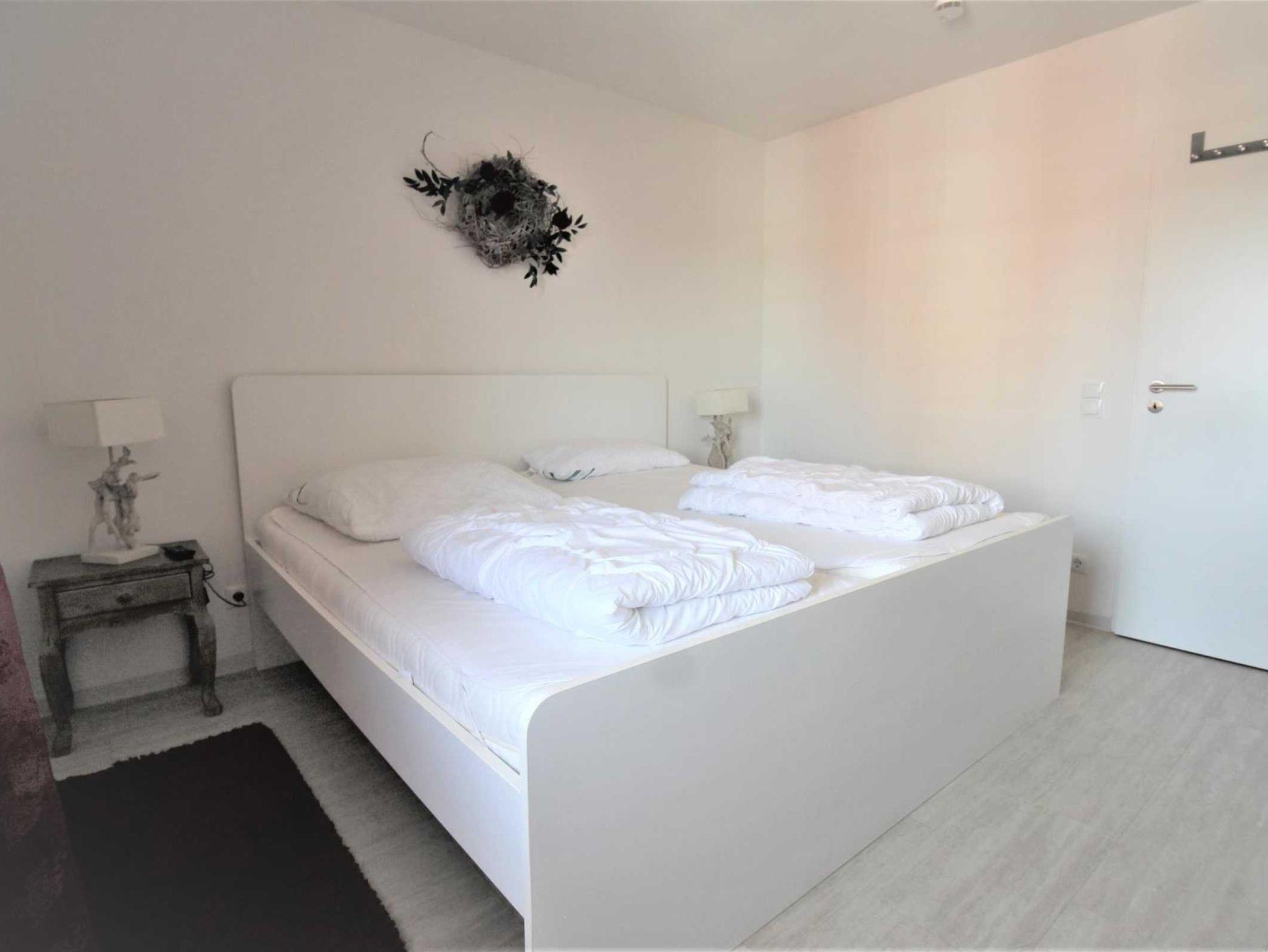 Das Schlafzimmer ist mit einem 200 cm x 200 cm großen Bett ausgestattet, von dem Sie gleich nach dem Aufwachen einen kleinen feinen Blick auf das Wattenmeer genießen. Die Einrichtung ist vom Tischler gefertigt, modern u. romantisch: