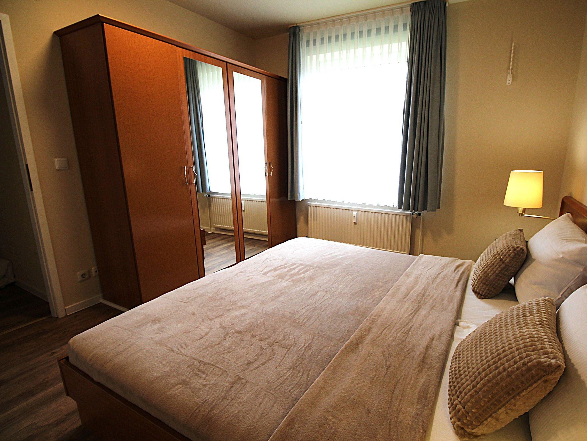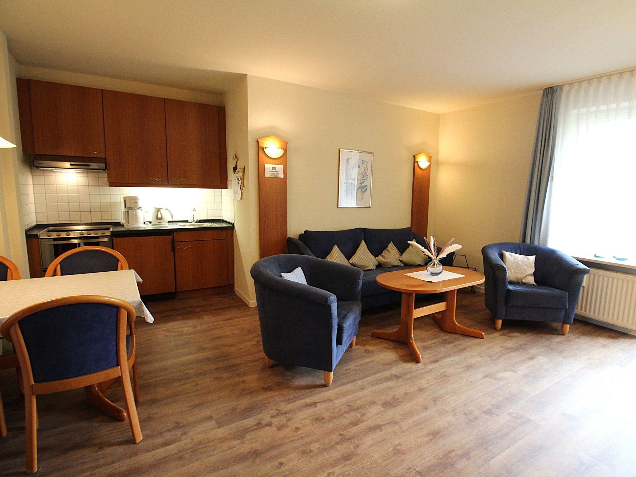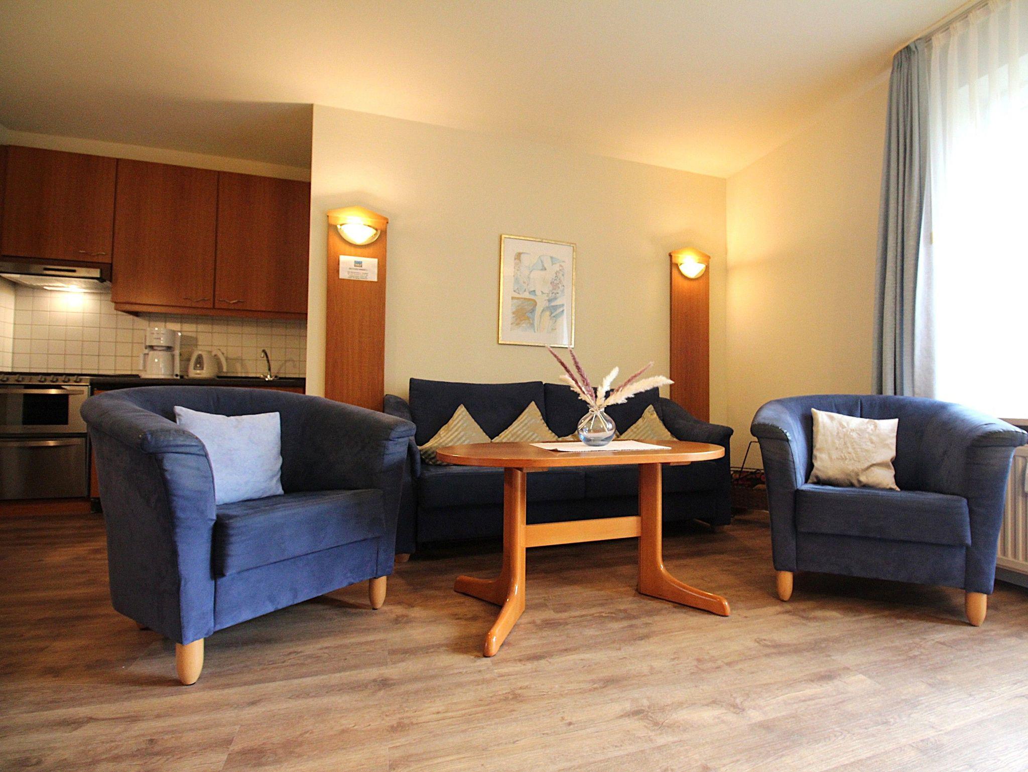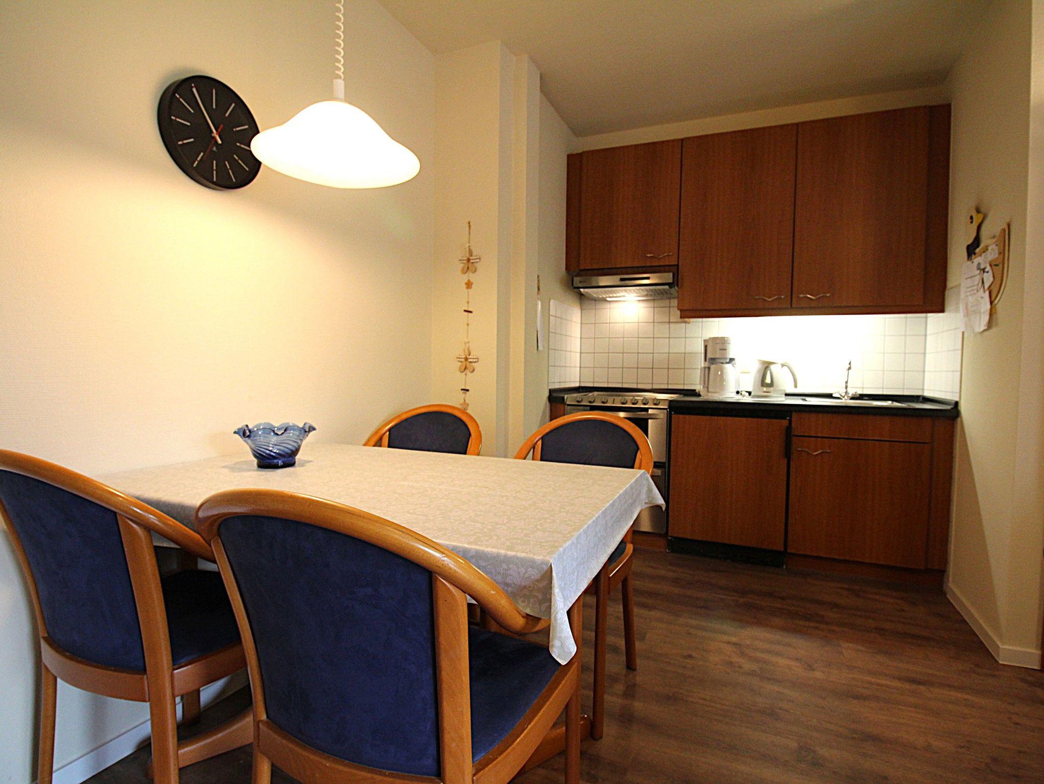 Sie wohnen in einem 2-Zimmer-Appartement für bis zu 4 Personen auf ca. 54 m² im Erdgeschoss. Die Ferienwohnung verfügt über ein Schlafzimmer mit Doppelbett, einen Wohn-/Schlafraum mit Doppelbettcouch, separaten Essplatz, voll ausgestatteten Küchenbereich mit Geschirrspüler, Dusche/WC, Terrasse, SAT-LCD-TV, Telefon.