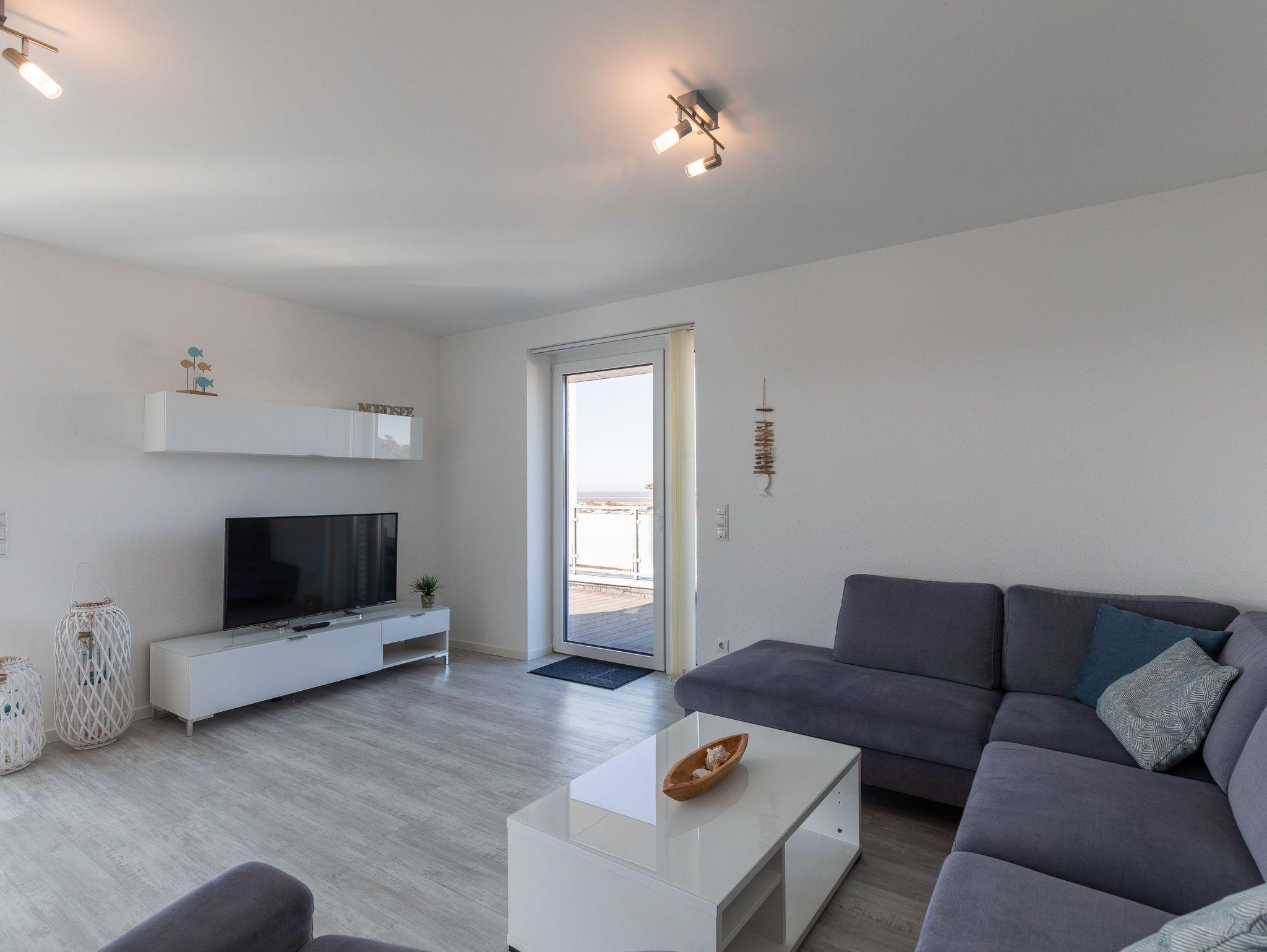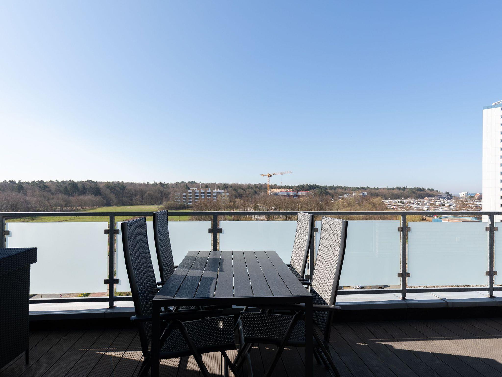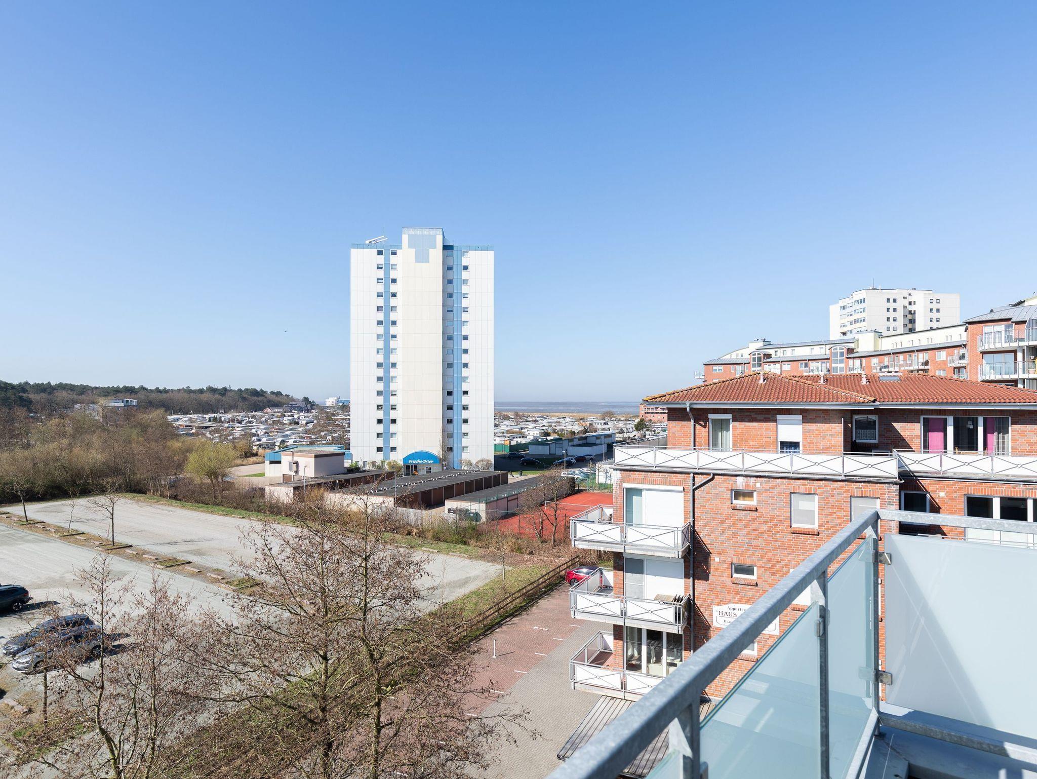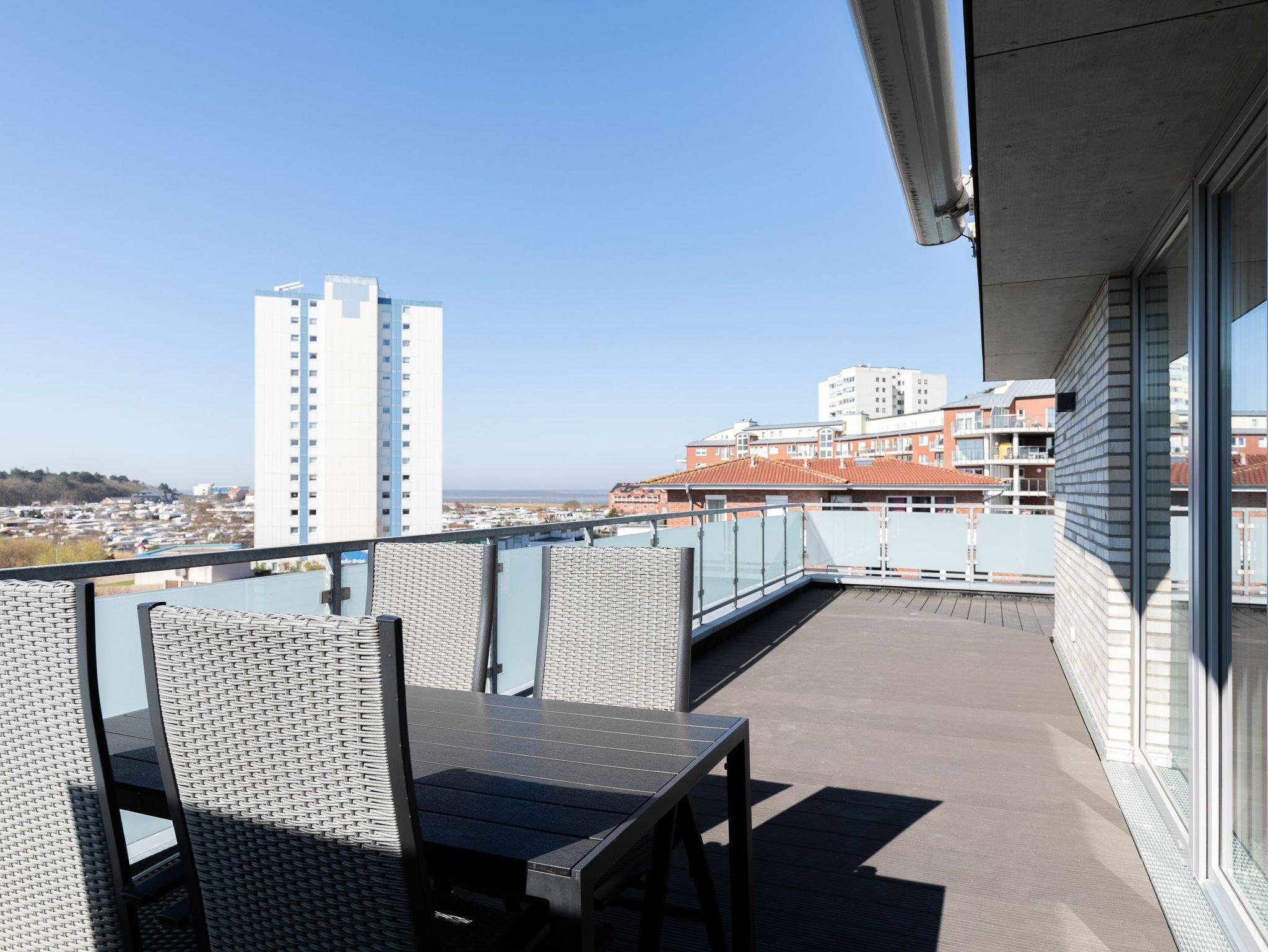 Moderne 3 Zimmer Penthouse Wohnung im 3. Obergeschoss für bis zu 4 Personen, 1 Schlafzimmer mit Doppelbett, TV und Zugang zur großen Dachterrasse, 1 Schlafzimmer mit 2 Einzelbetten, TV und direktem Zugang zur großen Dachterrasse, Wohnzimmer mit Blick Richtung Werner Wald und Nordsee (teil. Seesicht), Einbauküche (Backofen, Cerankochfeld, Mikrowelle, Kaffeemaschine, Wasserkocher, Toaster, Geschirrspüler), gemütlicher Sitzecke mit Ecksofa, Essplatz, TV und Zugang zur großen Dachterrasse, gegenüber der Schlafzimmer befindet sich ein begehbarer Kleiderschrank mit genug Stauraum für Ihr Gepäck im Urlaub, Bad mit 2 Waschbecken, Dusche, WC, Zugang zur gr0ßen Dachterrasse und eigener Sauna (kostenfrei), Gäste WC, Abstellraum mit Waschmaschine und Trockner (beides kostenfrei), große Dachterrasse mit Blick auf den Wernerwald und Teilseeblick auf die Nordsee, Fahrstuhl im Haus, reservierter PKW Stellplatz, Tiefgarage, Nichtraucherwohnung.
