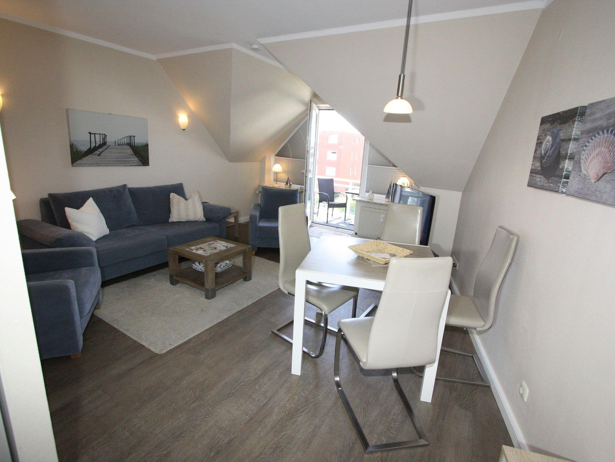 Sie wohnen in einem 2-Zimmer-Appartement für bis zu 4 Personen auf ca. 46 m² im Dachgeschoss. Ein Schlafzimmer mit Doppelbett mit SAT-Flachbild-TV, , Wohn-/Schlafraum mit bequemer Doppelbettcouch, SAT-Flachbild-TV, Laptop und kostenfreien WLAN-Zugang, separater Essplatz, voll ausgestatteter Küchenbereich, Dusche/WC mit Föhn, Balkon und Telefon. PKW-Stellplatz in der Tiefgarage.