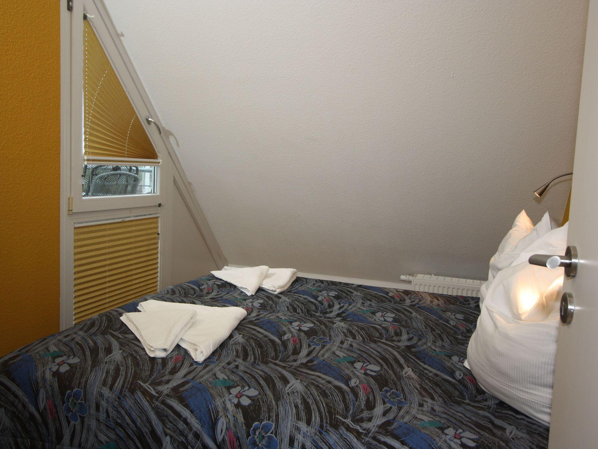Schlafzimmer mit Einzelbett und Unterschubbett. Duschbad und große Sonnenterrasse.
